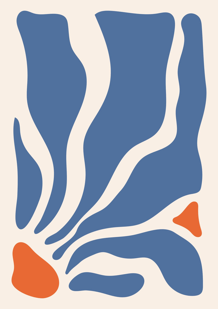 The "Blue Flower Impression" poster is a striking graphic illustration featuring flowing blue shapes reminiscent of petals, contrasted by bold orange accents. The organic cutout design evokes a sense of natural beauty and abstract form, perfect for enhancing modern interiors. A compelling addition for those seeking floral-themed art prints with a contemporary flair.