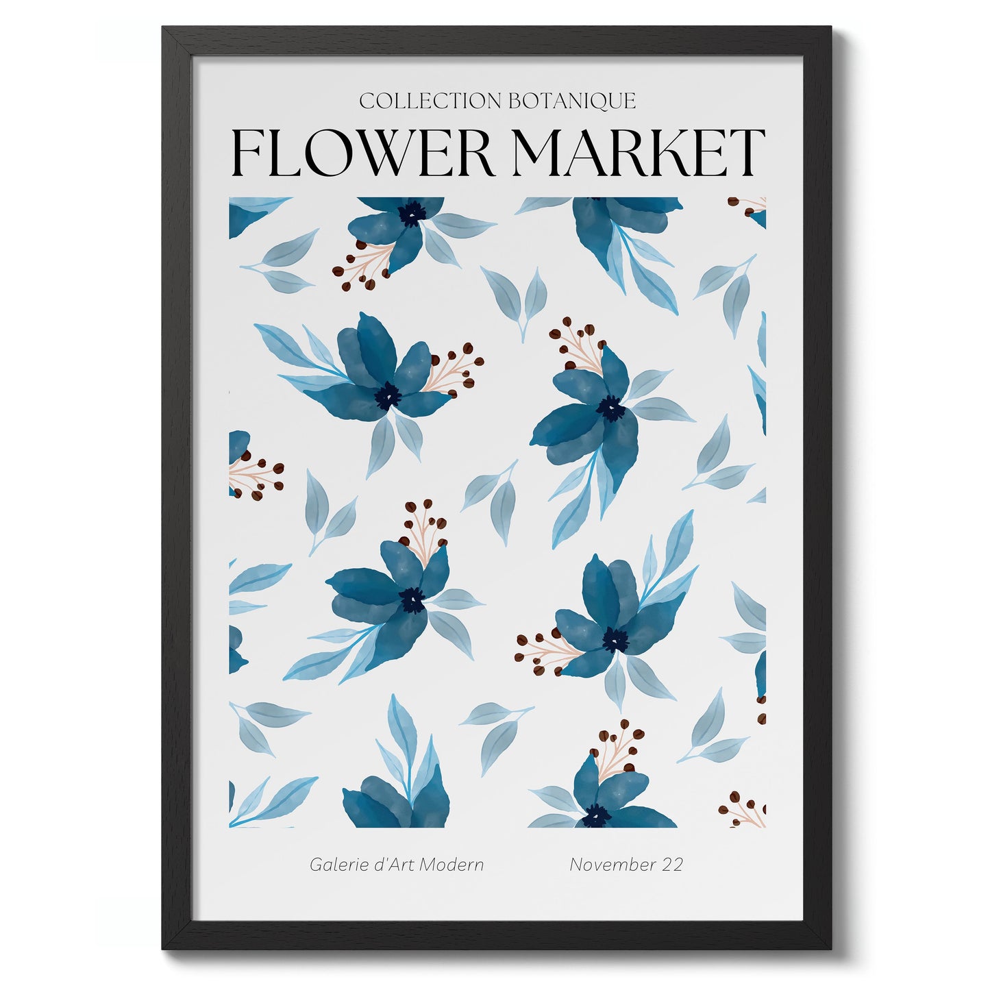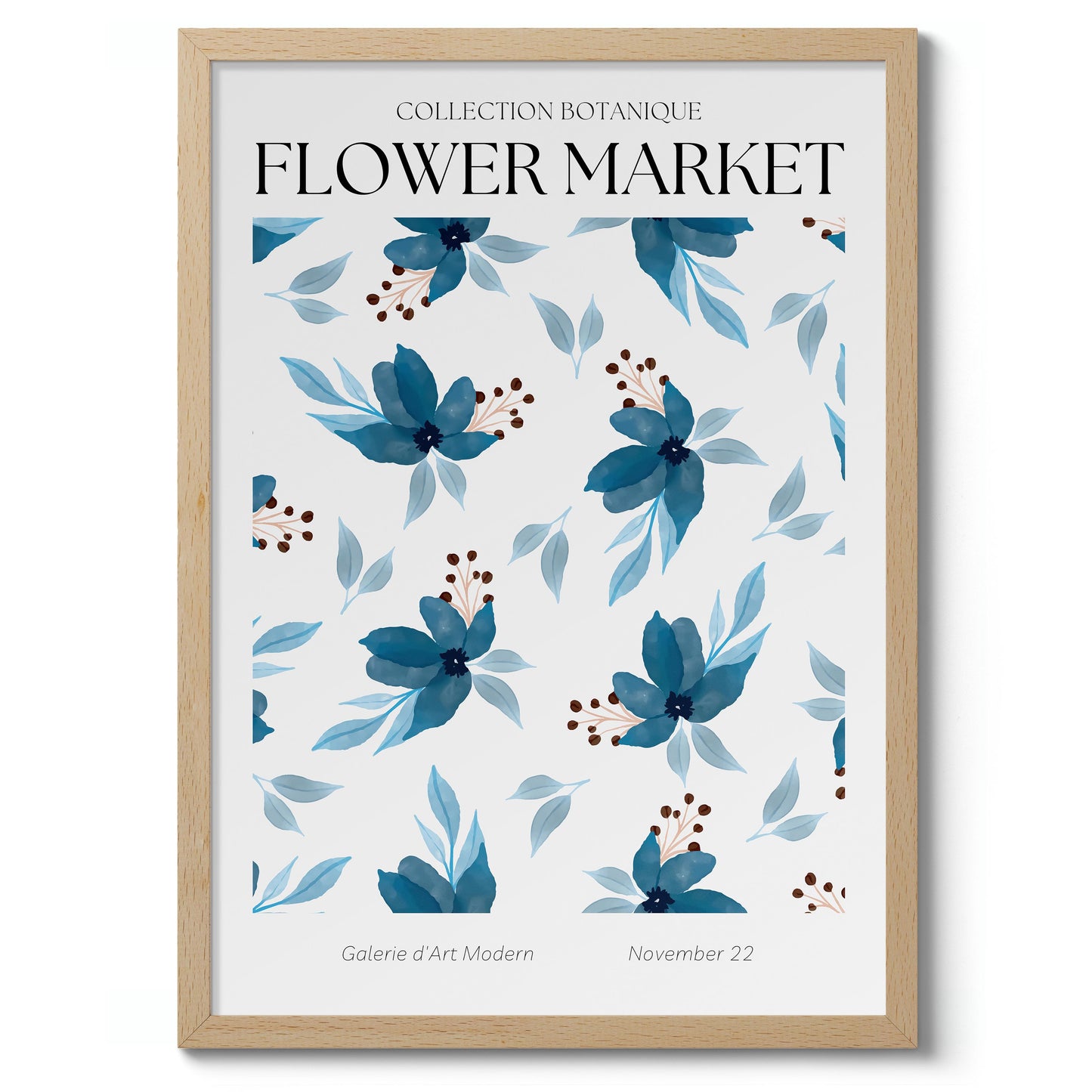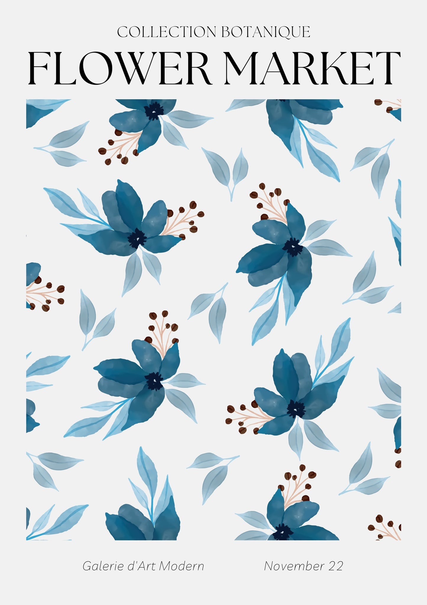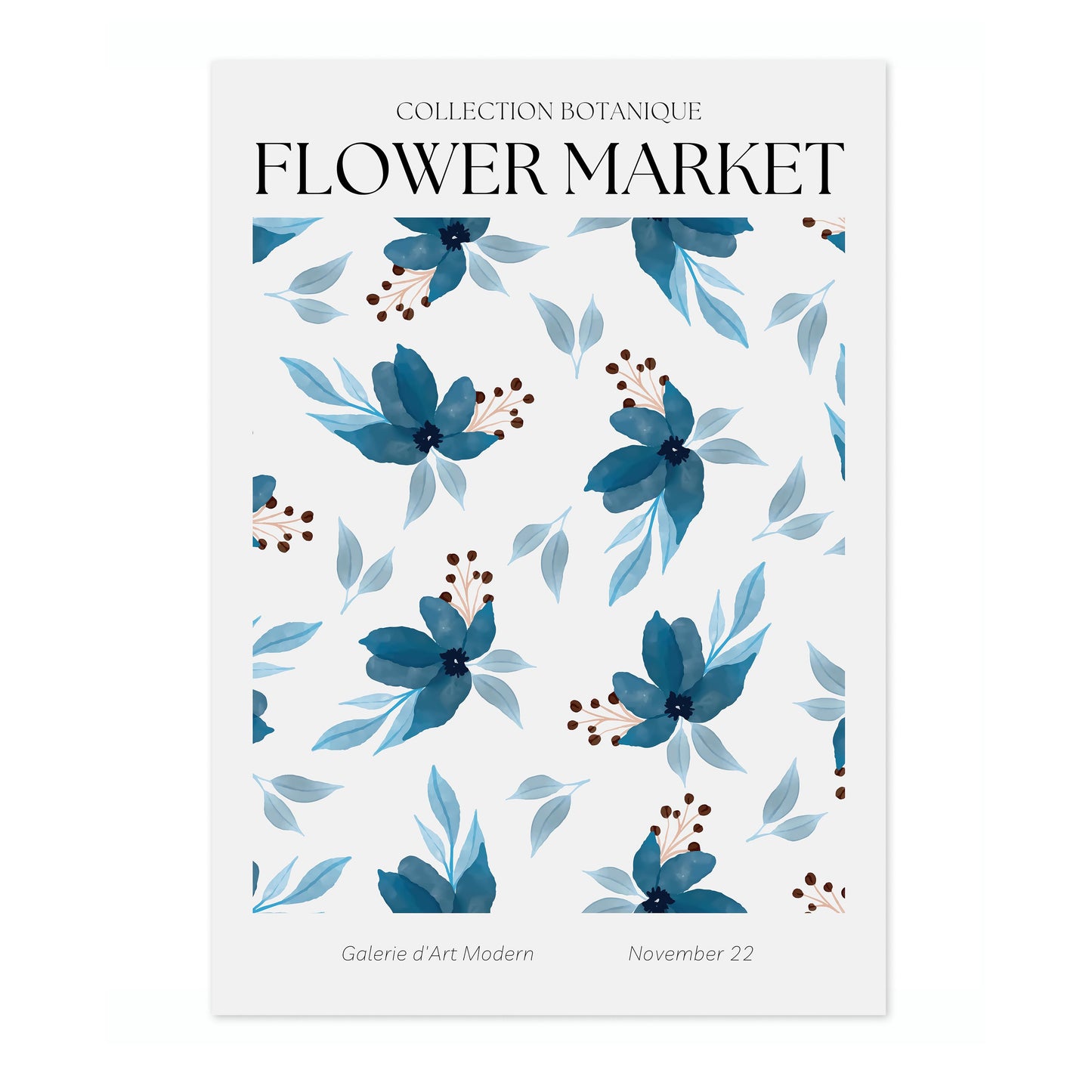 The "Blue Flower Market" poster features a modern illustration of blue flowers and leaves against a white background. This exhibition-style art print captures the essence of nature with its botanical theme, making it a perfect addition to any contemporary space. Ideal for flower and nature enthusiasts, it brings a touch of greenery indoors through a clean, minimalist design.