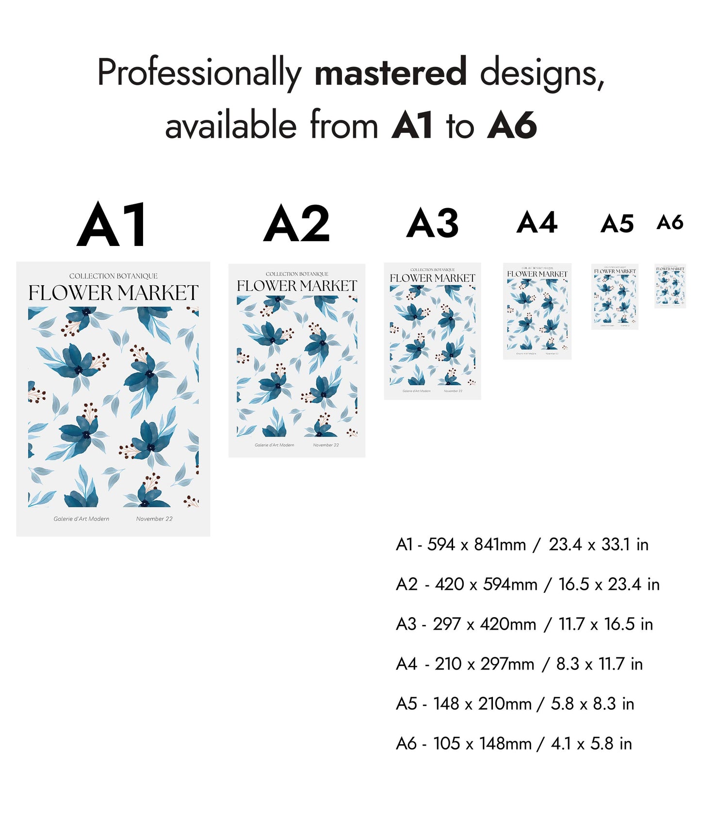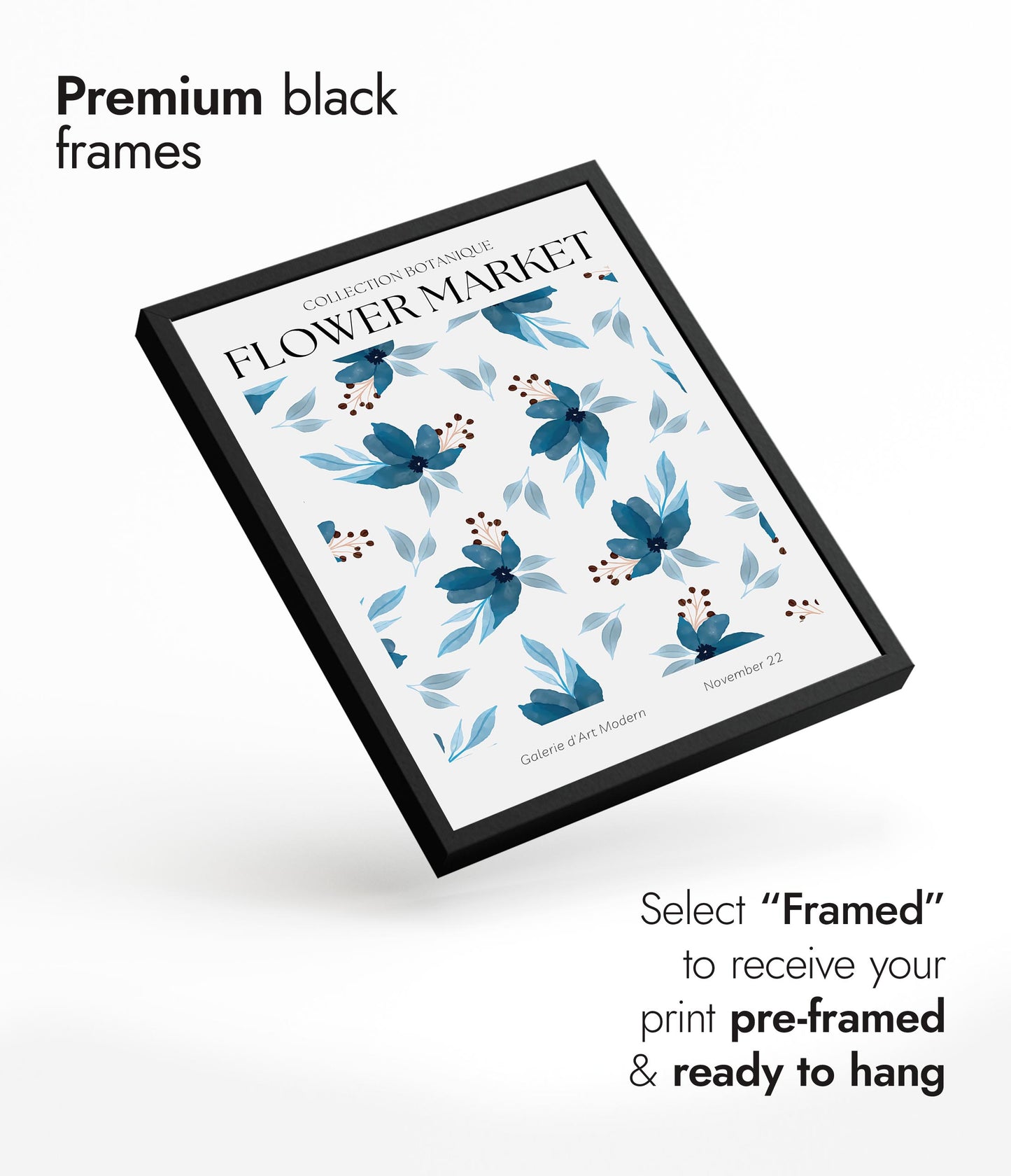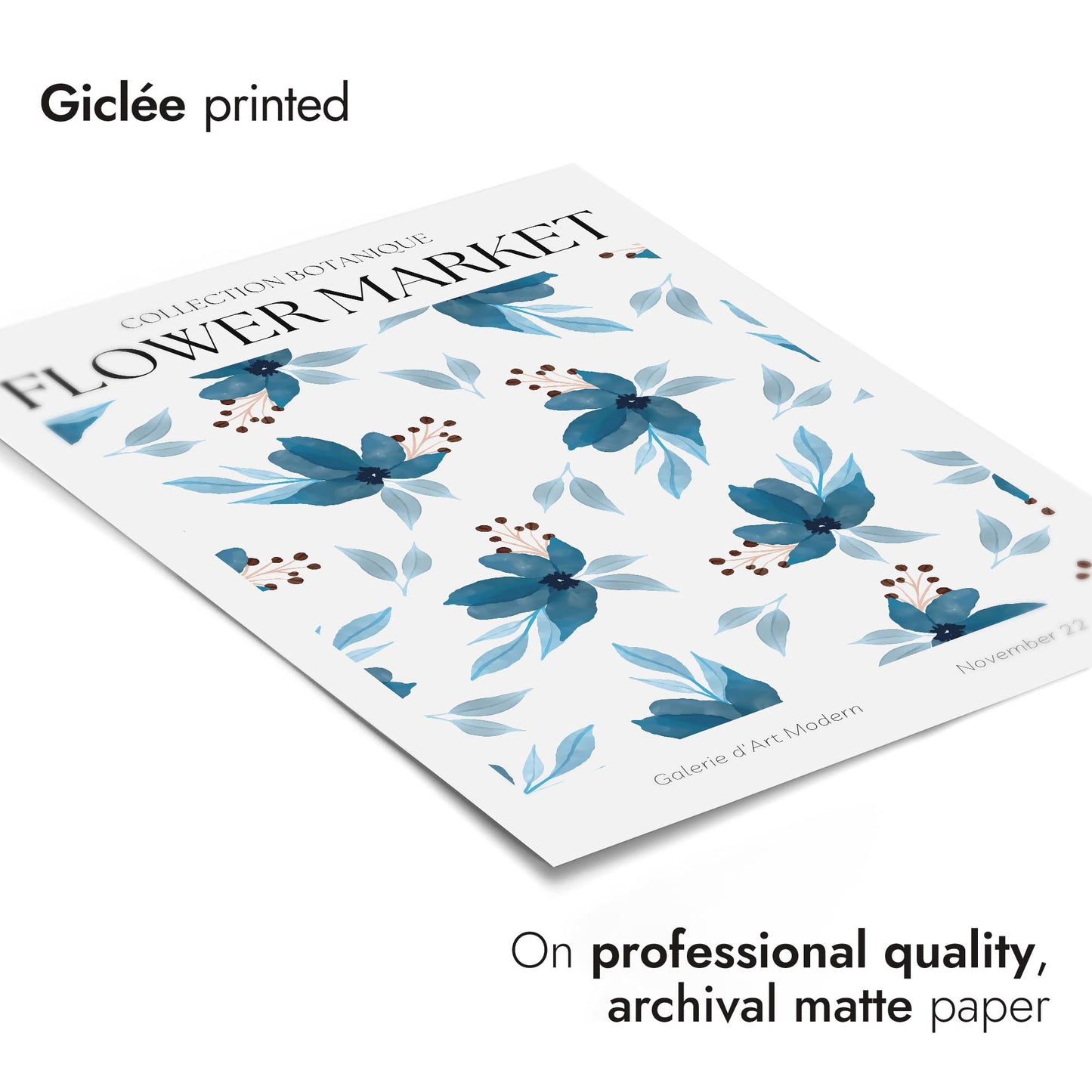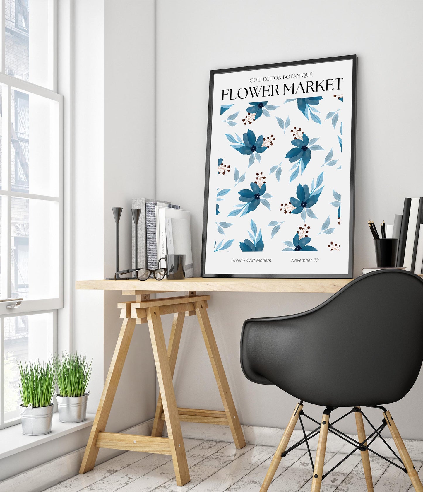 The "Blue Flower Market" poster features a modern illustration of blue flowers and leaves against a white background. This exhibition-style art print captures the essence of nature with its botanical theme, making it a perfect addition to any contemporary space. Ideal for flower and nature enthusiasts, it brings a touch of greenery indoors through a clean, minimalist design.