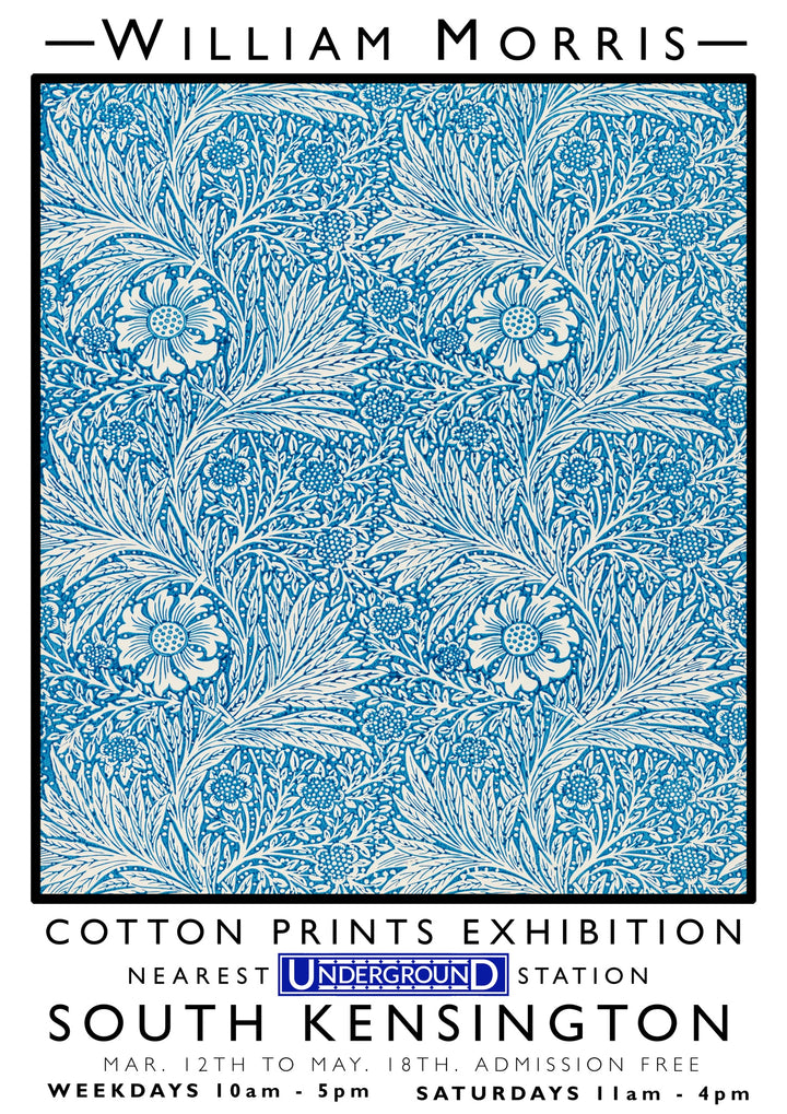"Blue Marigolds" poster by William Morris features a vintage-inspired graphic design showcasing intricate blue floral patterns reminiscent of classic textile art. Highlighting marigold flowers against a detailed botanical backdrop, this exhibition-themed artwork evokes the elegance of Morris's signature style. Ideal for lovers of historical and floral designs, this poster captures the essence of graphic and vintage art.