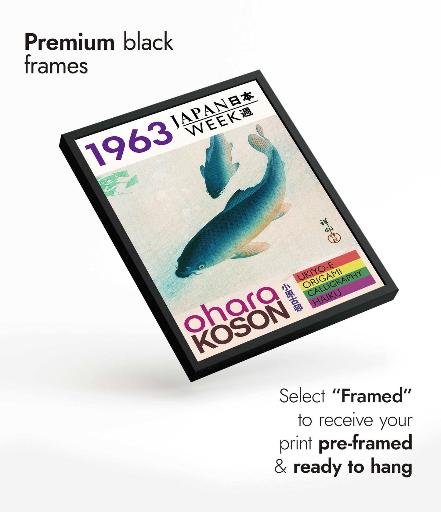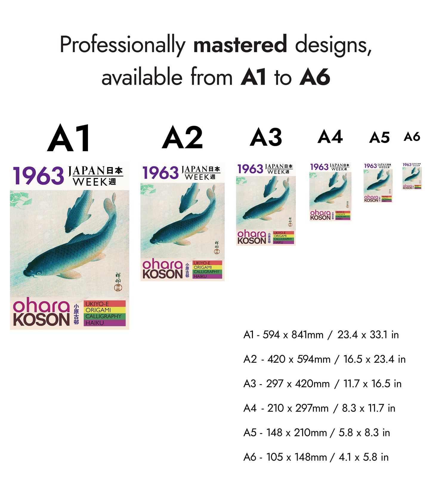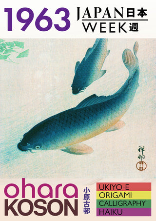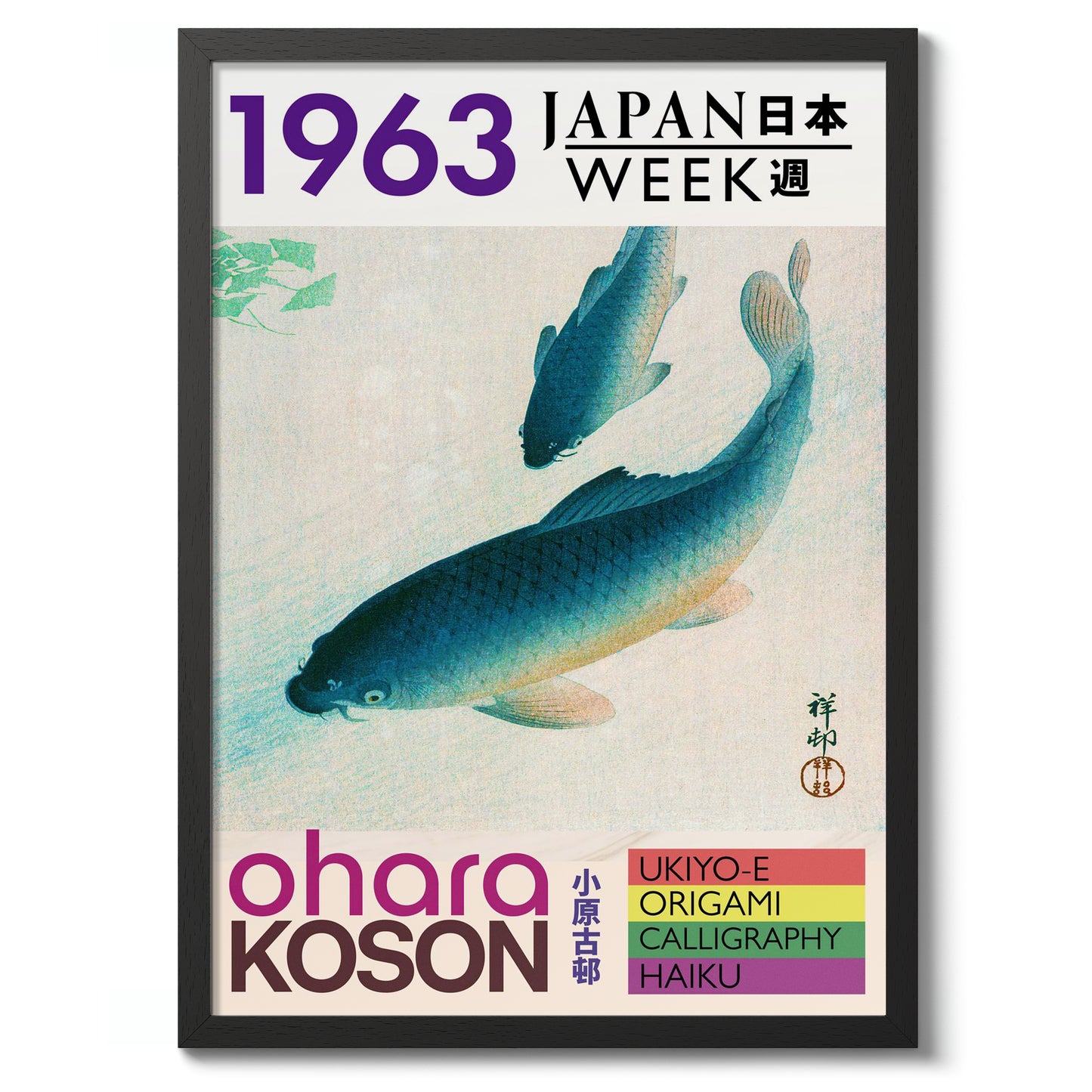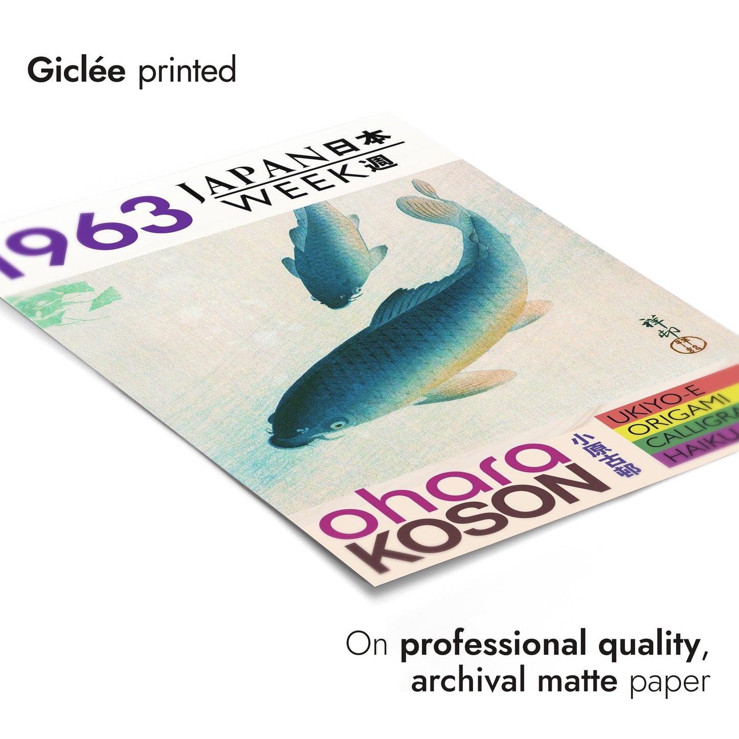 This poster showcases Ohara Koson's "Blue Koi Fish," an exquisite traditional woodblock illustration. Featuring two koi swimming gracefully against a serene beige and green background, this artwork captures the essence of Japanese Ukiyo-E style. Highlighted in an exhibition for Japan Week 1963, it perfectly embodies themes of water and tranquility, making it an ideal piece for lovers of Japanese art.