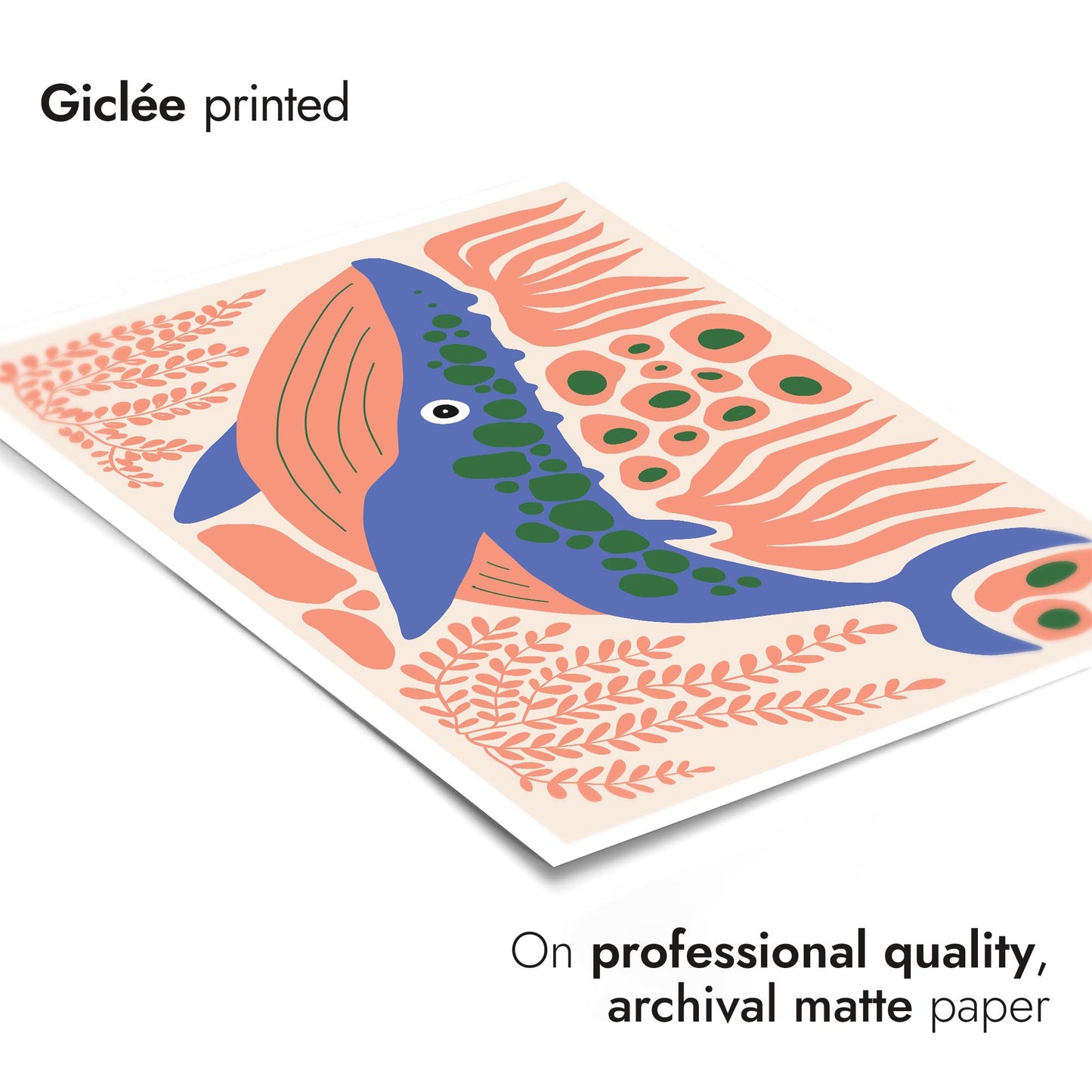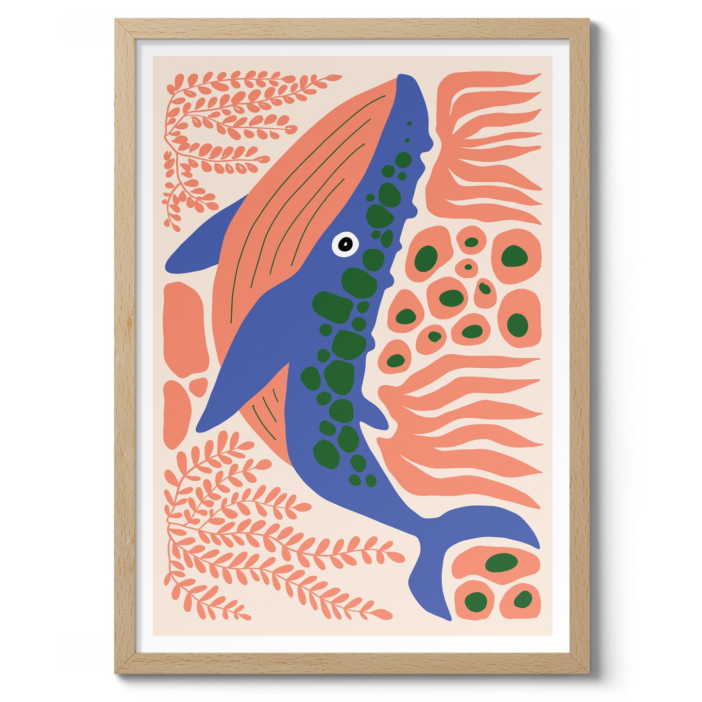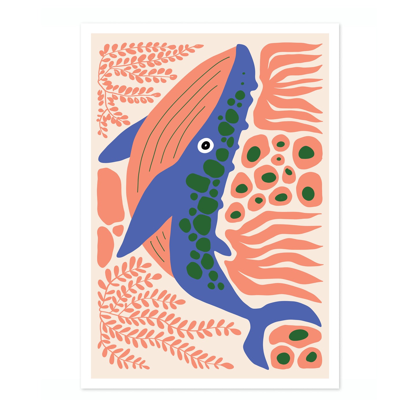 This captivating "Blue Whale" poster features a vibrant collage-style portrait of a blue whale set against a peach background. Accented with green and coral motifs, the graphic design exudes a playful and cute aesthetic, perfect for a nursery. The whimsical sea-themed artwork brings a cheerful touch to any child's room decor.
