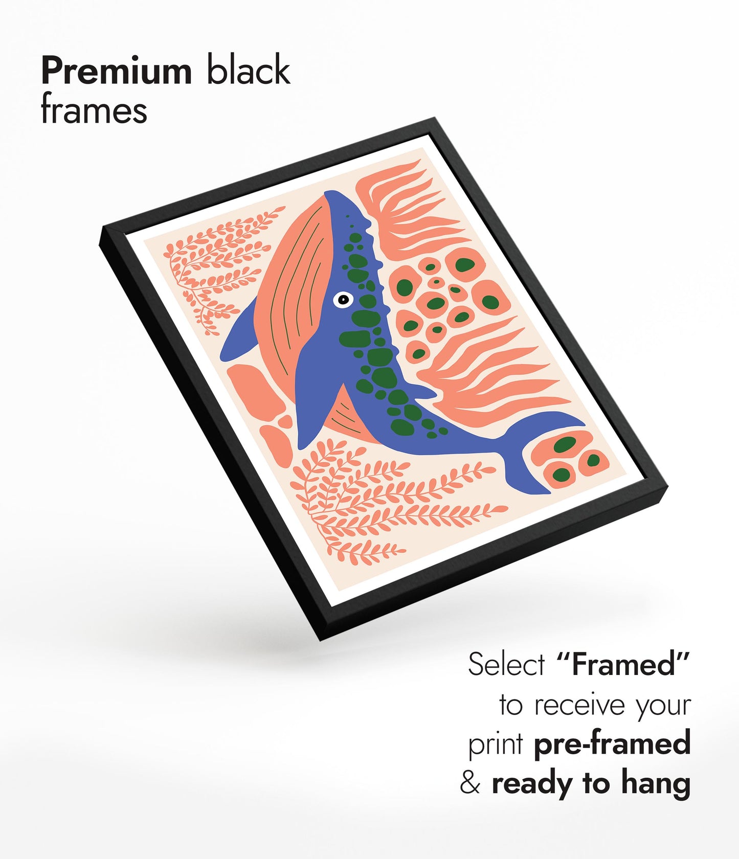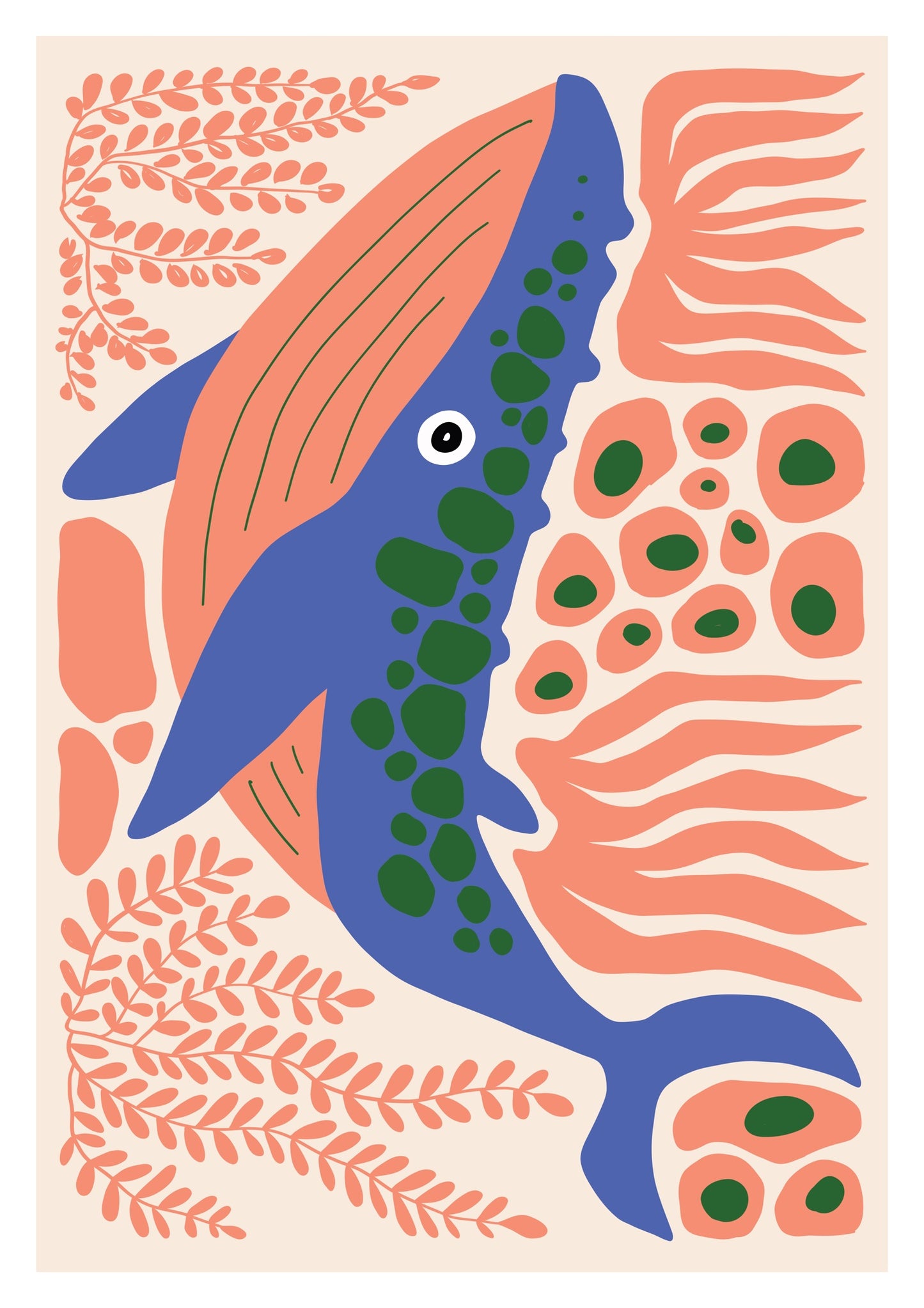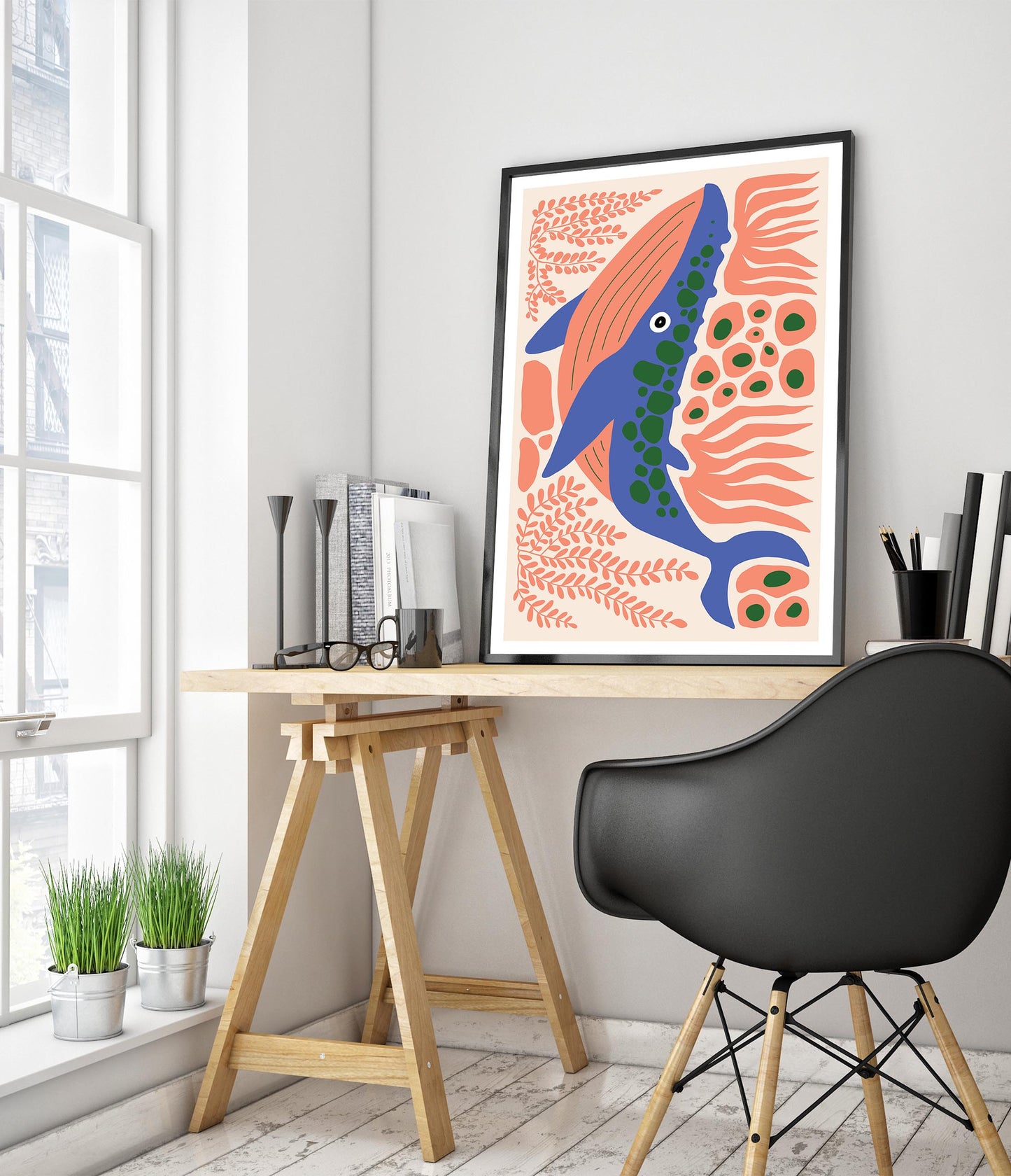 This captivating "Blue Whale" poster features a vibrant collage-style portrait of a blue whale set against a peach background. Accented with green and coral motifs, the graphic design exudes a playful and cute aesthetic, perfect for a nursery. The whimsical sea-themed artwork brings a cheerful touch to any child's room decor.