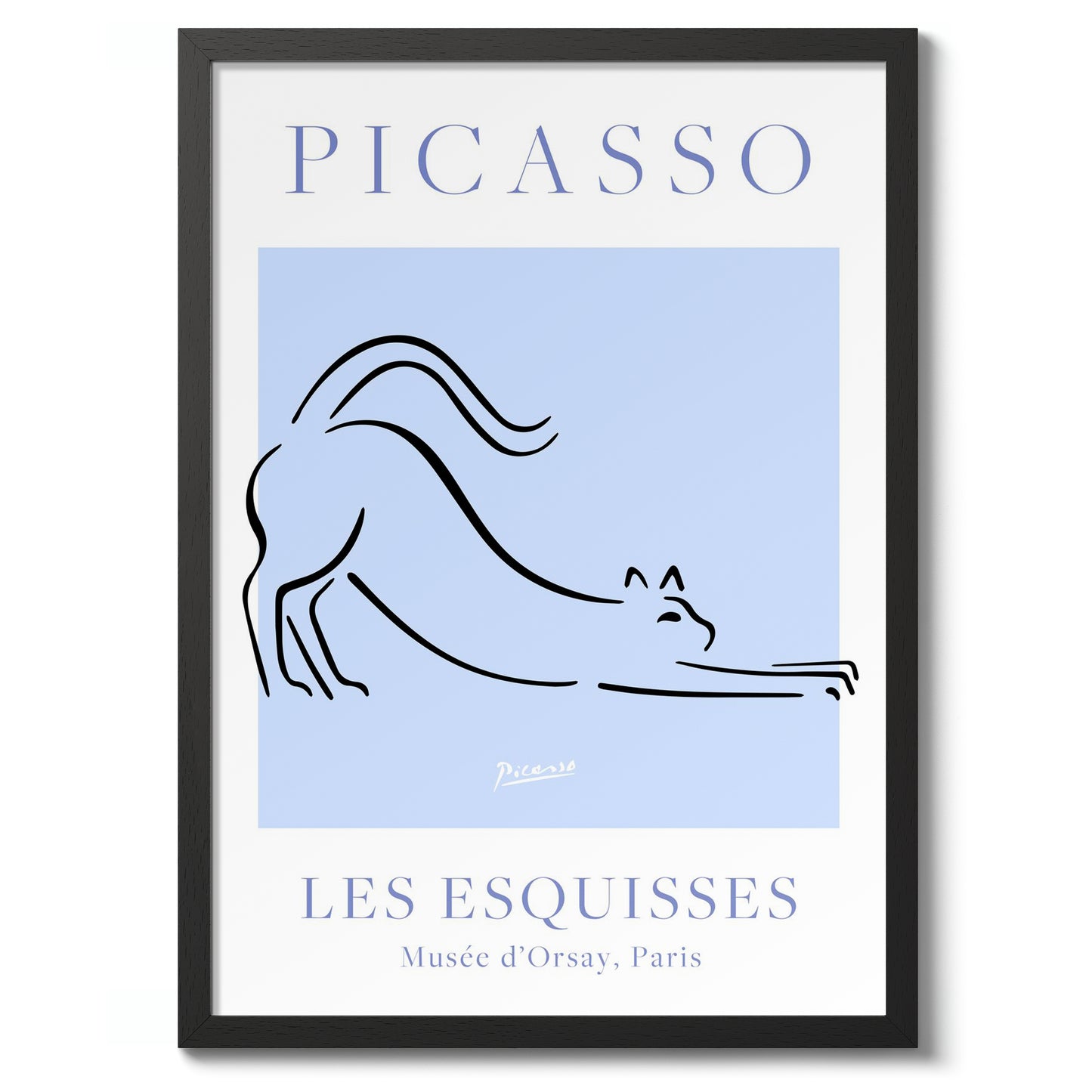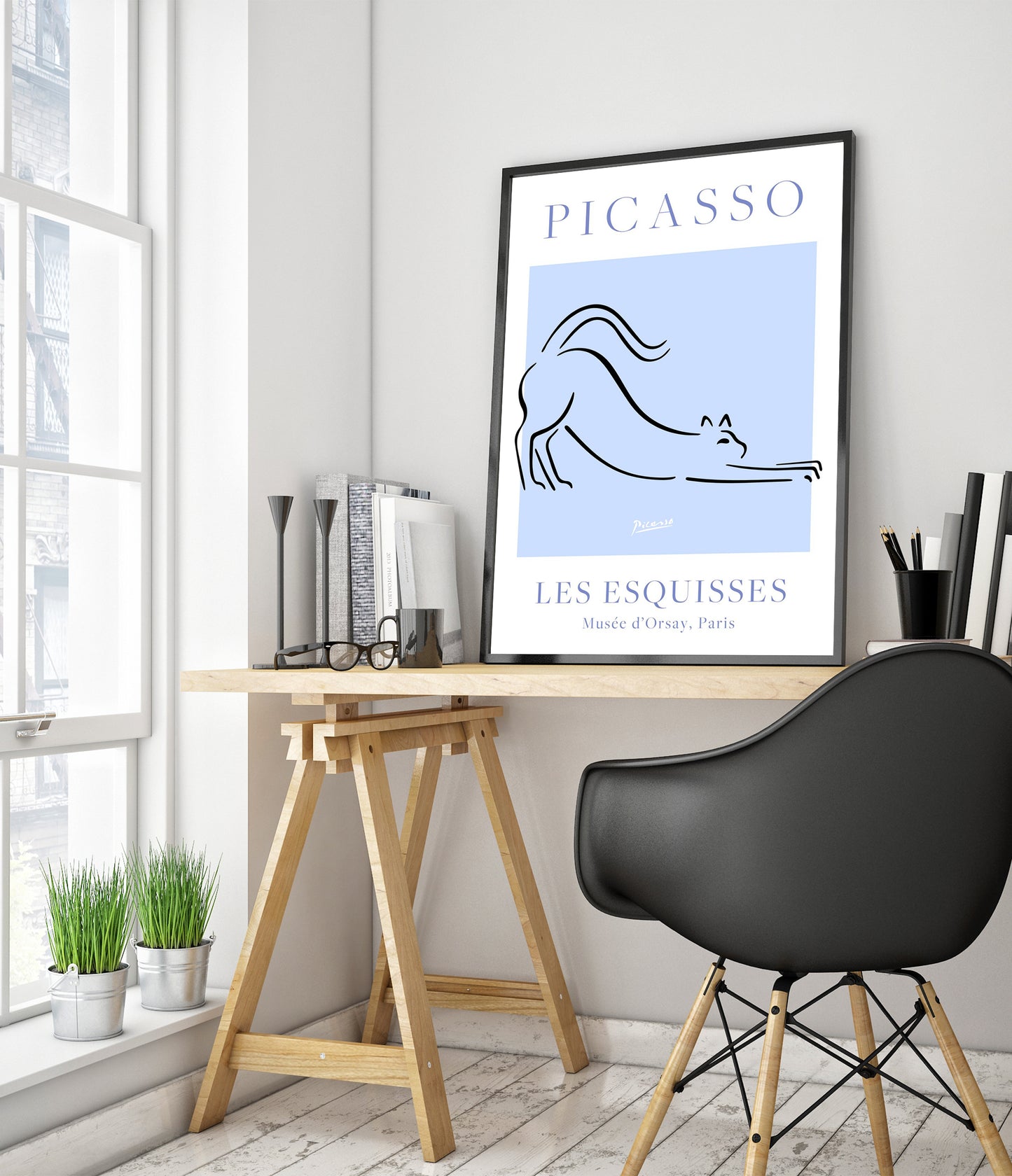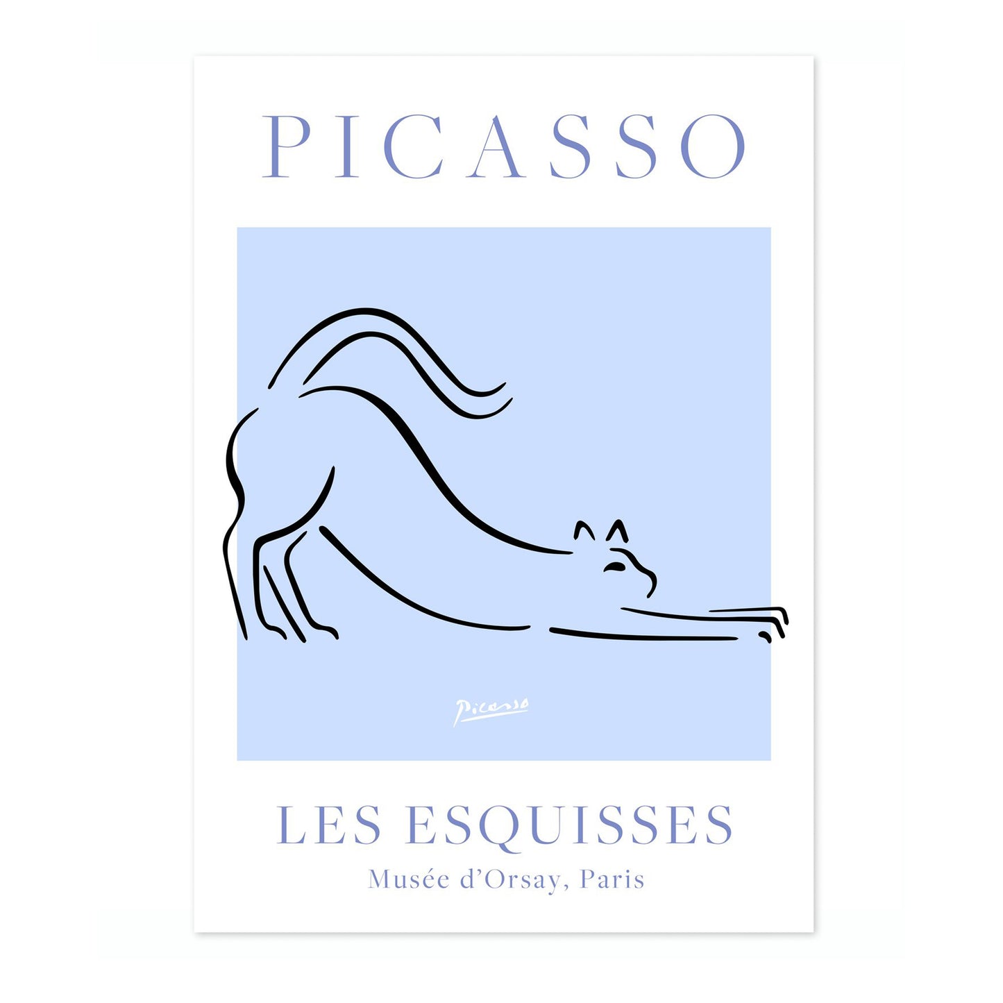 This minimalist poster showcases Pablo Picasso's iconic line art with a playful cat stretching. Rendered in simple curves against a soothing blue backdrop, the illustration captures the elegance of feline movement and Picasso's masterful simplicity. The artwork’s title, "Les Esquisses," adds a touch of sophistication, making it a timeless piece for any art enthusiast. Perfect for cat and line art lovers alike.