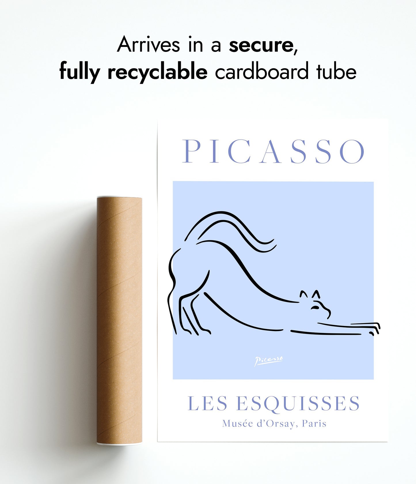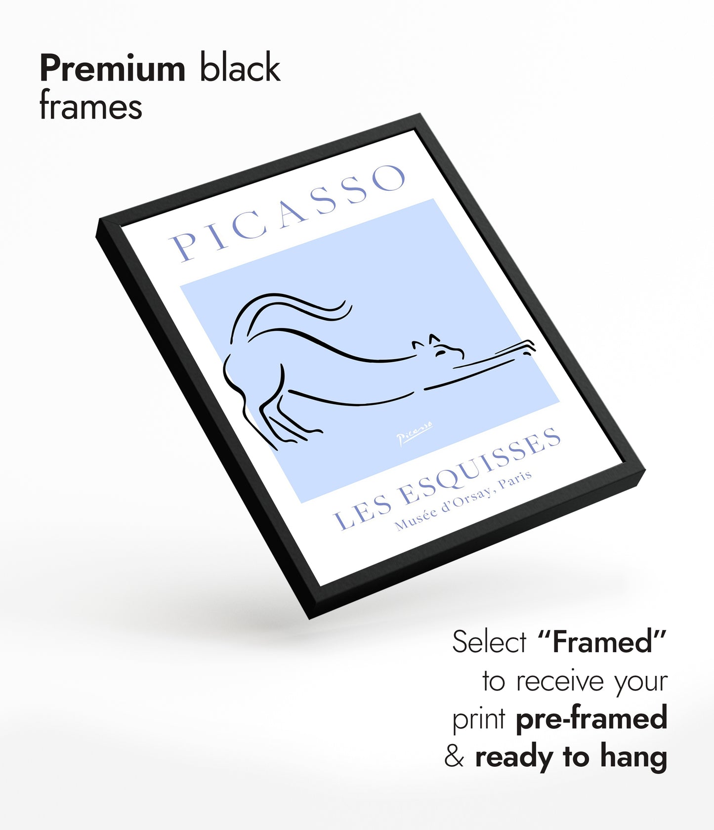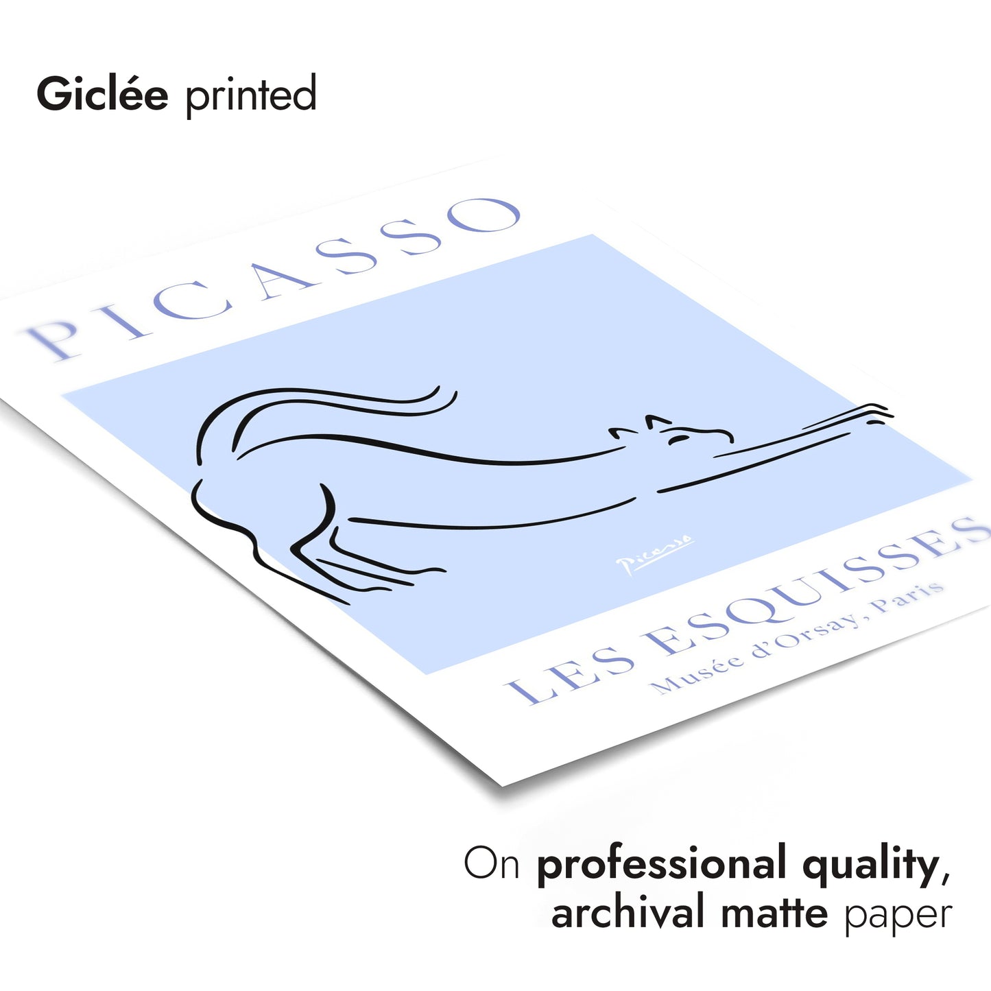 This minimalist poster showcases Pablo Picasso's iconic line art with a playful cat stretching. Rendered in simple curves against a soothing blue backdrop, the illustration captures the elegance of feline movement and Picasso's masterful simplicity. The artwork’s title, "Les Esquisses," adds a touch of sophistication, making it a timeless piece for any art enthusiast. Perfect for cat and line art lovers alike.