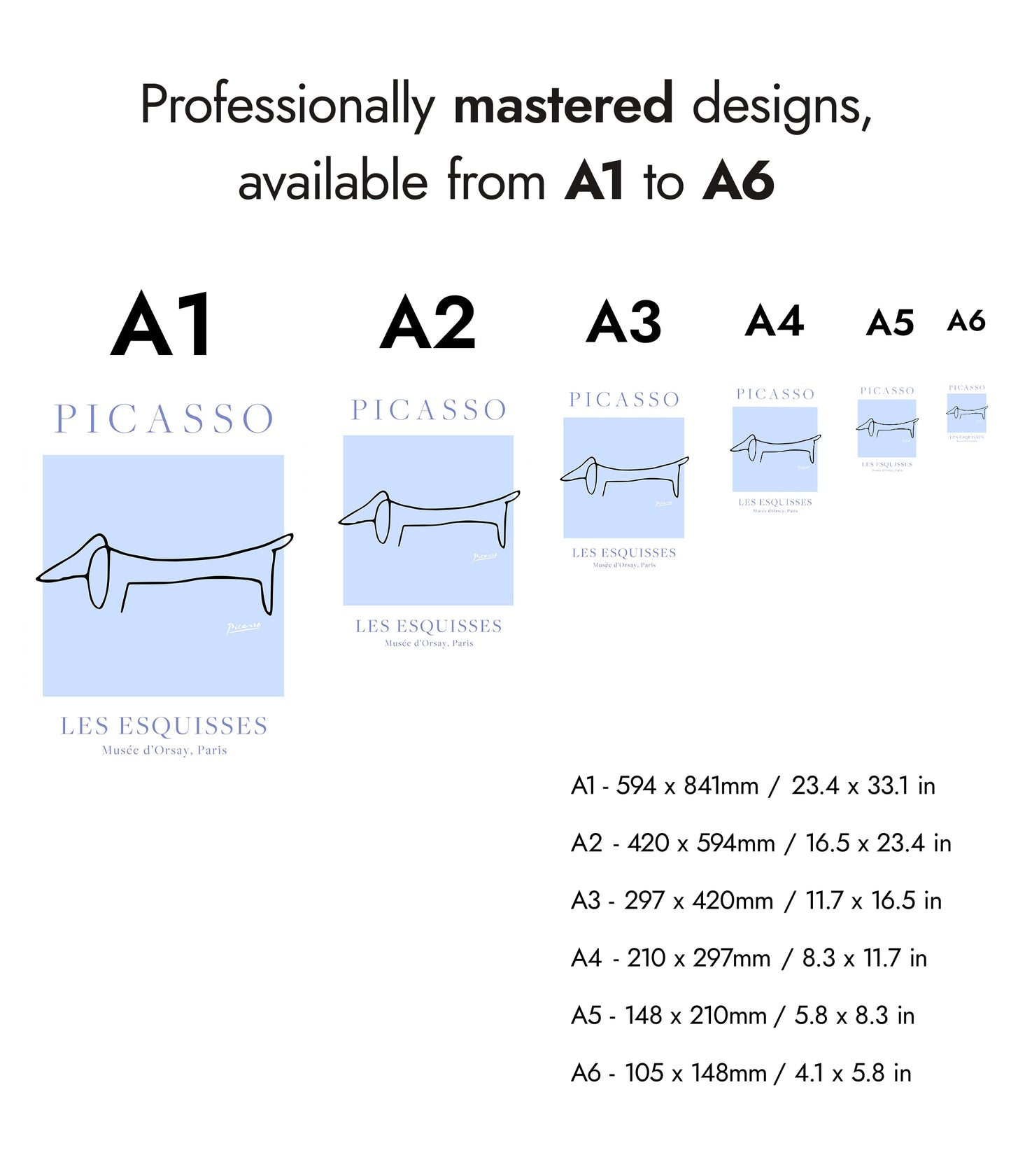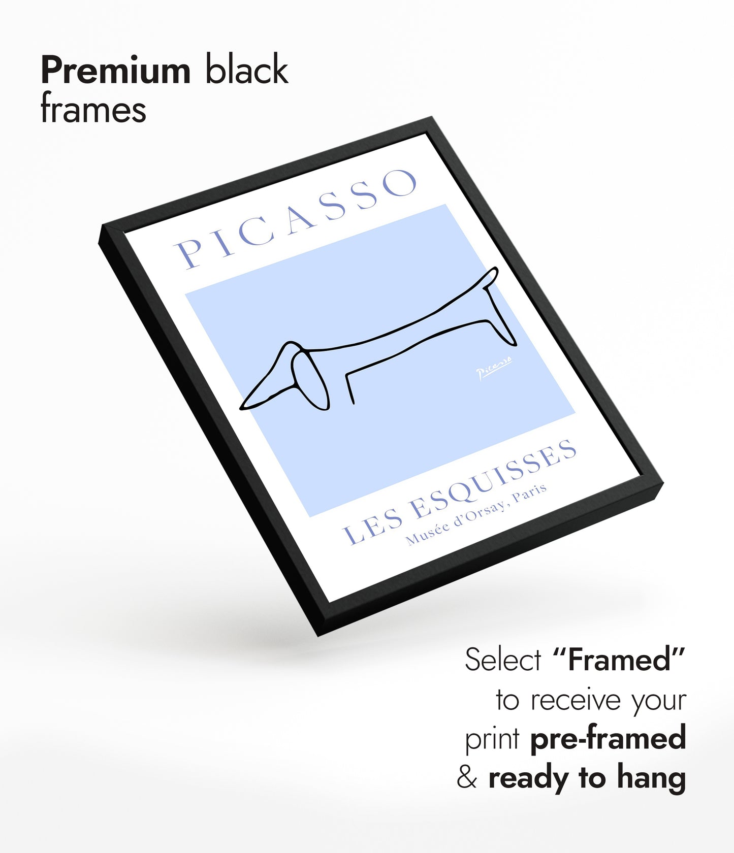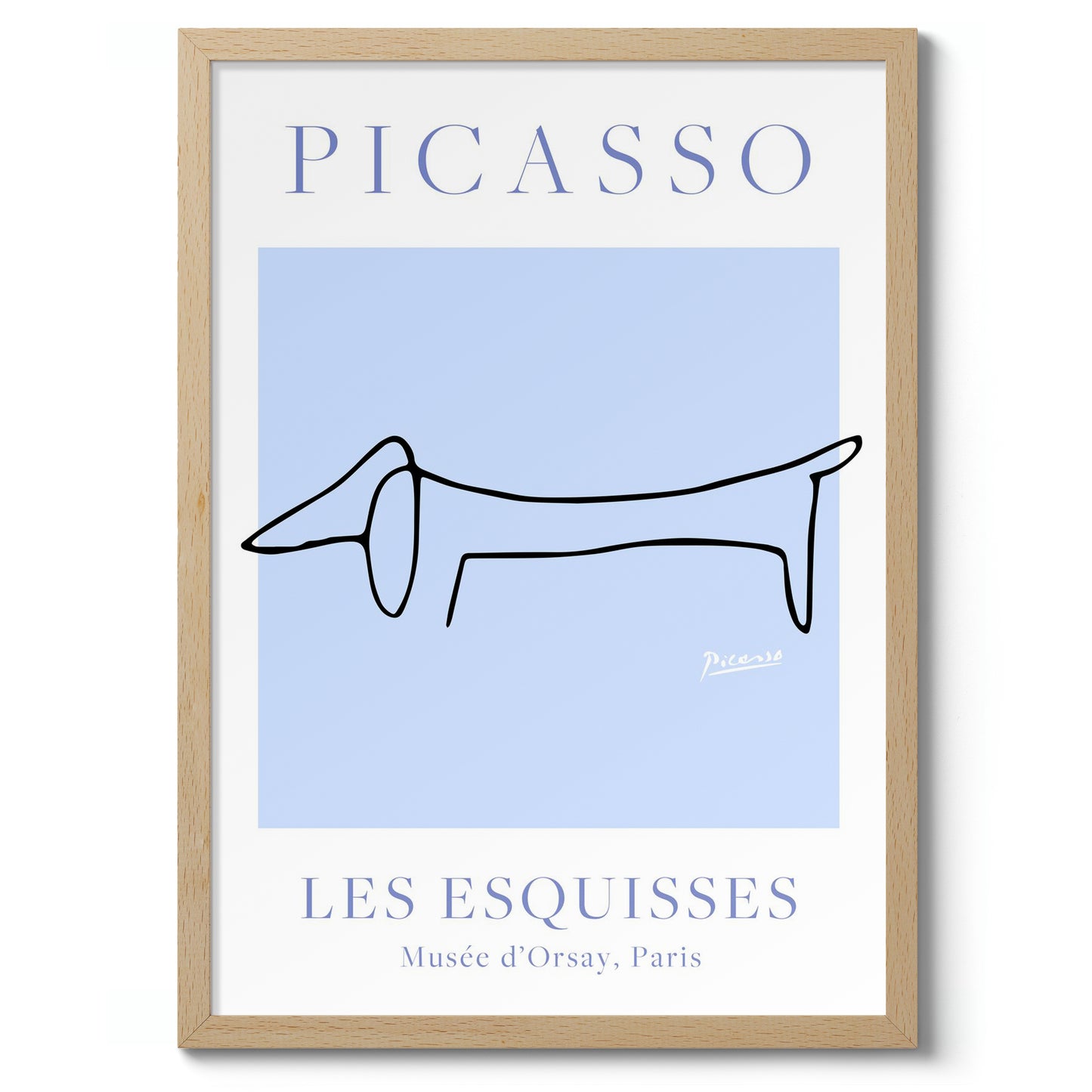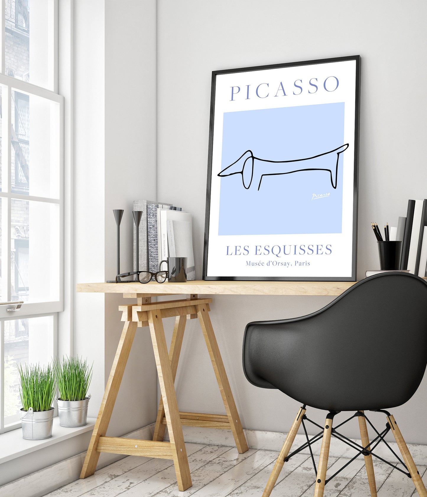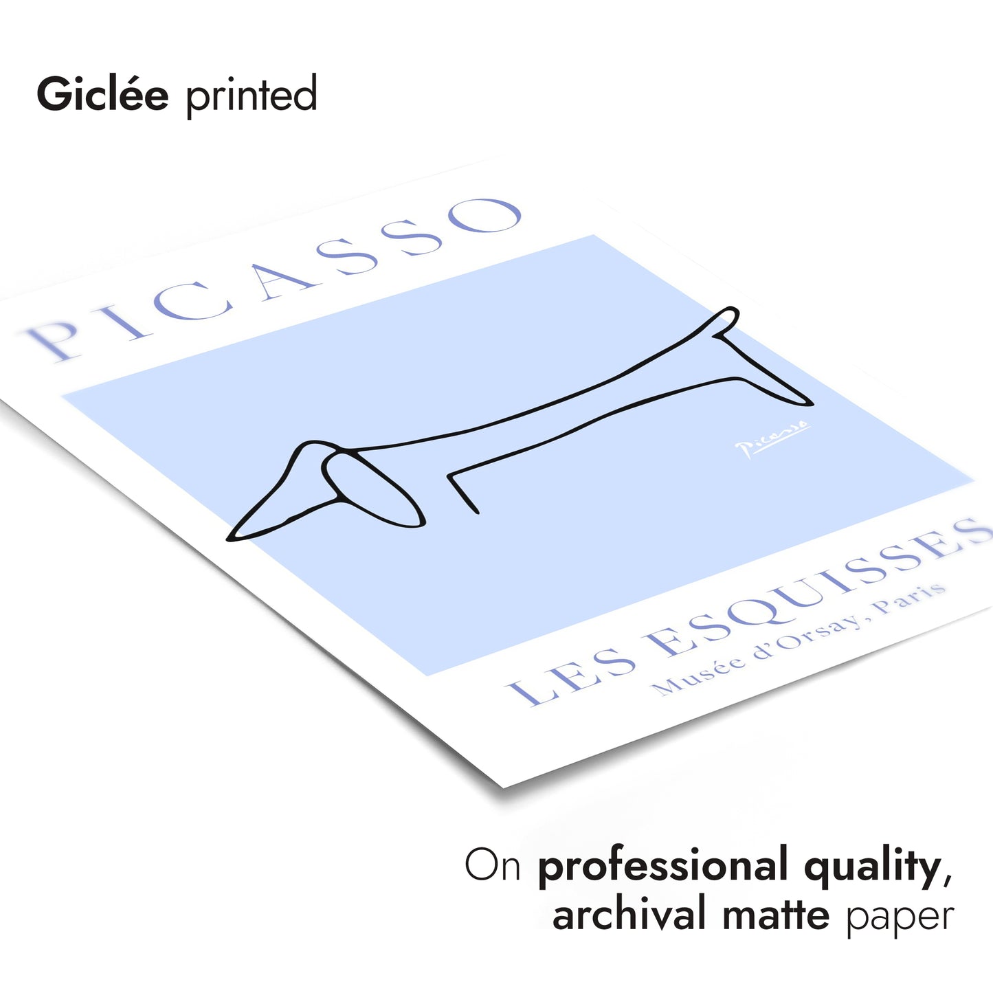 The "Blue & White Dog" poster showcases Picasso's minimalist line art, elegantly depicting a dachshund. Rendered in striking black lines against a soft blue backdrop, this piece exudes simplicity and sophistication. Perfect for fans of Picasso and those drawn to minimalist art, it captures the essence of the artist's playful yet profound approach to animal subjects.