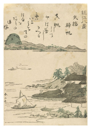 "Boats Returning to Yabase" is a traditional Japanese woodblock print by Katsukawa Shunzan. This ukiyo-e poster illustrates a serene lakeside scene with boats gently sailing under a tranquil sky. The village and distant mountains crafted in delicate lines evoke a timeless, peaceful ambiance, capturing a quintessential moment of Japanese landscape artistry. Perfect for those appreciating fine, historical marine illustrations.