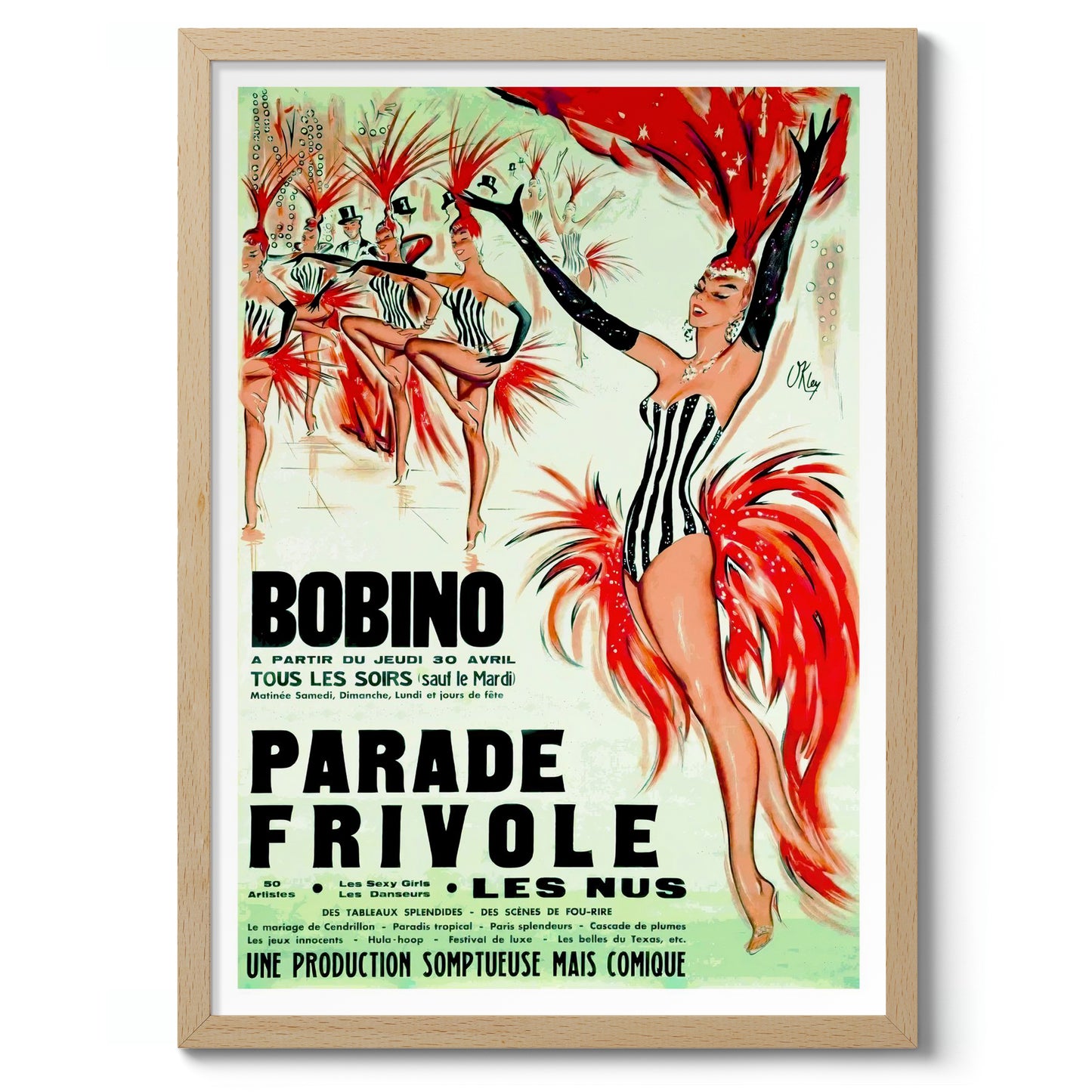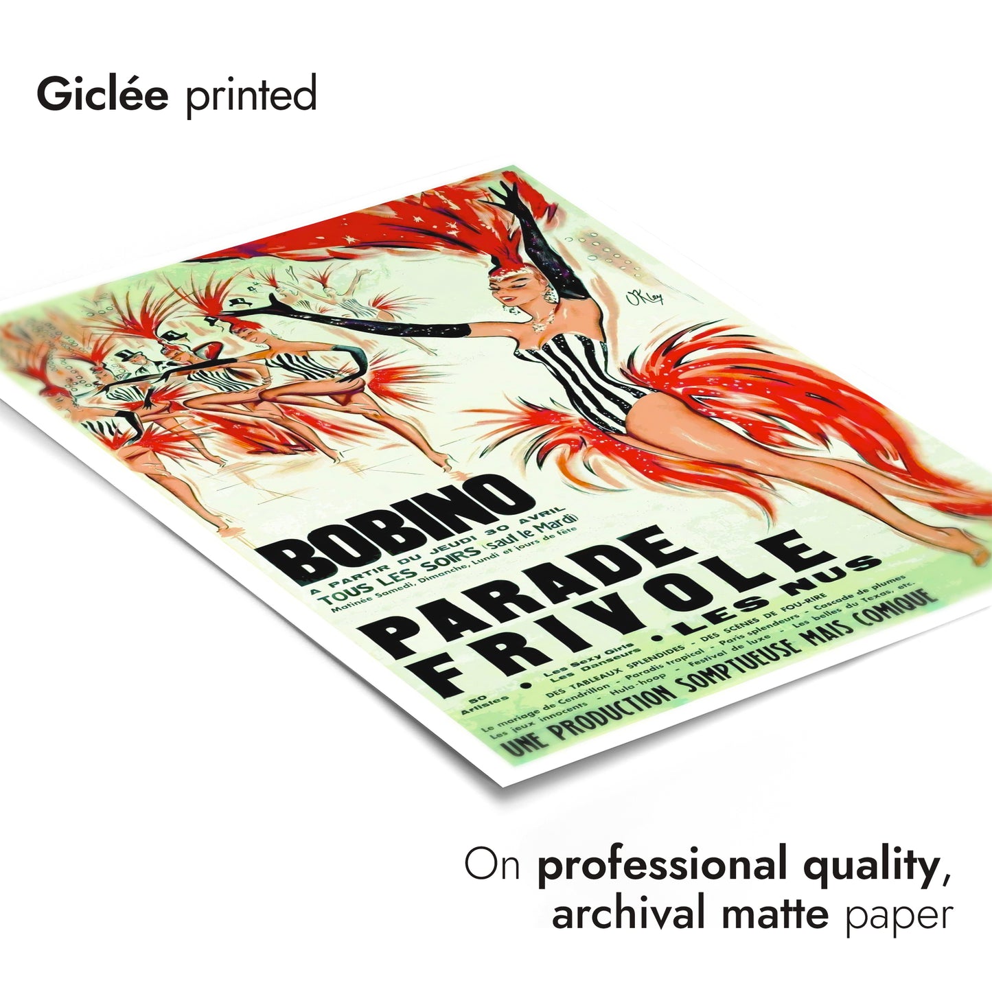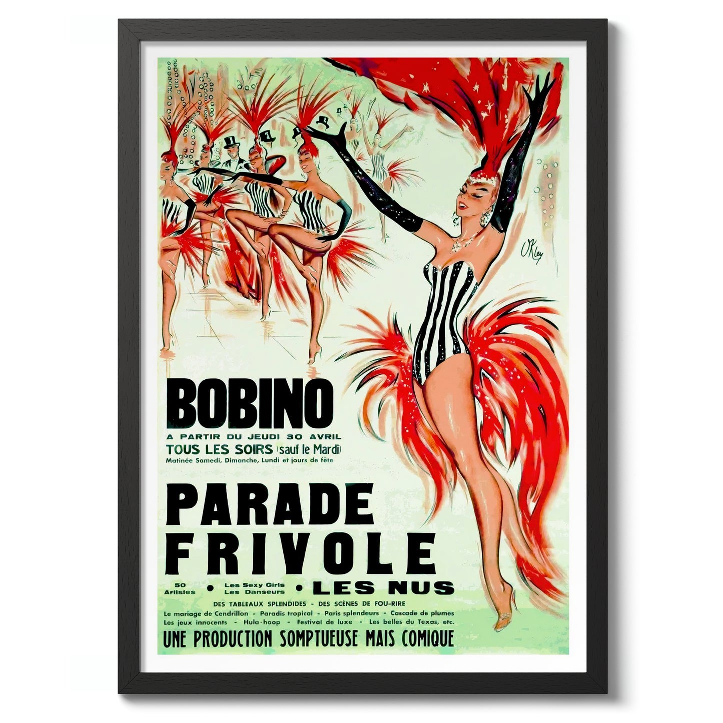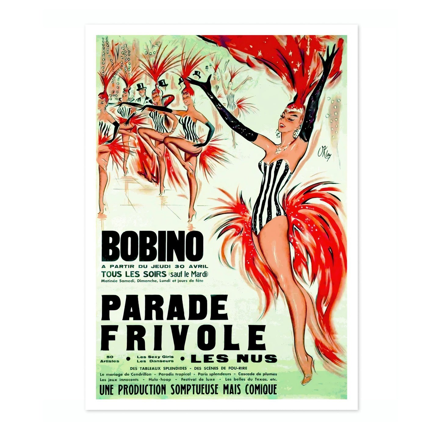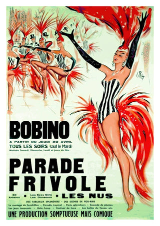 The "Bobino, Parade Frivole" poster showcases a vibrant cabaret scene, capturing the lively essence of a Parisian festival. Dominated by striking red and contrasting black-and-white costumes, this vintage illustration highlights the dynamic movement of dancers adorned with feathered headpieces. The green backdrop enhances the overall theatrical ambiance, making this piece a nostalgic nod to classic cabaret performances.