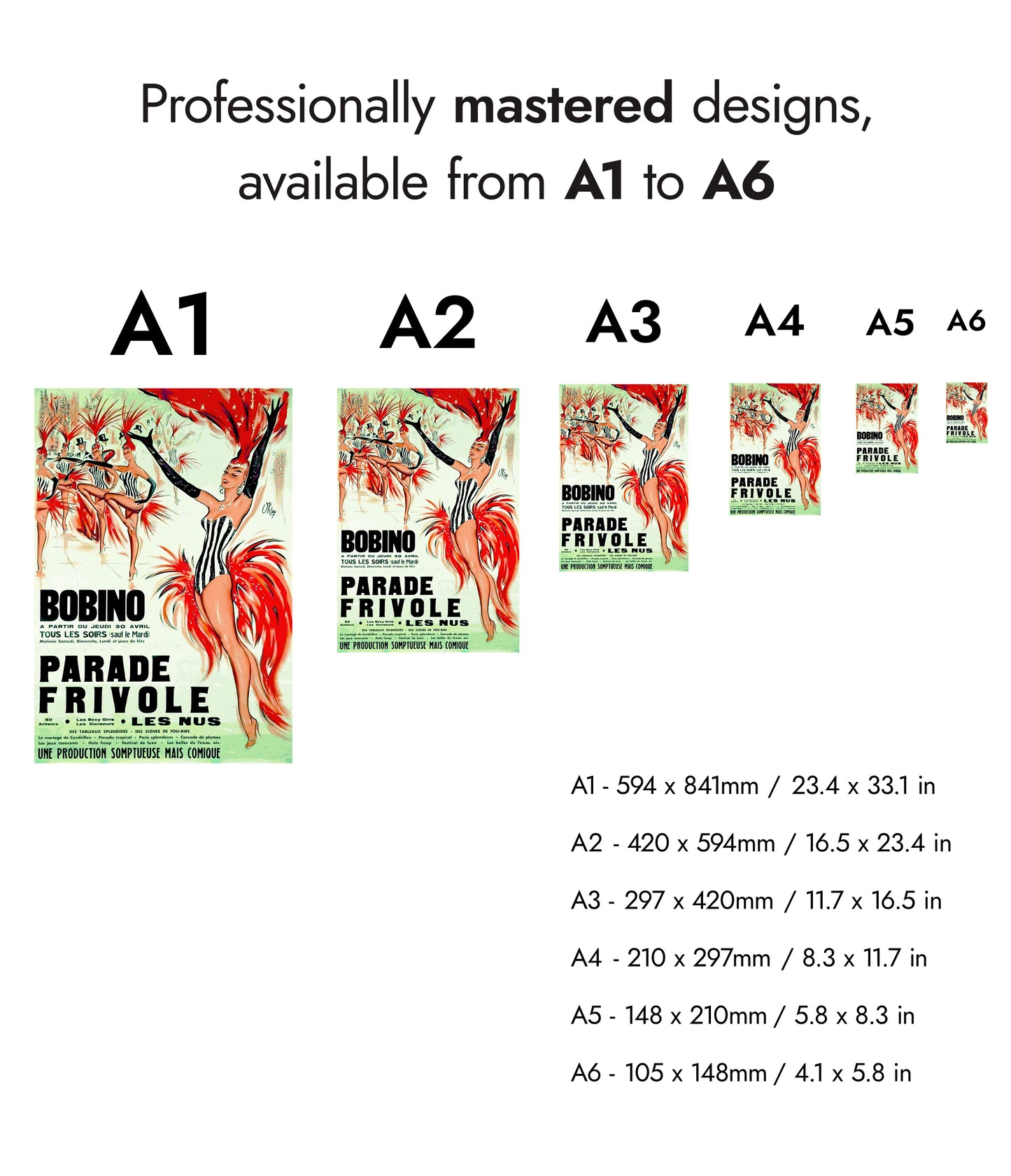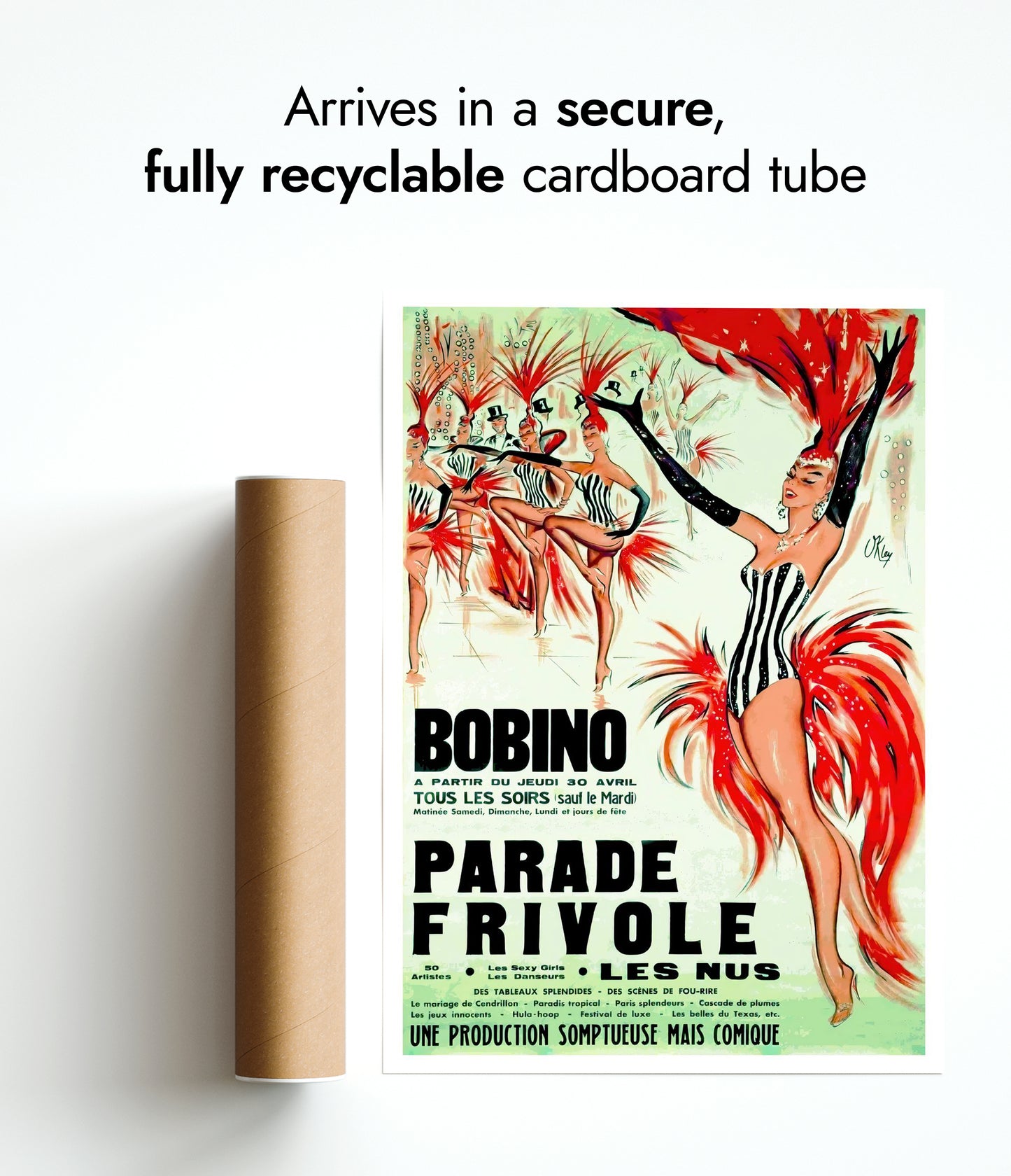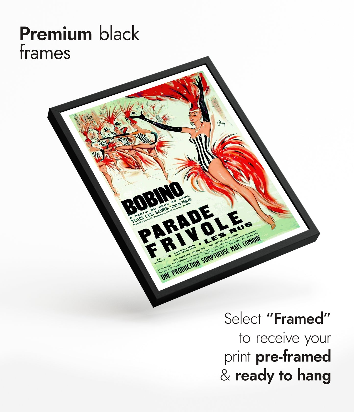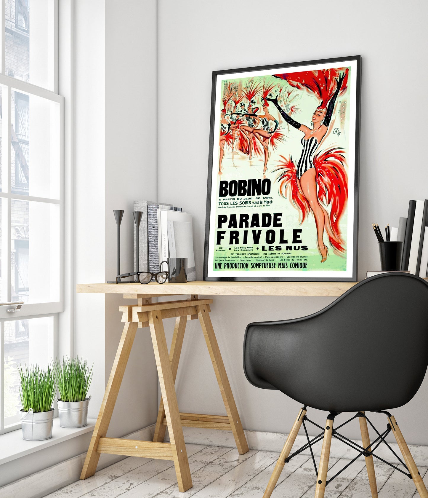 The "Bobino, Parade Frivole" poster showcases a vibrant cabaret scene, capturing the lively essence of a Parisian festival. Dominated by striking red and contrasting black-and-white costumes, this vintage illustration highlights the dynamic movement of dancers adorned with feathered headpieces. The green backdrop enhances the overall theatrical ambiance, making this piece a nostalgic nod to classic cabaret performances.