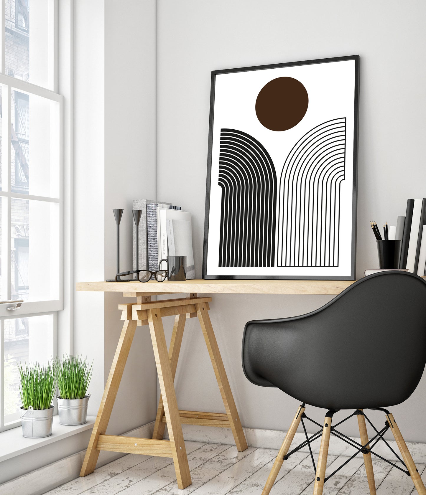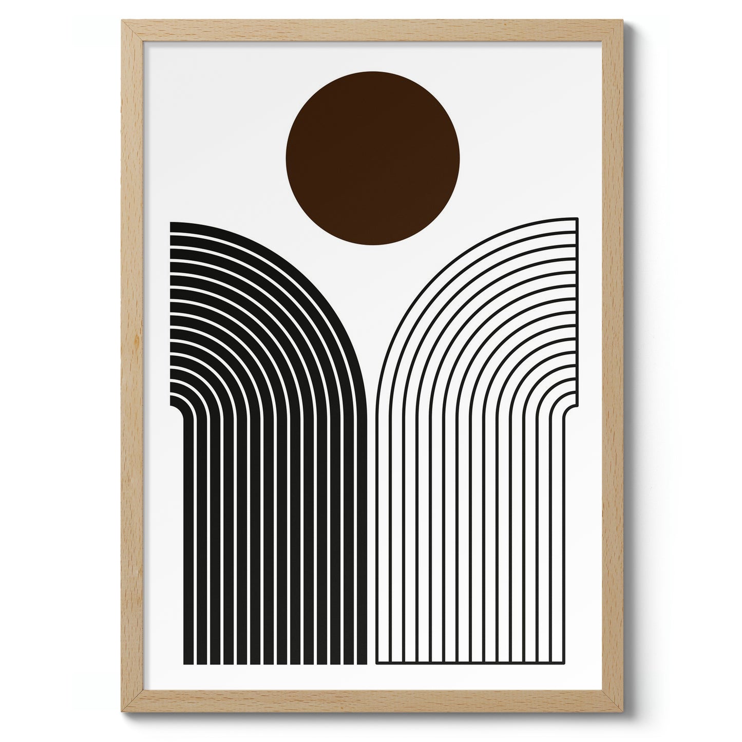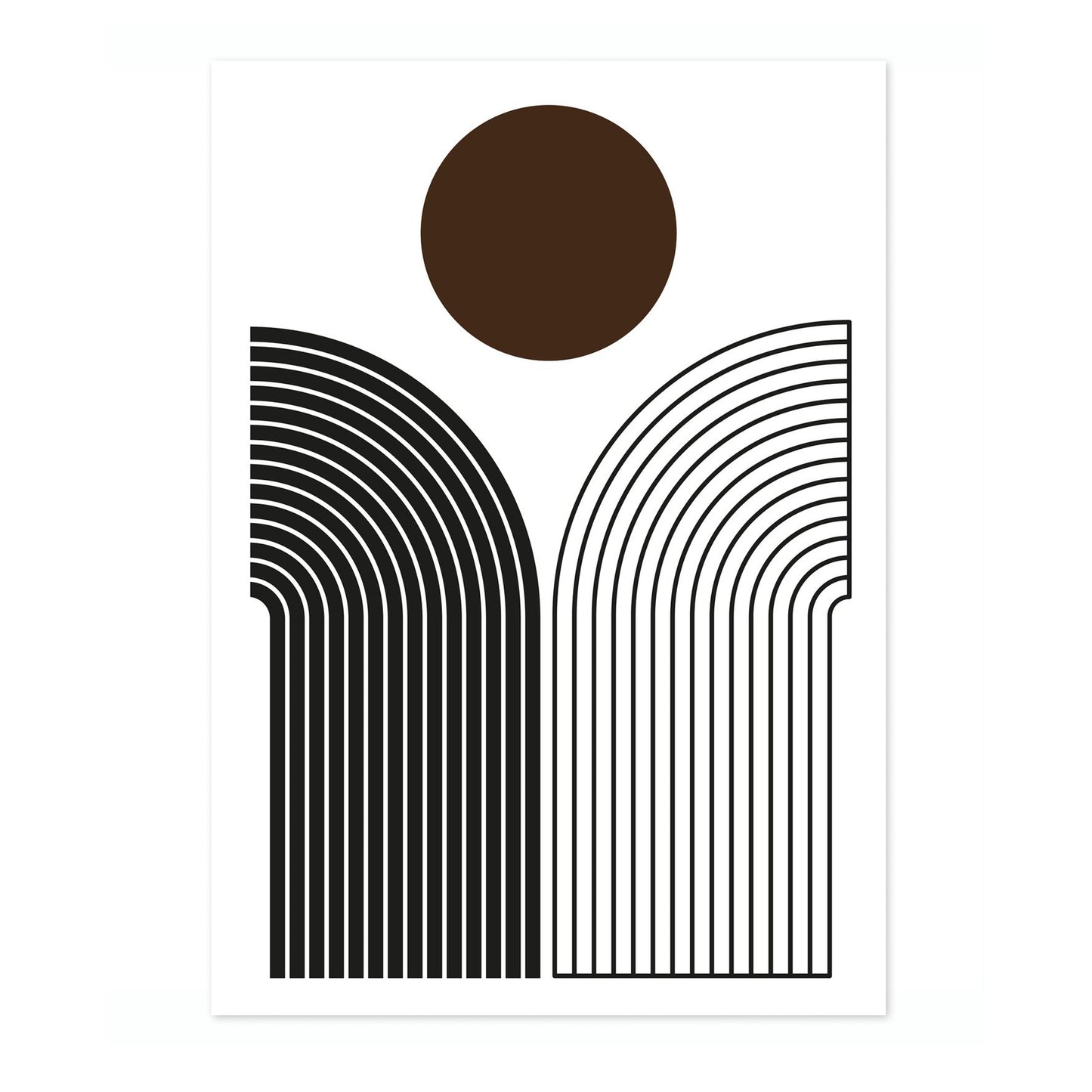 "Boho Bowl" poster features an abstract composition of concentric arcs in black and white, crowned by a solid brown circle. This minimalist design embodies a calm, Scandi aesthetic, merging graphic and boho styles. Perfect for adding a sophisticated touch to modern interiors, this art print captures the essence of abstract shapes with a contemporary flair.