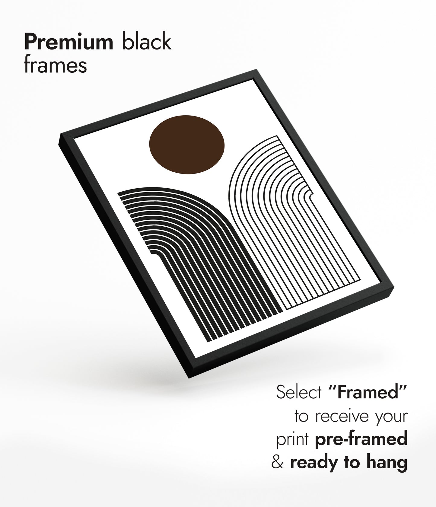 Solid wood frames available in black stained or natural finishes, with UV resistant acrylic glass. Framed orders arrive pre-installed with your choice of print, ready to hang. Available in all print sizes.