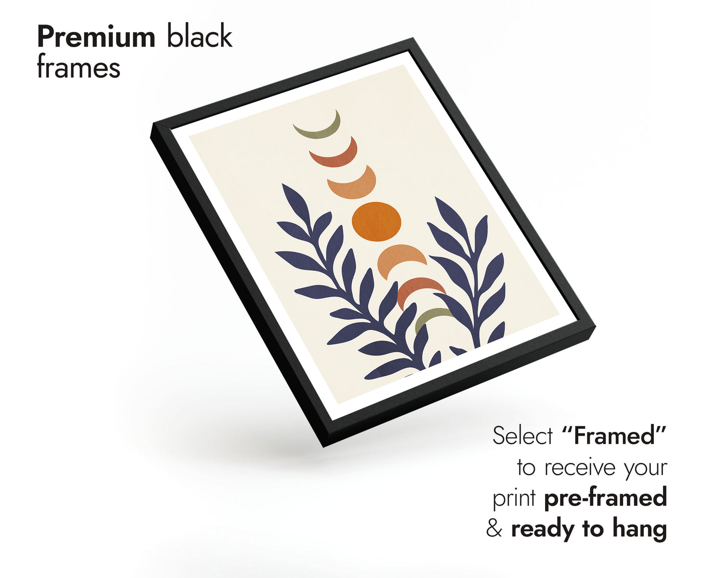 Solid wood frames available in black stained or natural finishes, with UV resistant acrylic glass. Framed orders arrive pre-installed with your choice of print, ready to hang. Available in all print sizes.