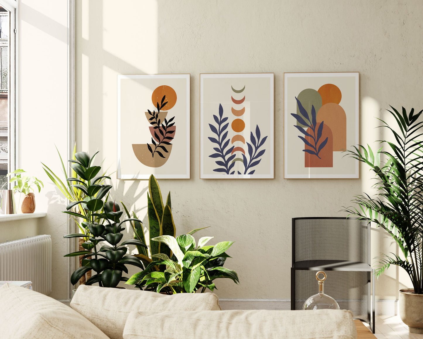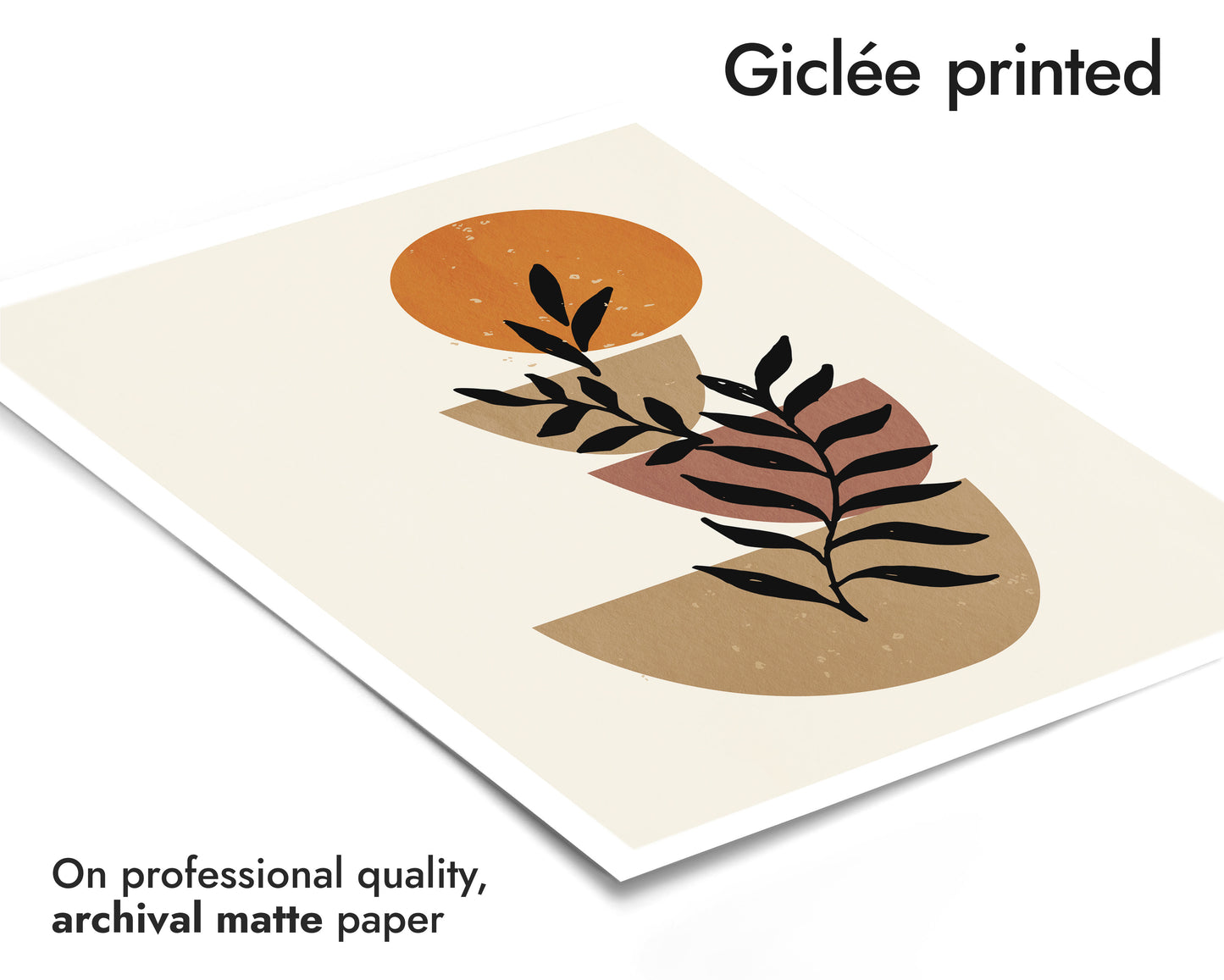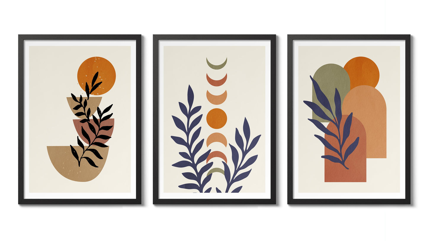 "Boho Olive Branches" is a striking set of three minimalist posters featuring abstract shapes, olive branches, and celestial elements. The earthy tones and simplistic design in each piece blend Scandi and boho styles, creating a calming, graphic composition. Ideal for adding a touch of abstract elegance to modern interiors. Perfect for art lovers seeking a minimalist poster set with a nature-inspired theme.