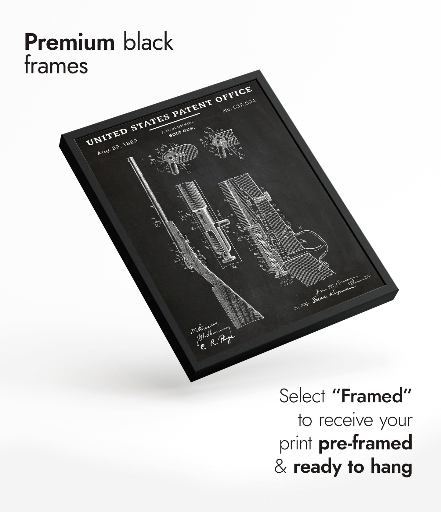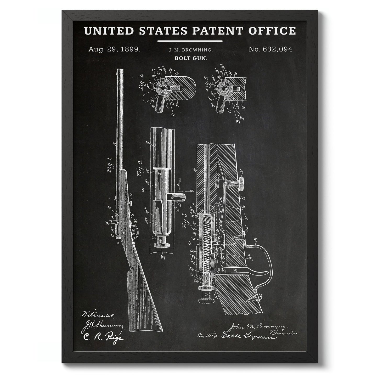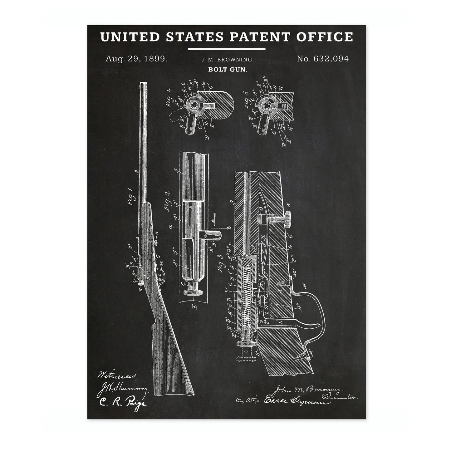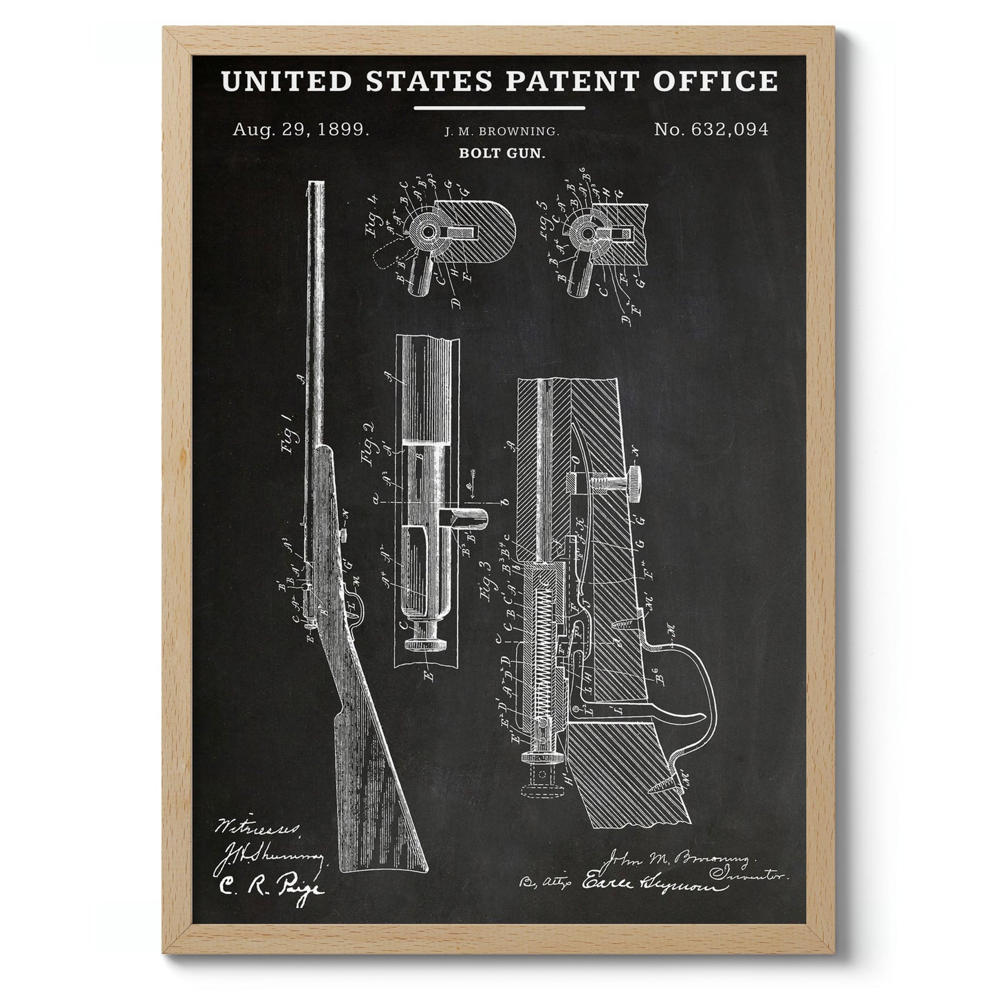 This vintage poster features the detailed 1899 patent illustration of a bolt gun, attributed to J.M. Browning. Rendered in classic black and white line art, it highlights intricate schematics and annotations of the firearm design. Ideal for enthusiasts of historical patents and firearm schematics, the poster captures the precise engineering and innovation of the era.