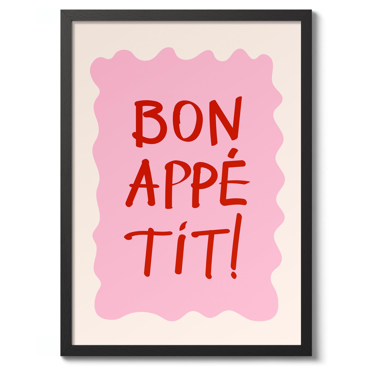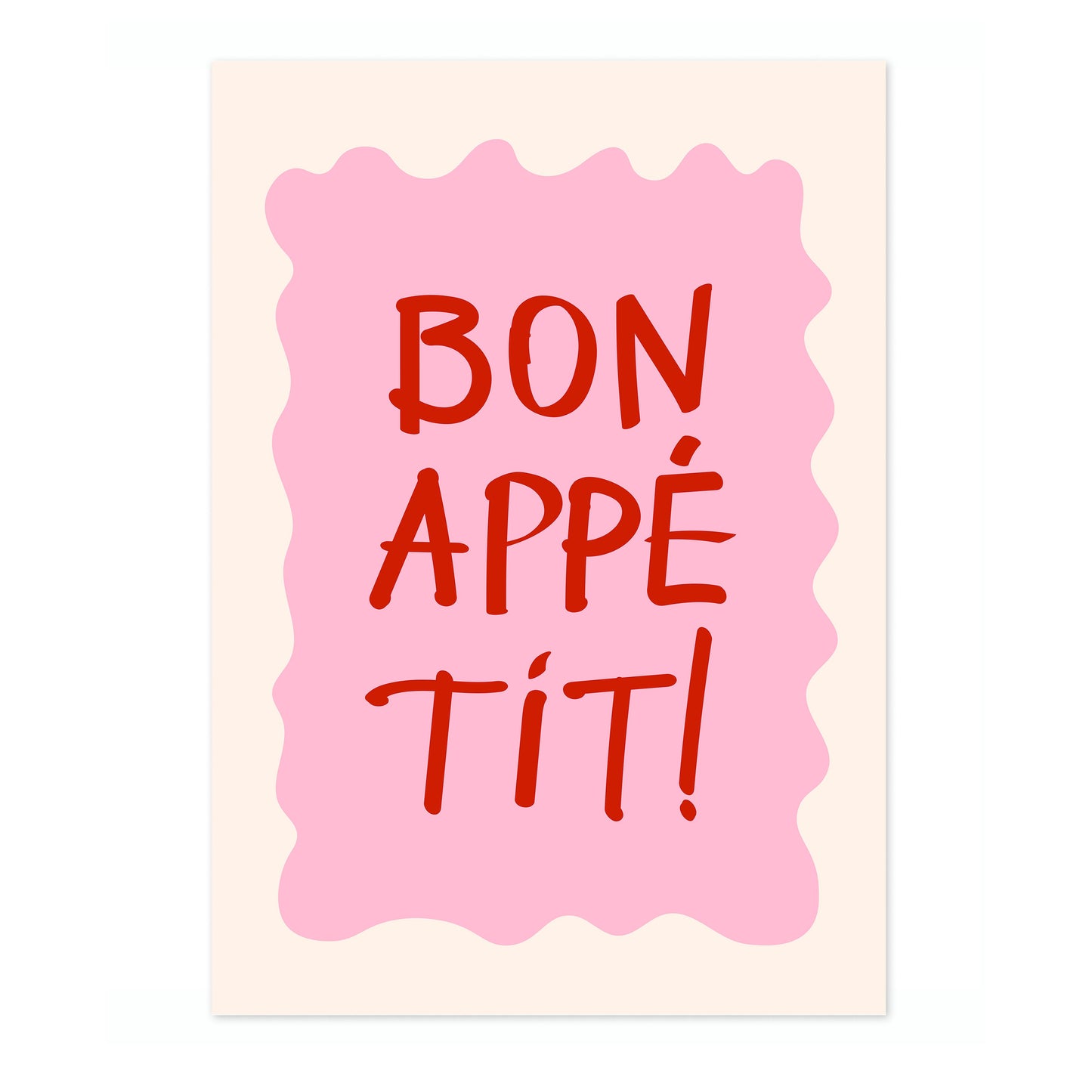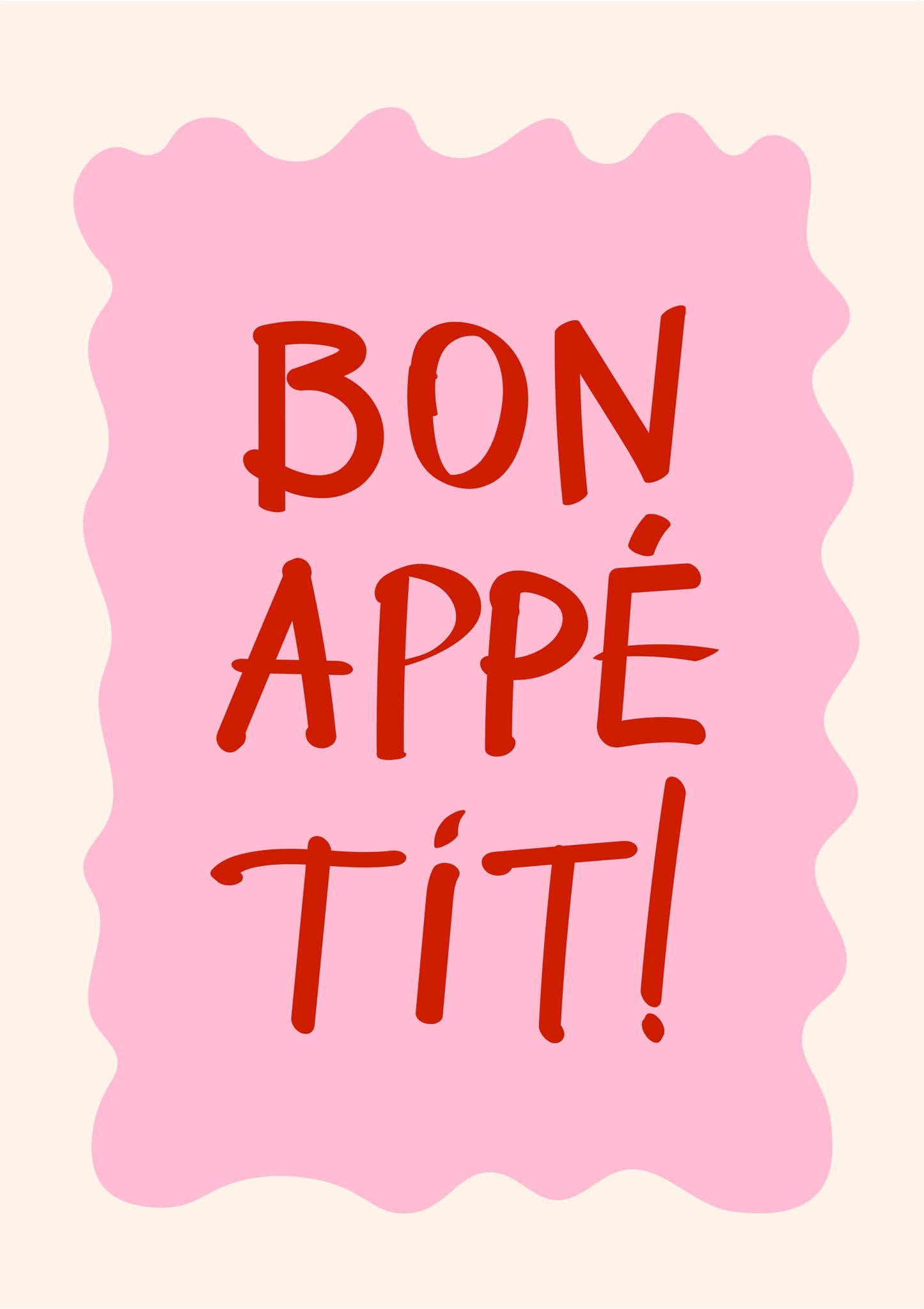 This "Bon Appétit" poster features bold red typography on a soft pink background, ideal for adding a playful touch to your kitchen decor. The illustrated wavy border enhances its graphic style, making it a striking addition to any space. Perfect for food lovers and design enthusiasts alike.