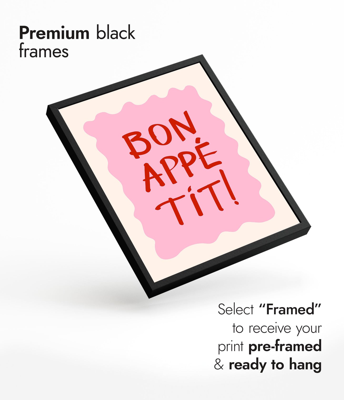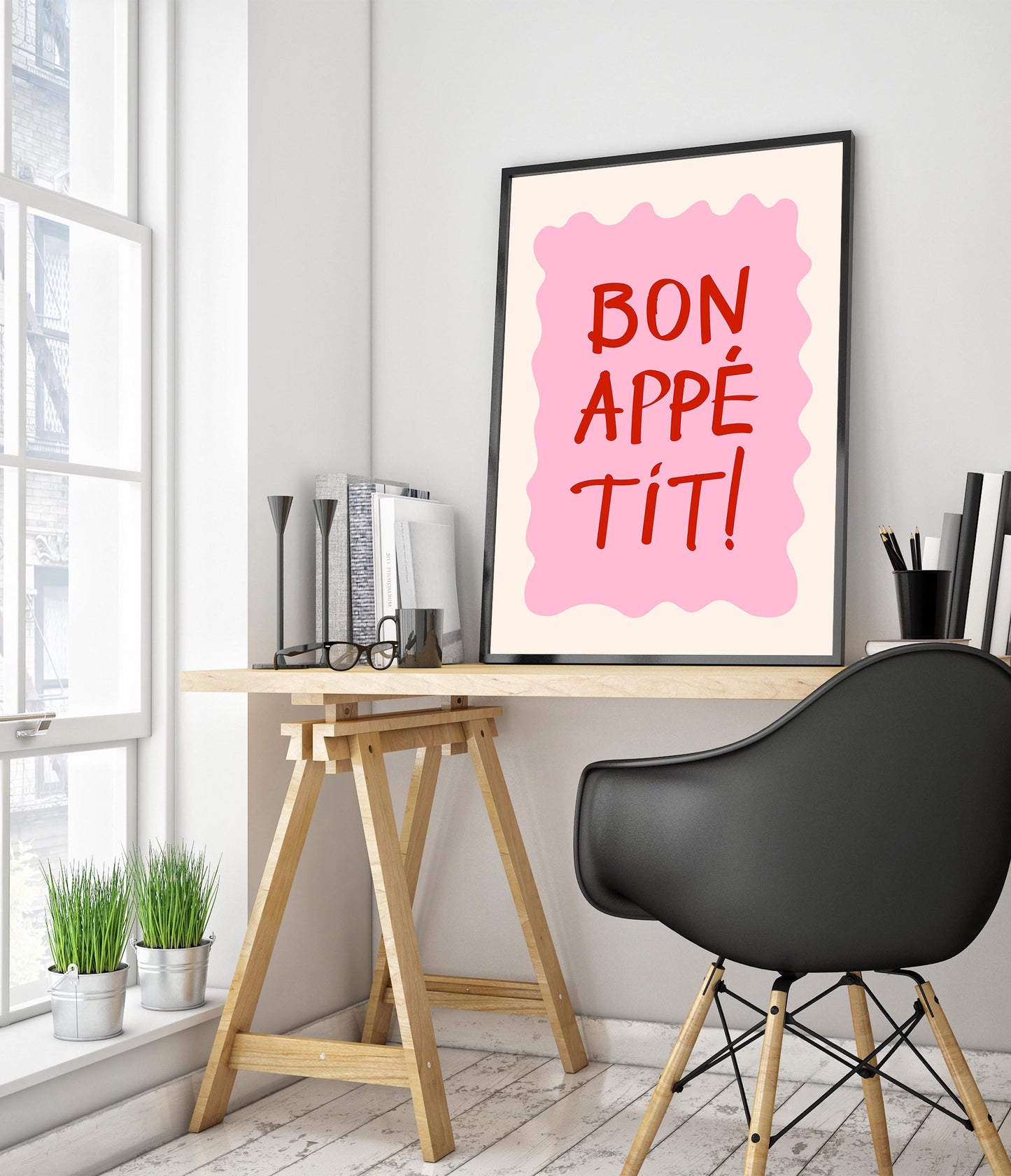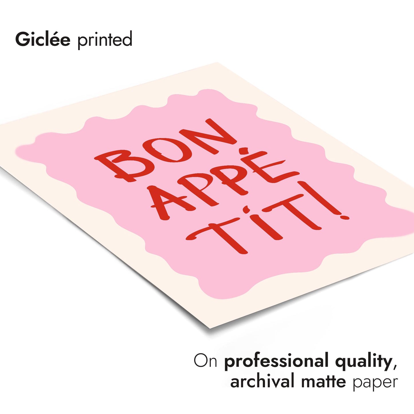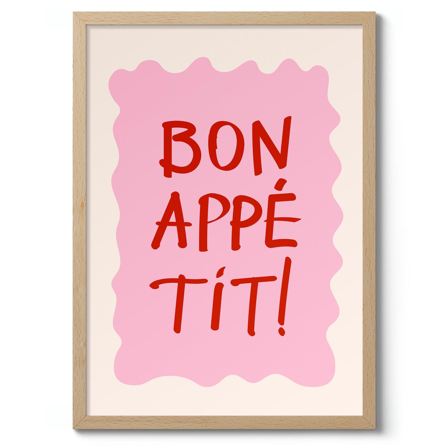 This "Bon Appétit" poster features bold red typography on a soft pink background, ideal for adding a playful touch to your kitchen decor. The illustrated wavy border enhances its graphic style, making it a striking addition to any space. Perfect for food lovers and design enthusiasts alike.