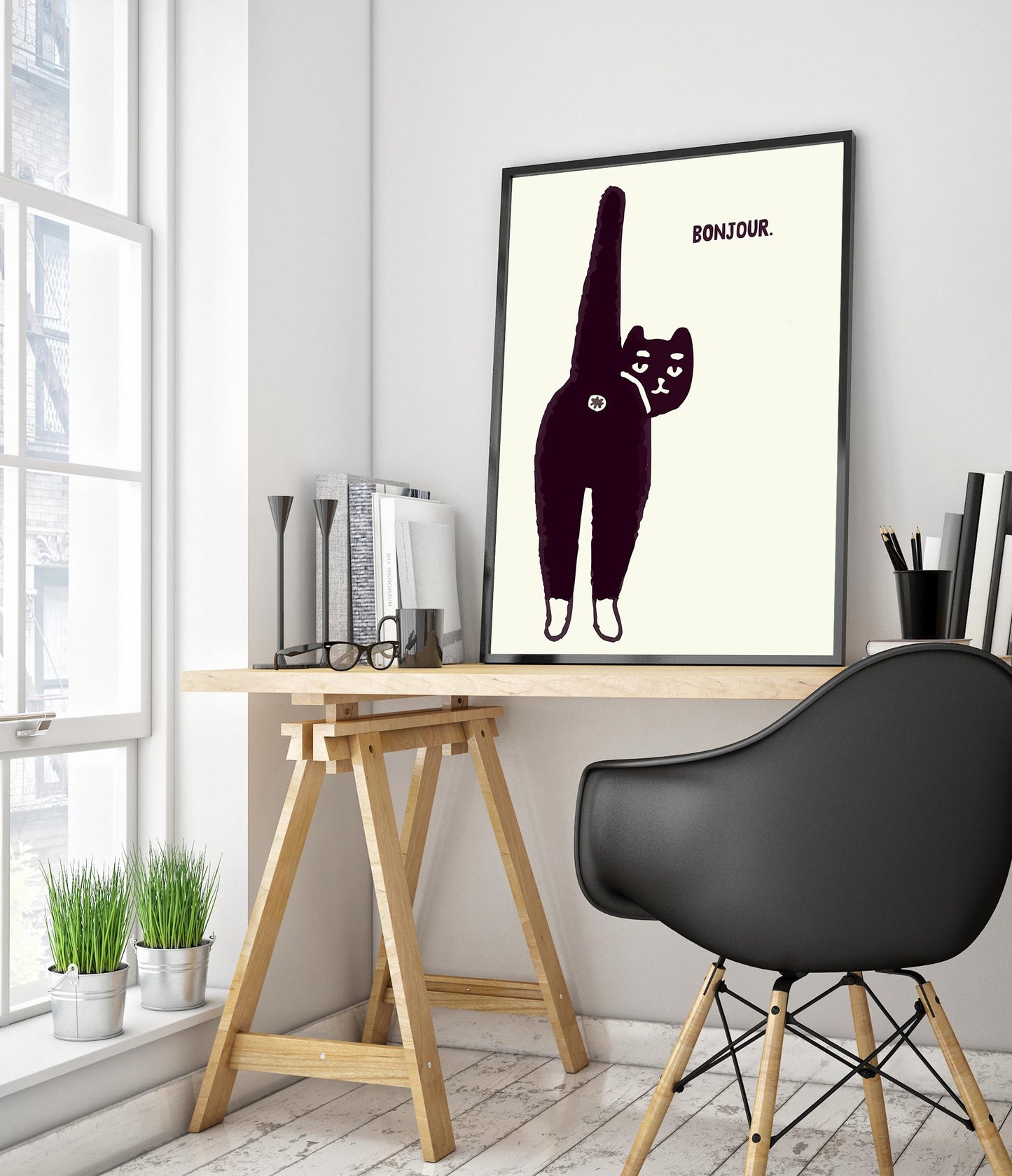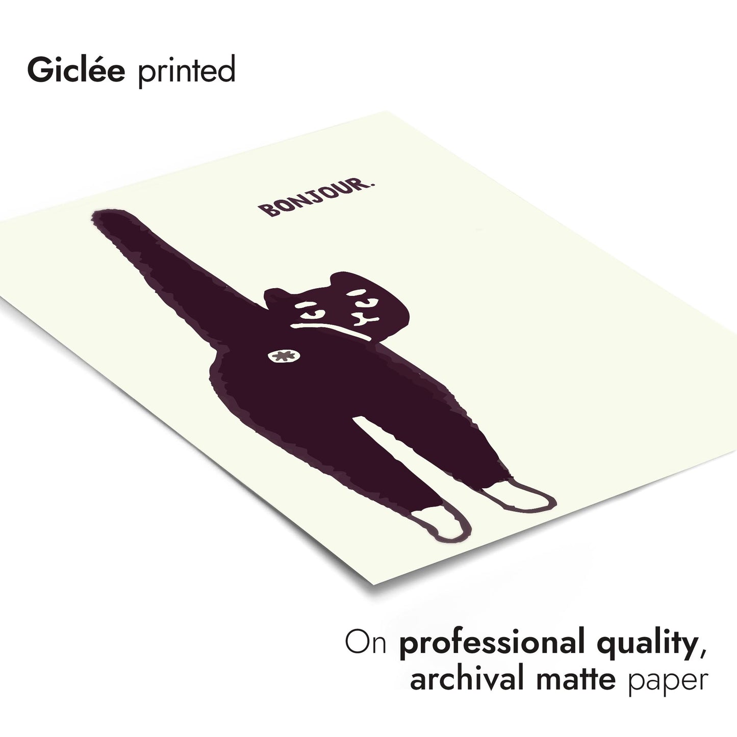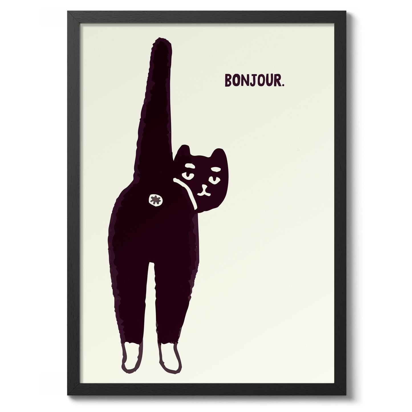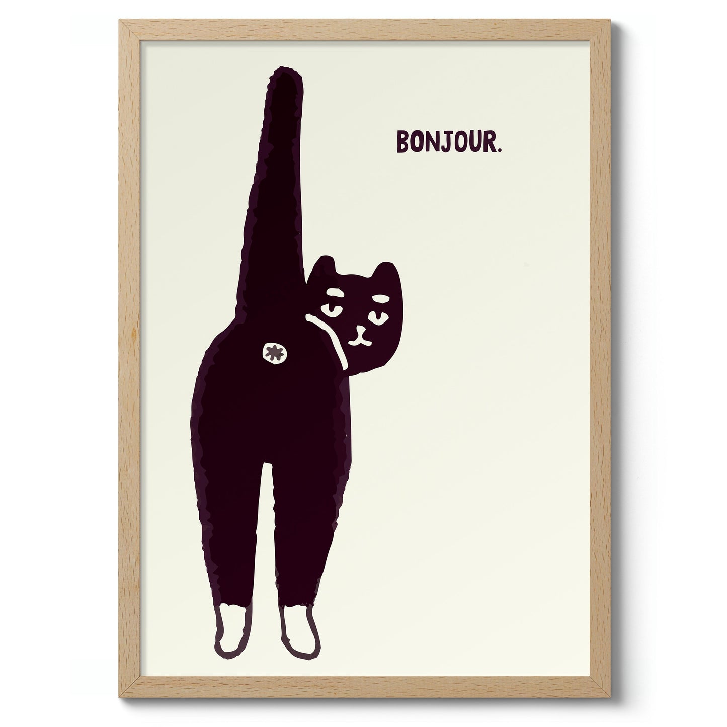 This "Bonjour" poster features a whimsical illustration of a black cat greeting you with a cheeky pose. Set against a minimalist background, the captivating graphic combines humor and charm, making it a perfect addition to any animal lover's space. Ideal for a modern decor setup, this piece brings a touch of playful art to your walls.