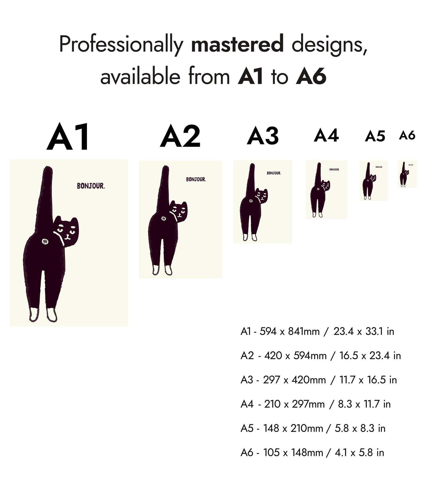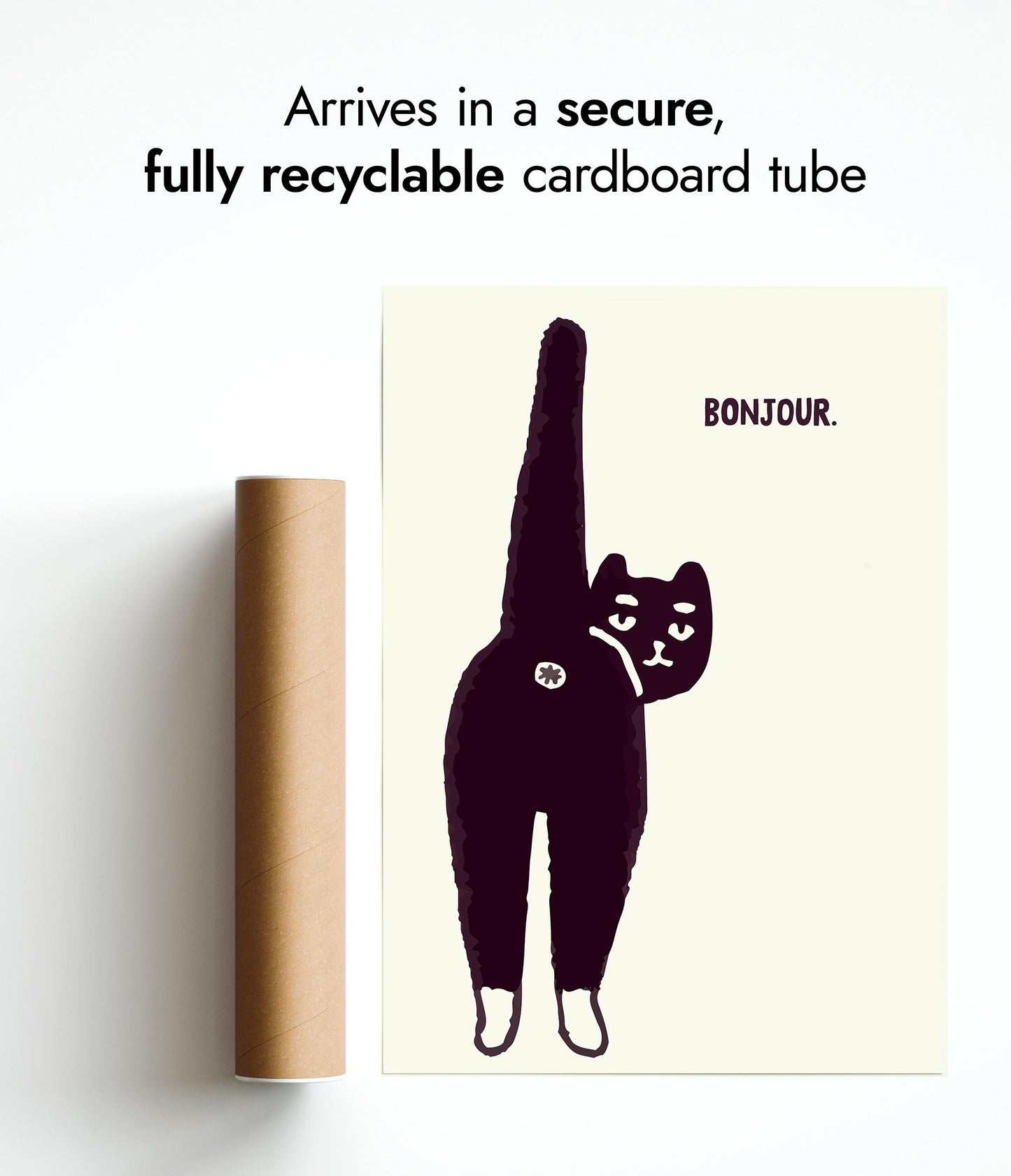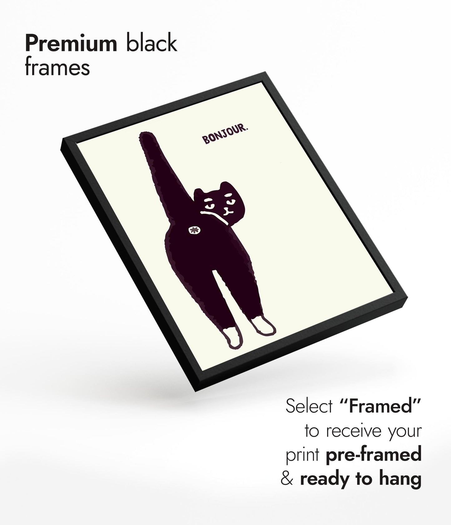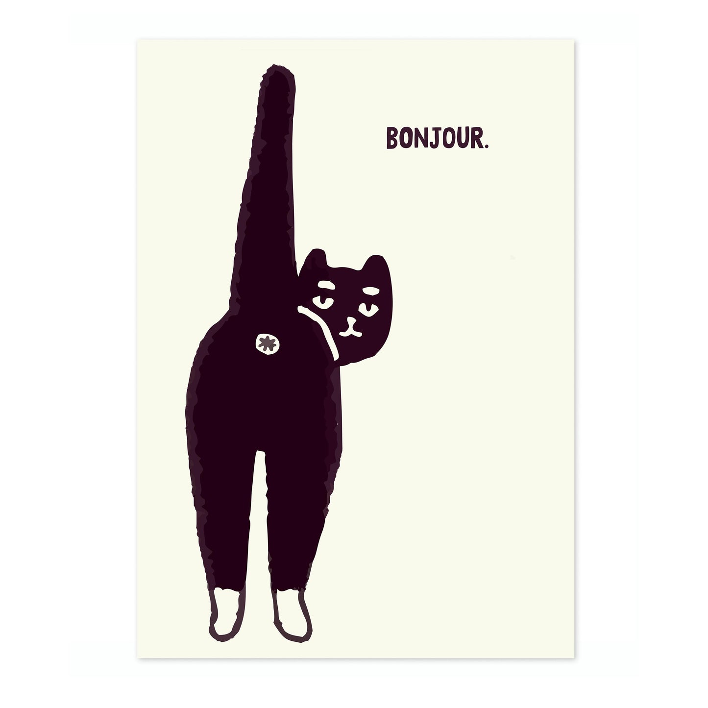 This "Bonjour" poster features a whimsical illustration of a black cat greeting you with a cheeky pose. Set against a minimalist background, the captivating graphic combines humor and charm, making it a perfect addition to any animal lover's space. Ideal for a modern decor setup, this piece brings a touch of playful art to your walls.