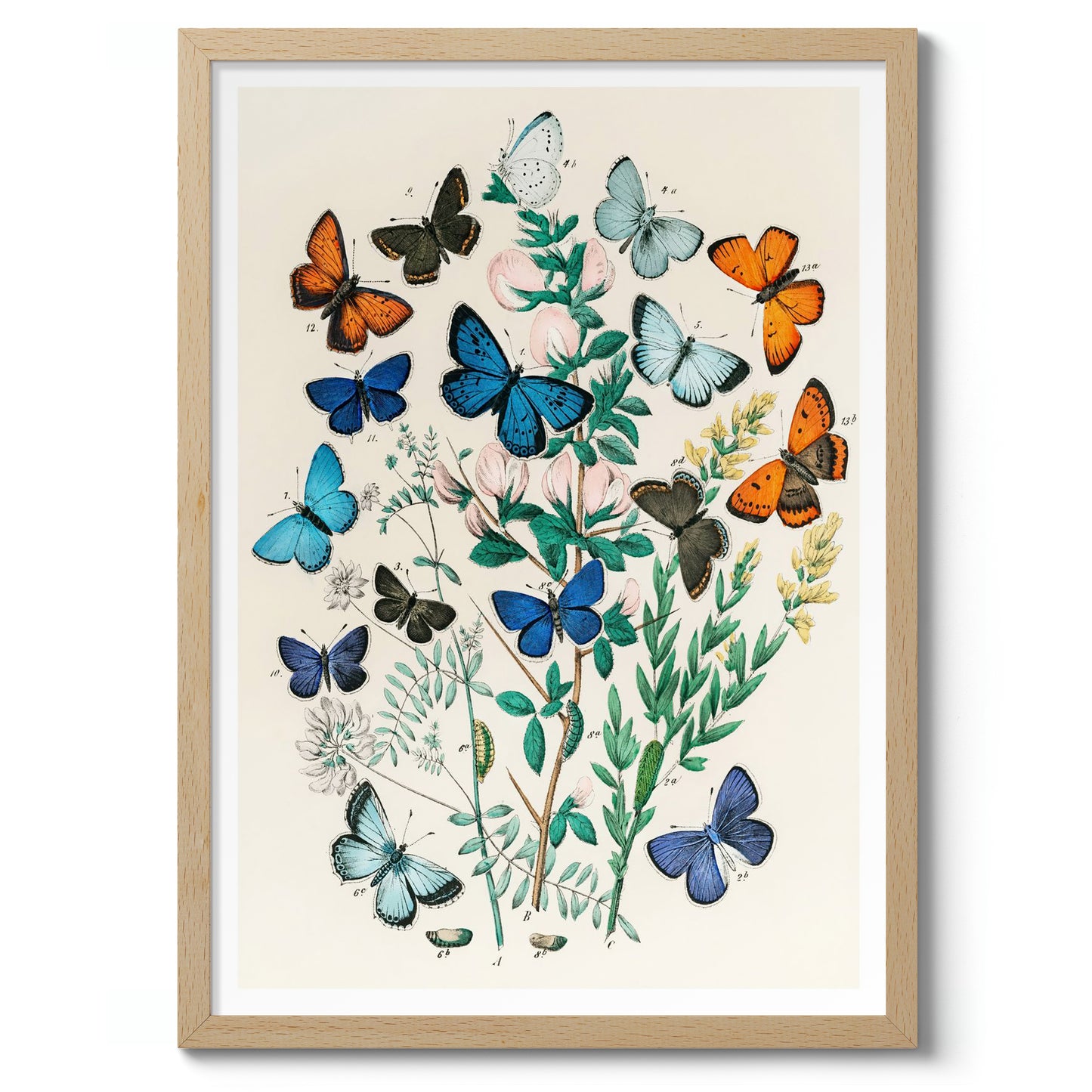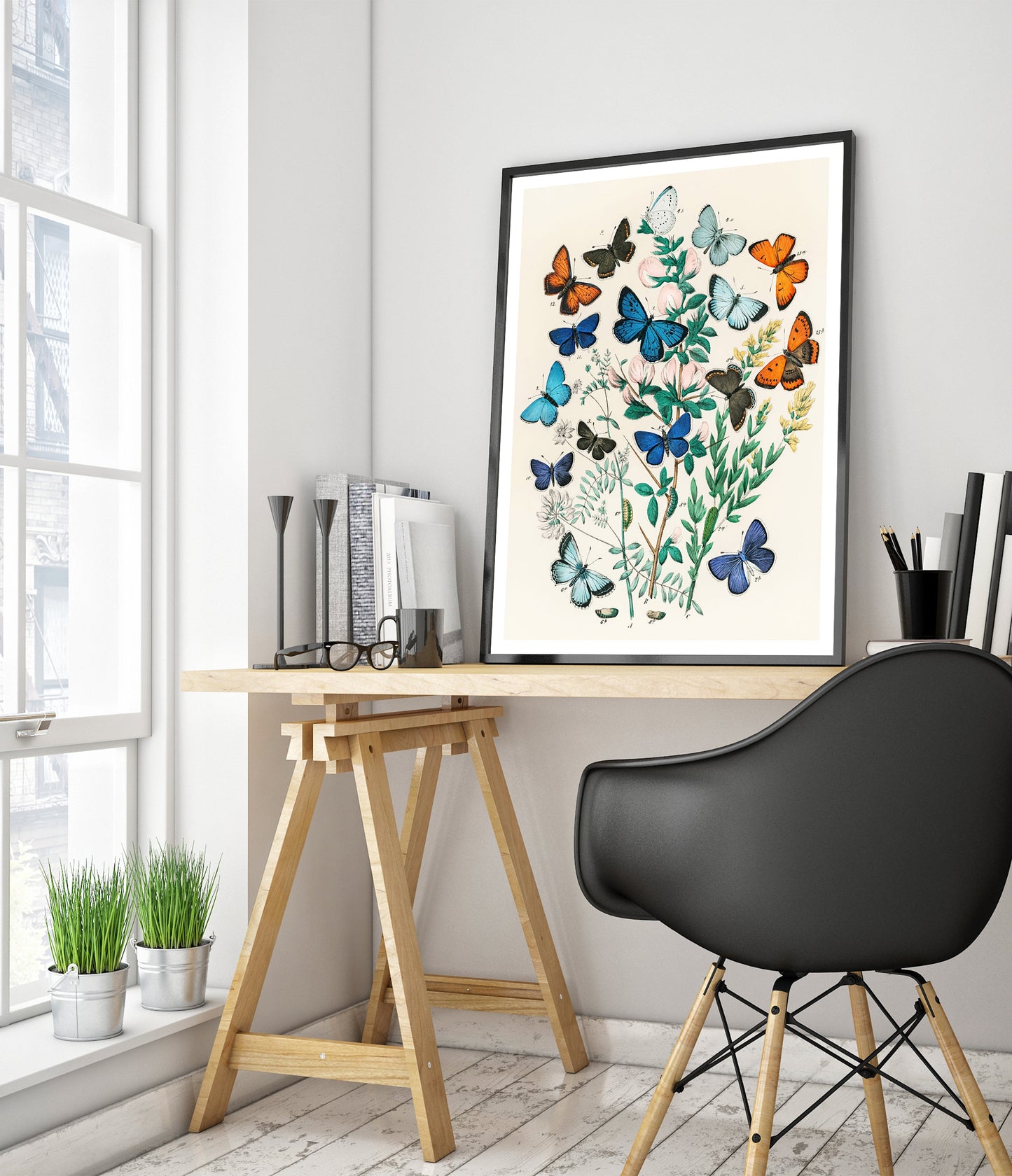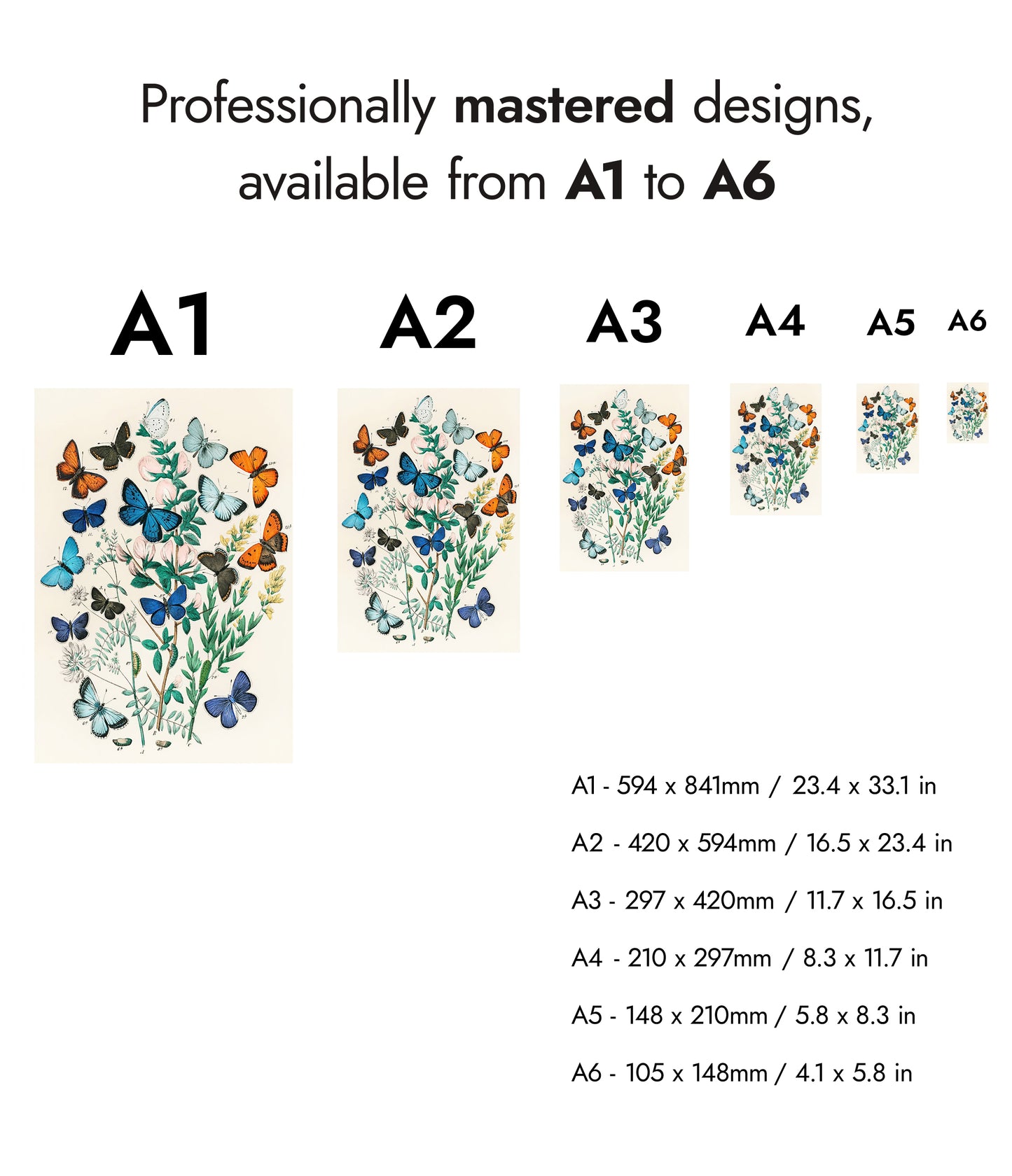 This vintage-style poster, titled "Botanical Butterflys," artfully showcases a diverse collage of butterflies amidst a botanical backdrop. The multicoloured butterflies, set against a beige background, highlight the harmonious beauty of nature. Perfect for insect enthusiasts, it captures the essence of butterflies in a lush, natural setting, making it an ideal choice for nature-inspired decor.