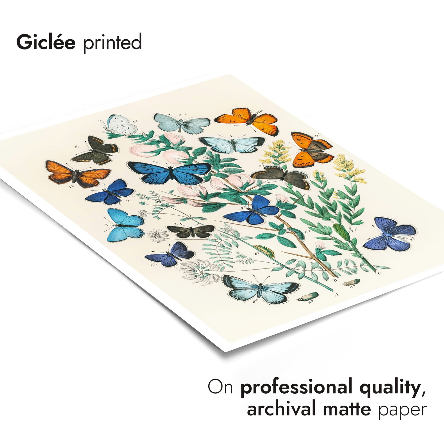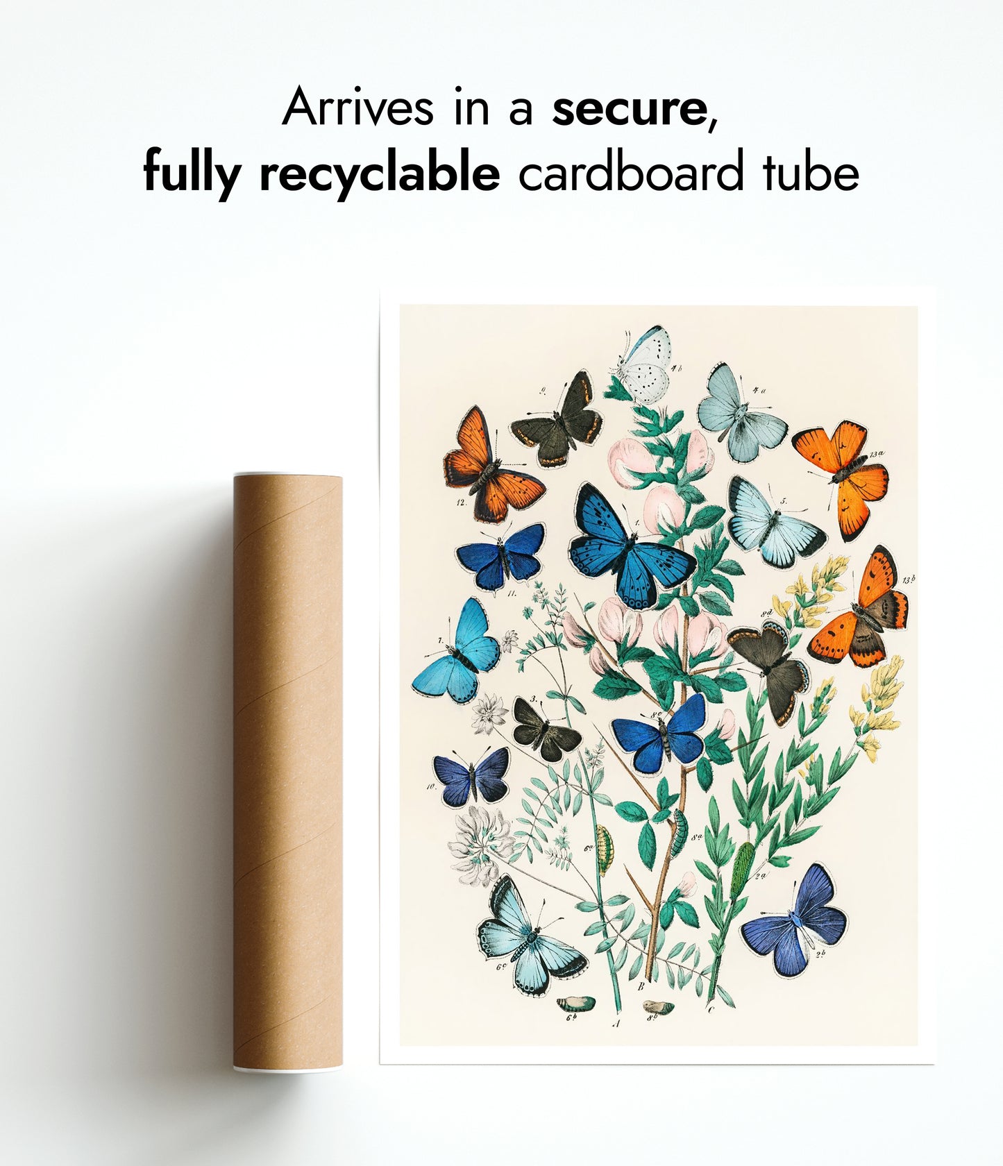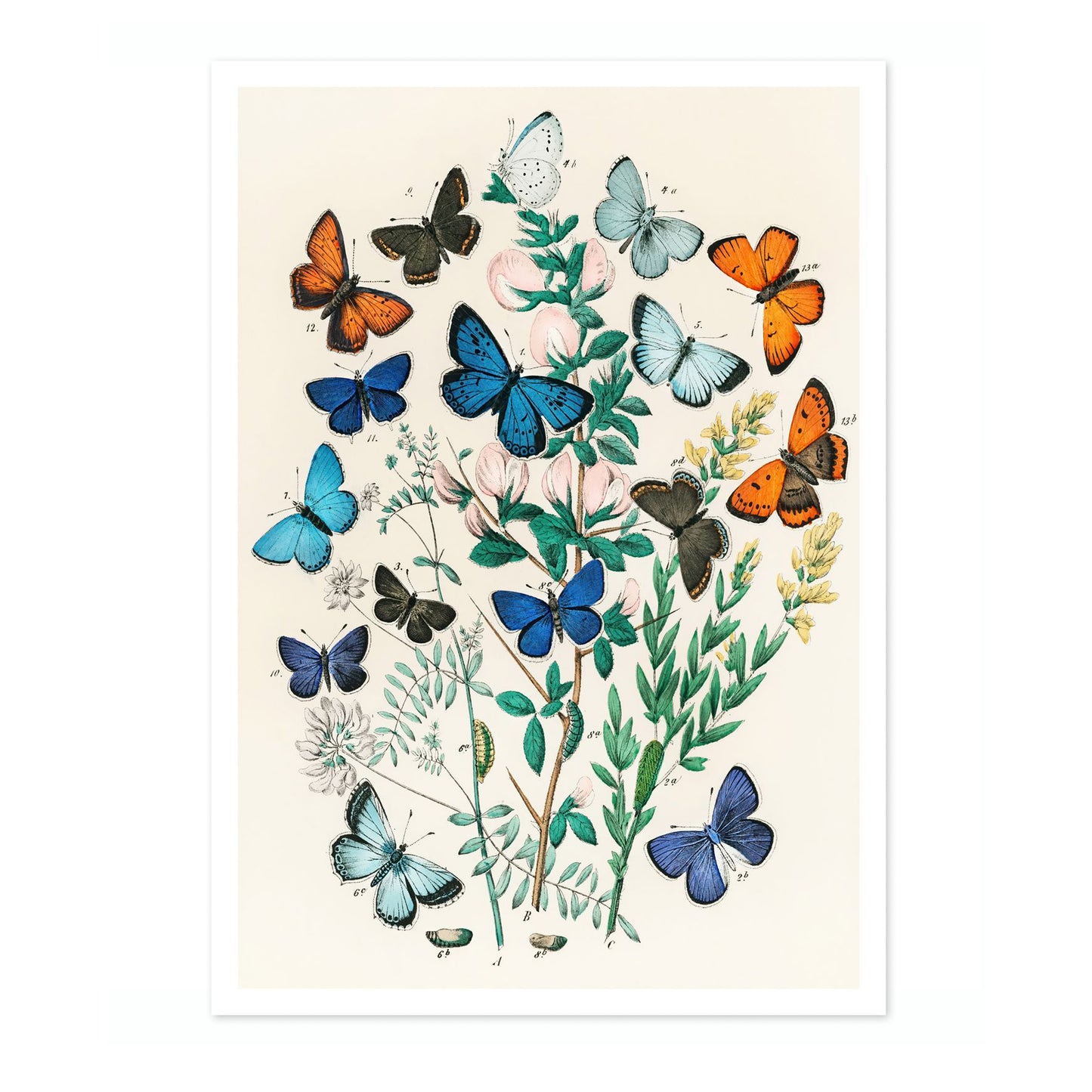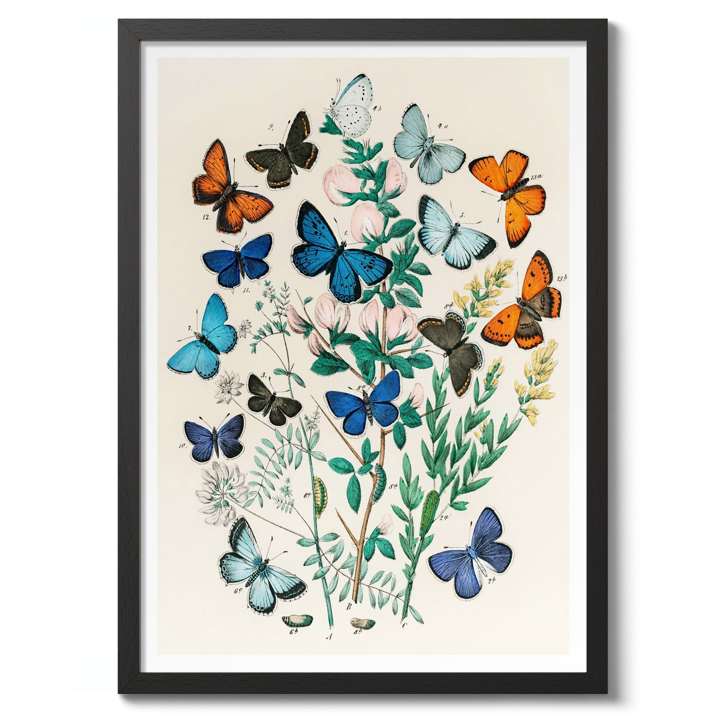 This vintage-style poster, titled "Botanical Butterflys," artfully showcases a diverse collage of butterflies amidst a botanical backdrop. The multicoloured butterflies, set against a beige background, highlight the harmonious beauty of nature. Perfect for insect enthusiasts, it captures the essence of butterflies in a lush, natural setting, making it an ideal choice for nature-inspired decor.