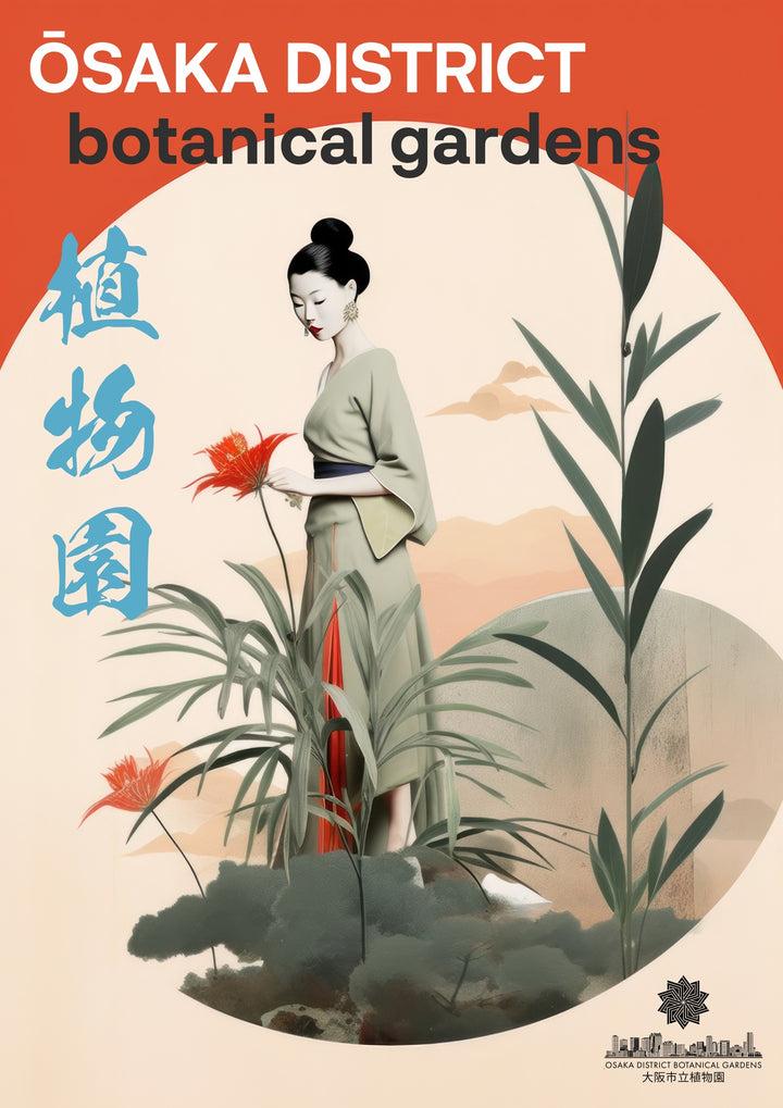 This minimalist poster features a serene Japanese woman in traditional attire standing amid lush foliage at the Osaka District Botanical Gardens. The soft colours and delicate lines emphasize the peaceful harmony between nature and culture, making it a perfect piece for nature and art enthusiasts. Enhance your space with this modern exhibition-inspired botanical poster.