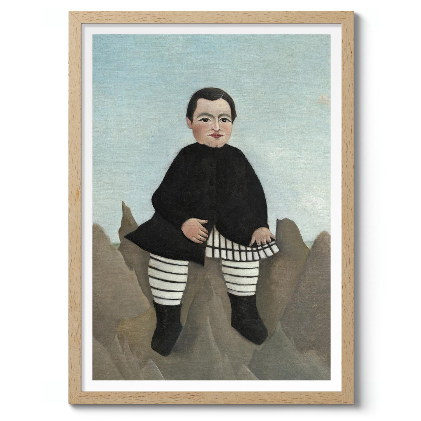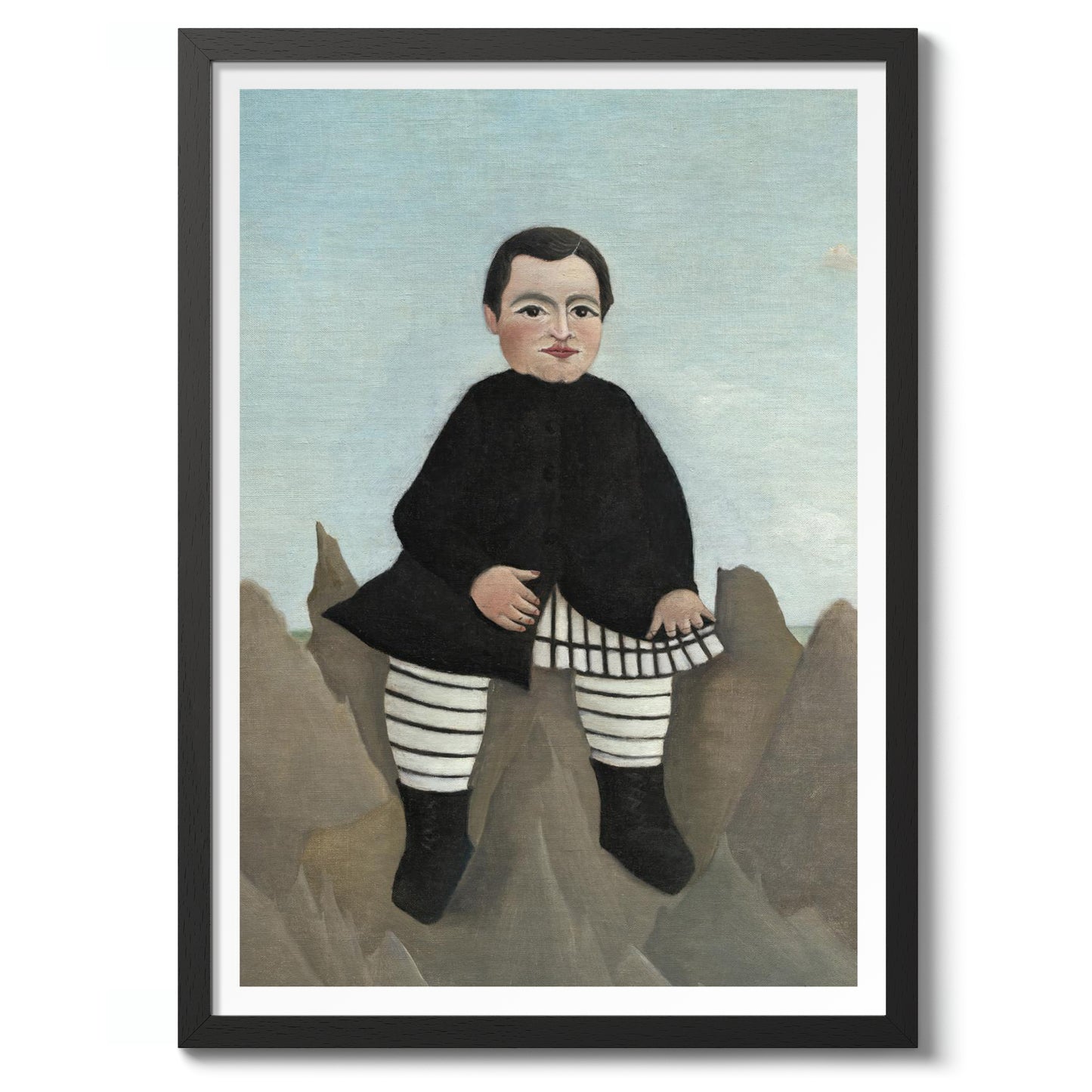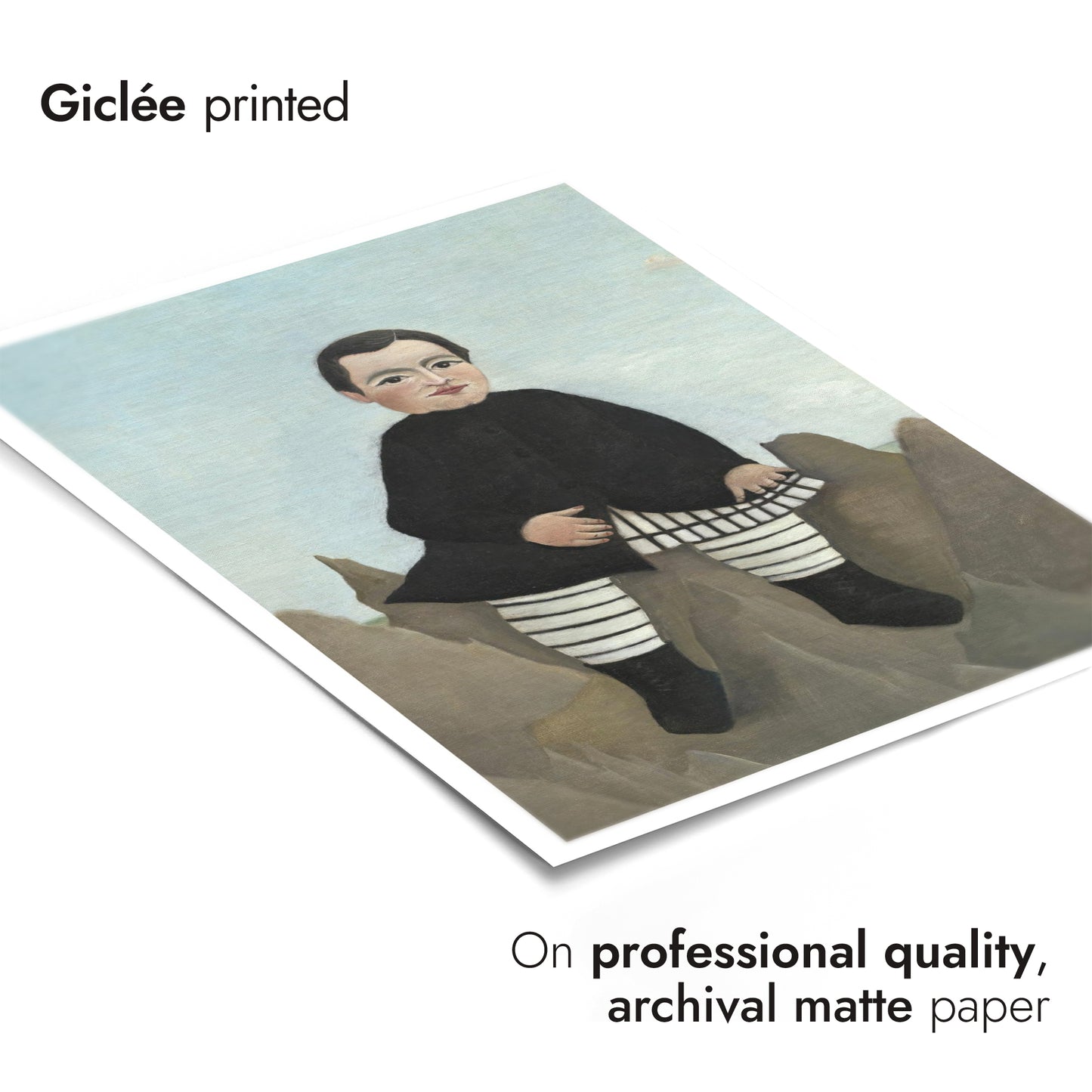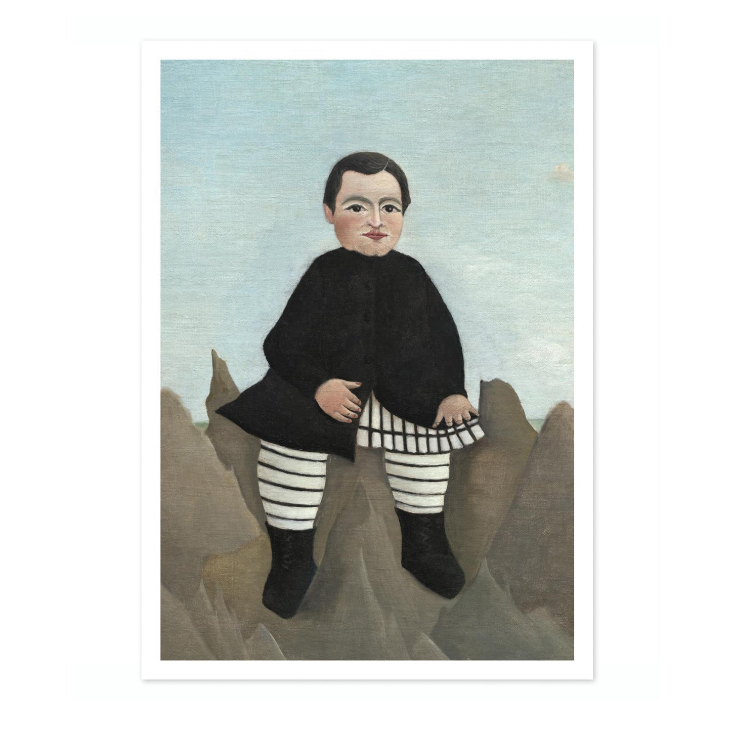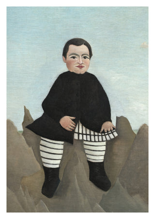 Henri Rousseau's "Boy on the Rocks" poster captures a young boy, distinctively dressed in a black coat and striped trousers, seated atop rugged rocks against a serene sky backdrop. The naive primitivist style highlights the simplicity and innocence of the subject. This 1895 painting elegantly blends natural and human elements, creating a charming and evocative scene perfect for art enthusiasts.