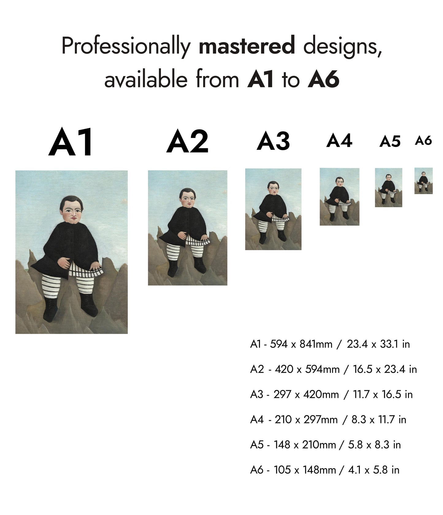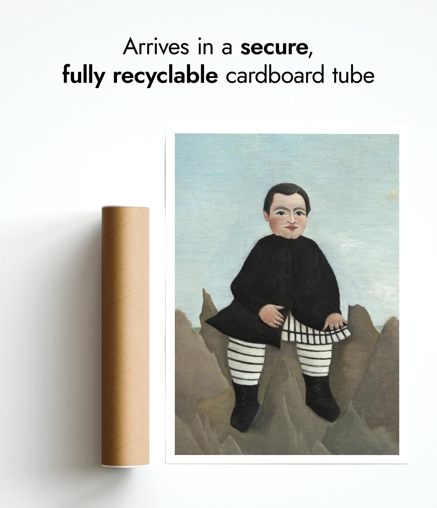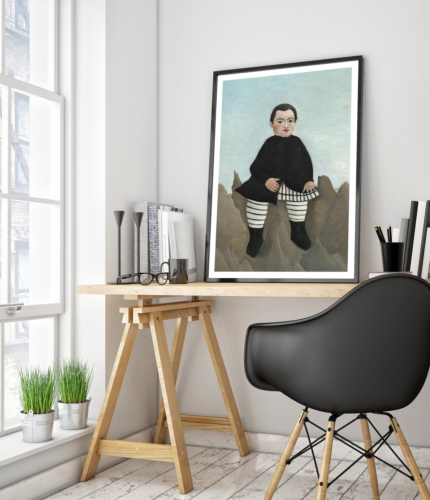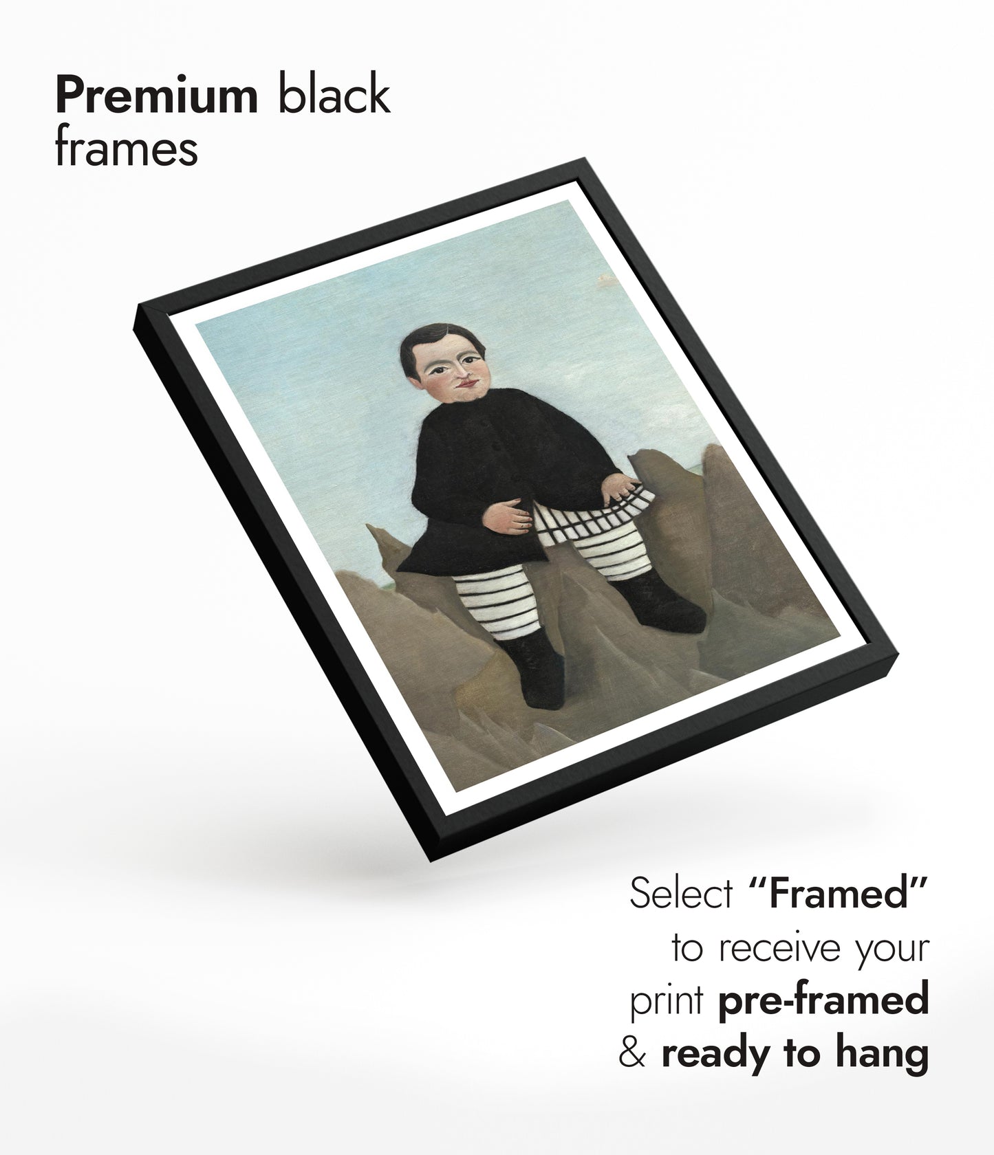 Henri Rousseau's "Boy on the Rocks" poster captures a young boy, distinctively dressed in a black coat and striped trousers, seated atop rugged rocks against a serene sky backdrop. The naive primitivist style highlights the simplicity and innocence of the subject. This 1895 painting elegantly blends natural and human elements, creating a charming and evocative scene perfect for art enthusiasts.