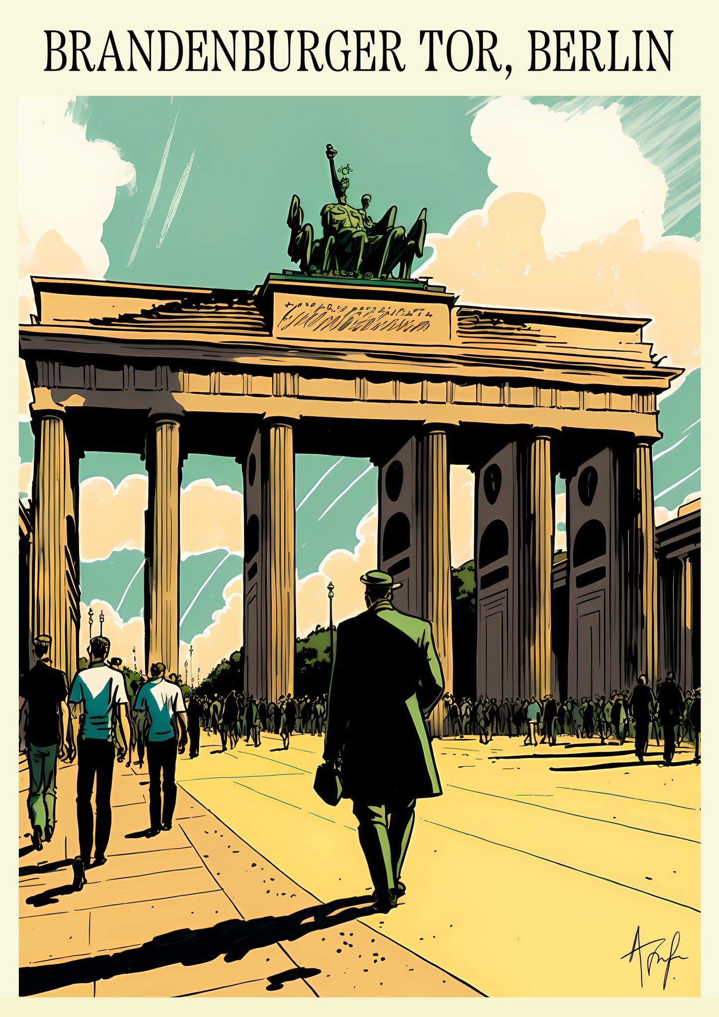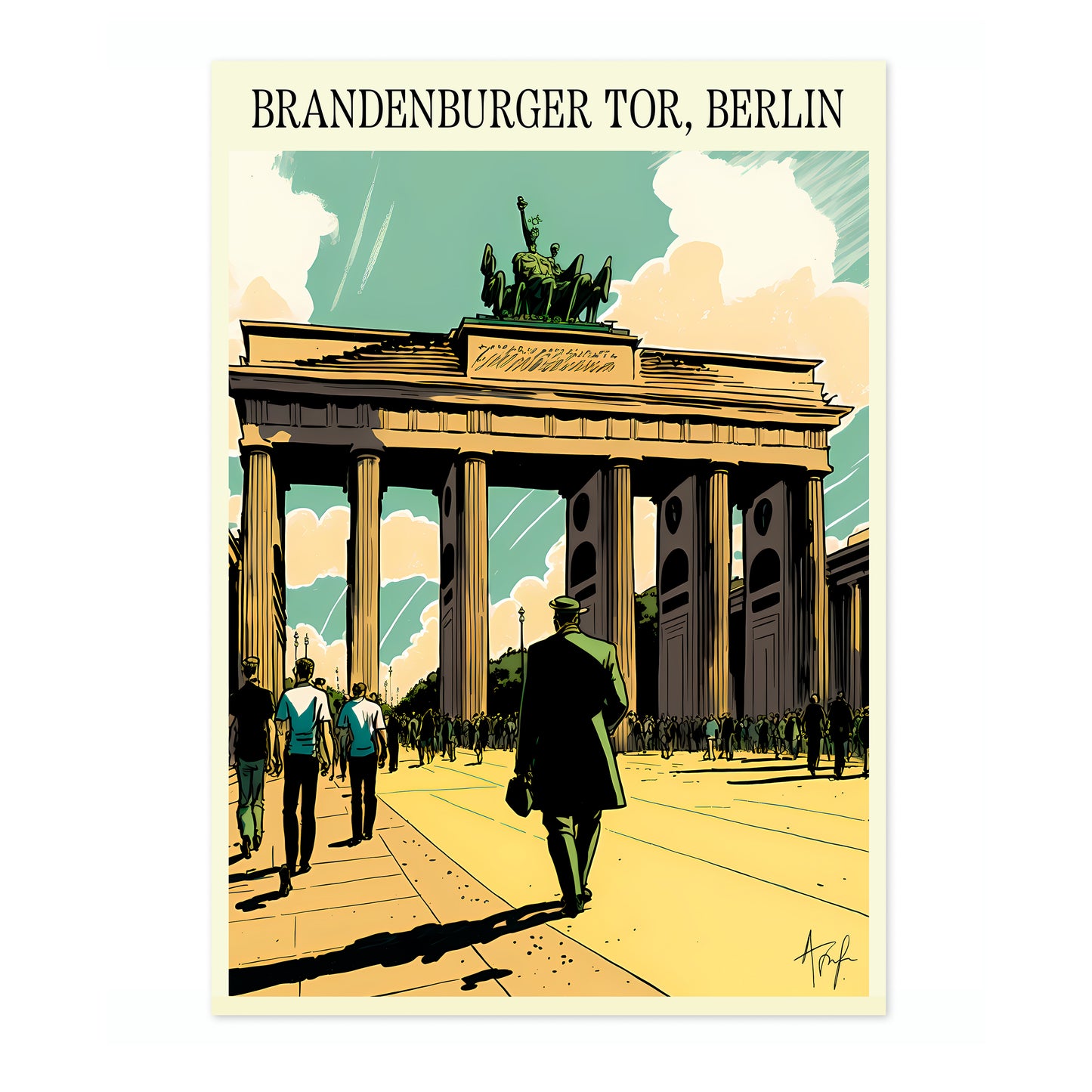 This vibrant poster of Brandenburger Tor, Berlin by Alfonso Trufa captures the iconic gateway in a vintage illustration style. Featuring detailed architectural elements and a bustling scene, the artwork transports viewers to the heart of Germany's capital. Ideal for lovers of European landmarks, this Berlin poster adds a touch of historical charm to any space.