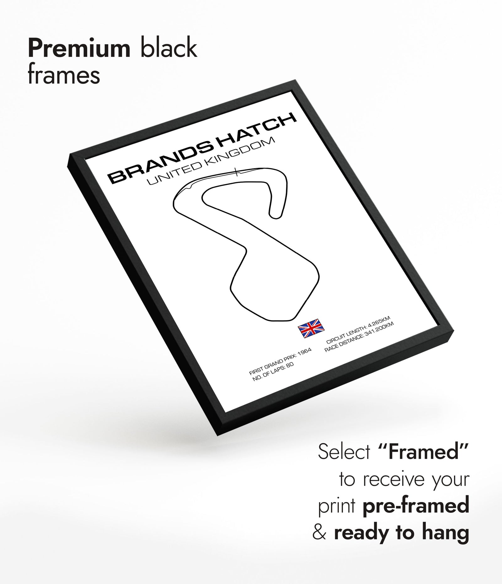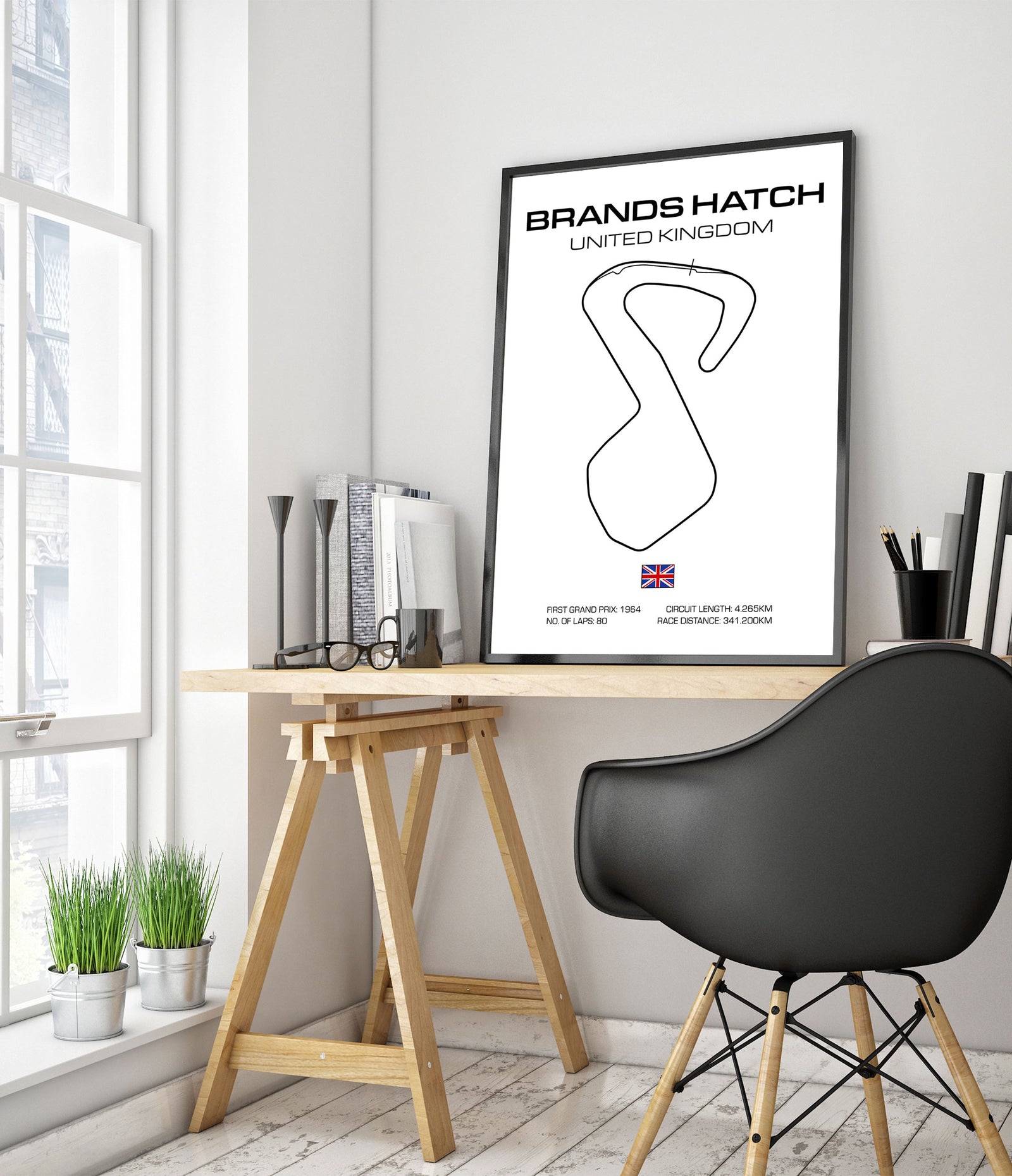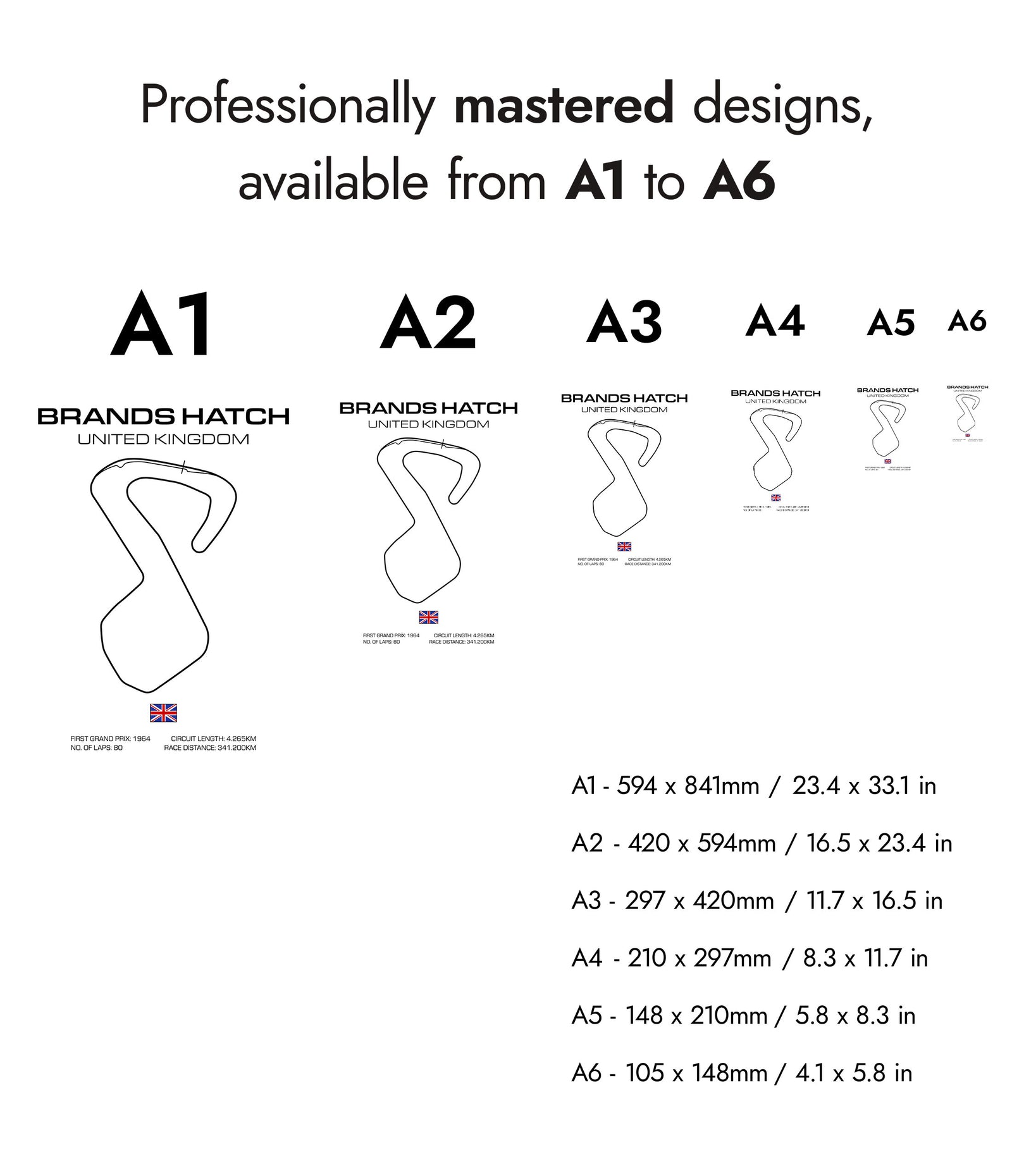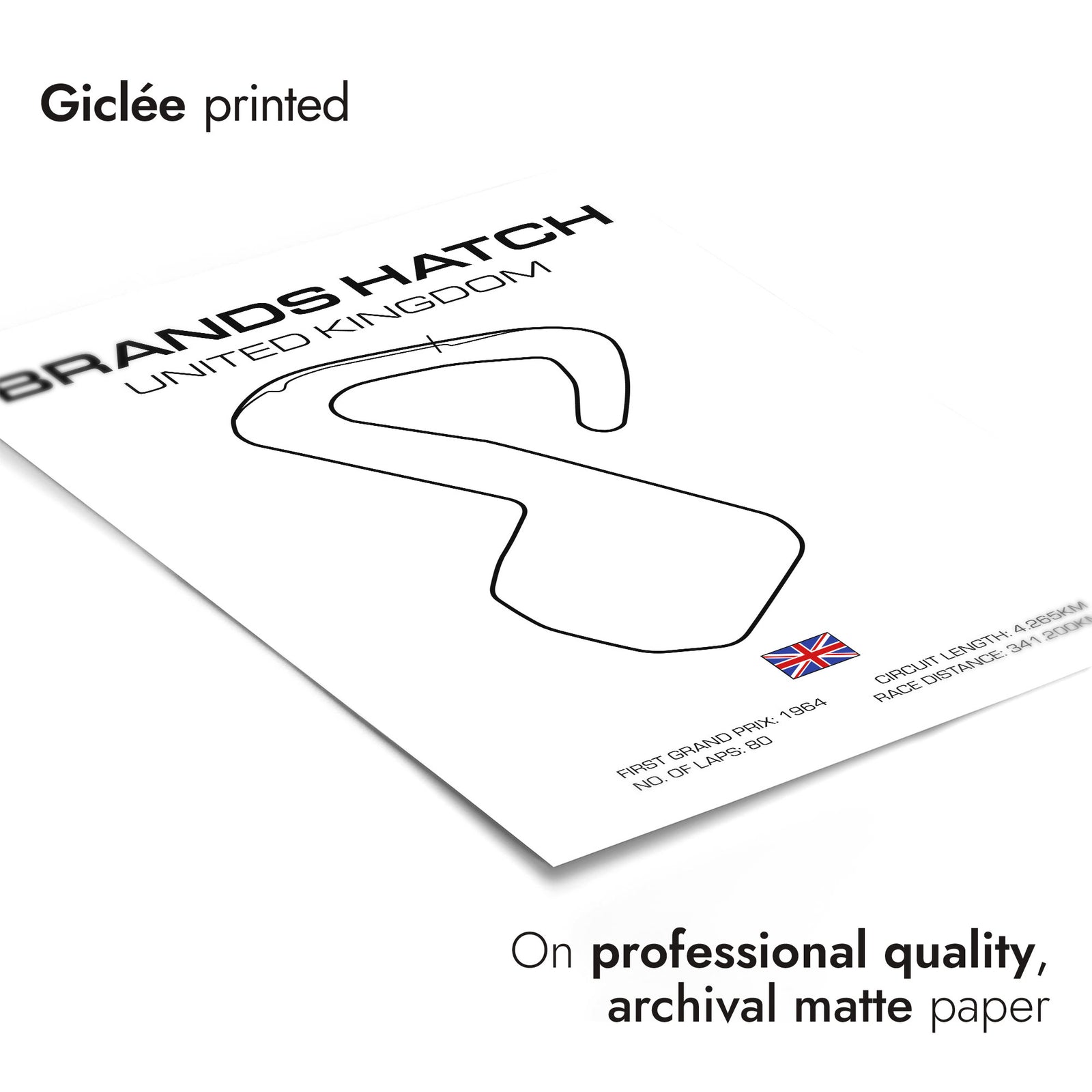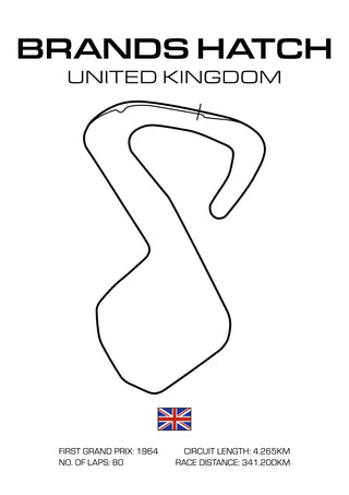 Celebrate the thrill of British motorsport with this Brands Hatch Grand Prix poster. Featuring a sleek line art illustration of the iconic circuit, this modern design captures the essence of the historic track in Kent, United Kingdom. Ideal for Formula One and racing enthusiasts, this piece details the circuit length and race specifics, perfect for any motorsports collection.