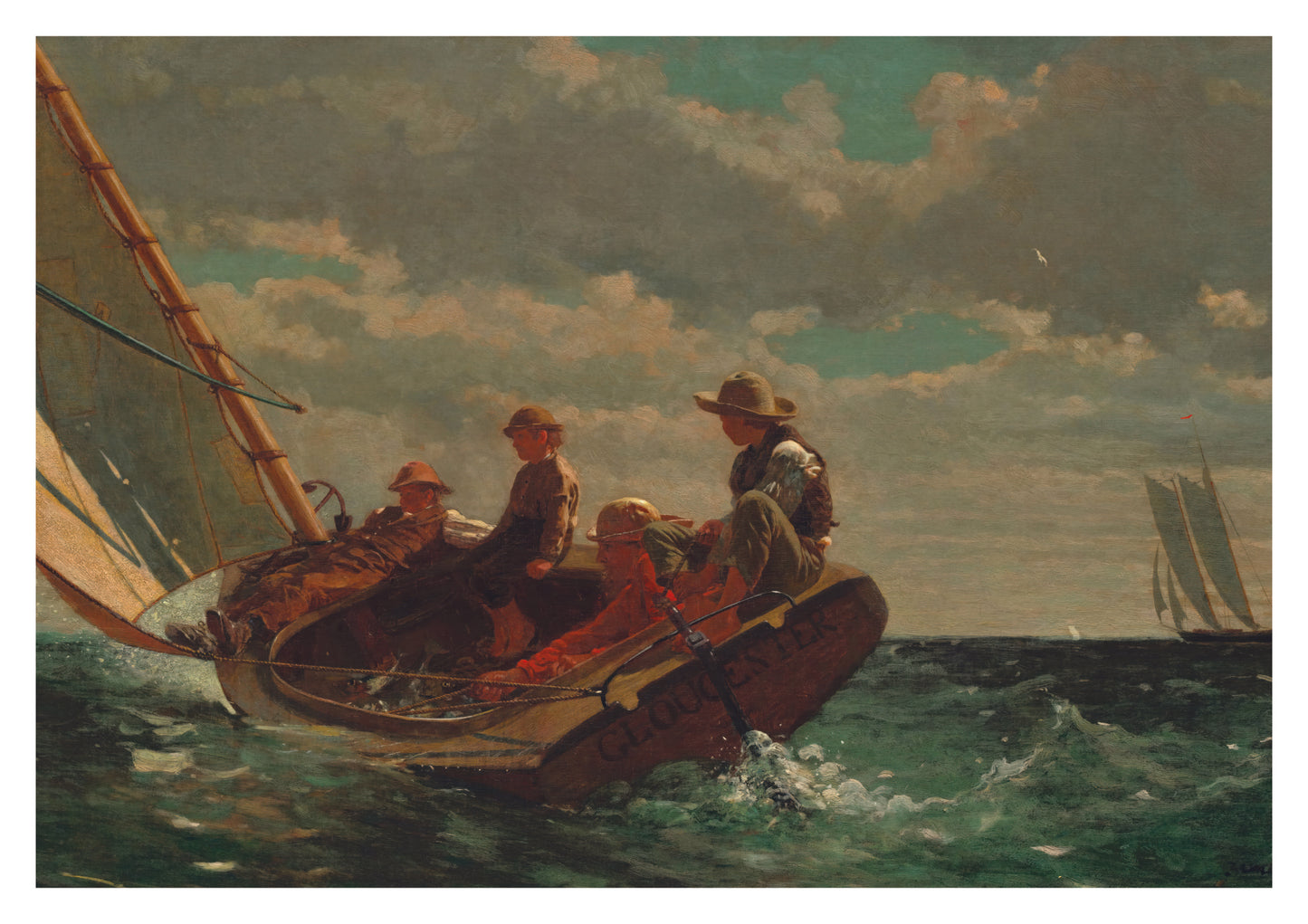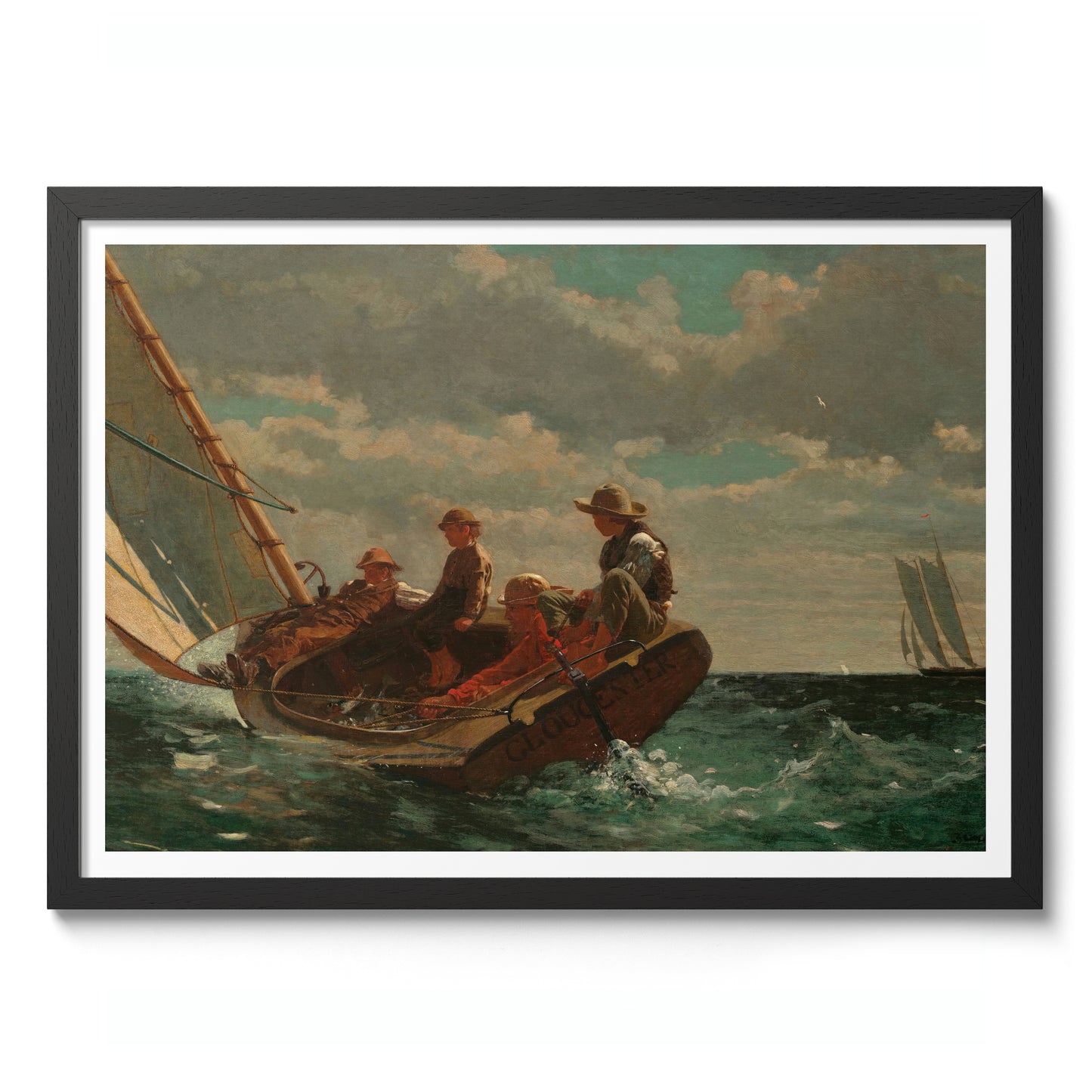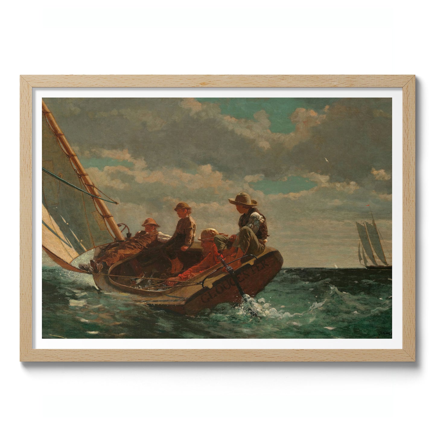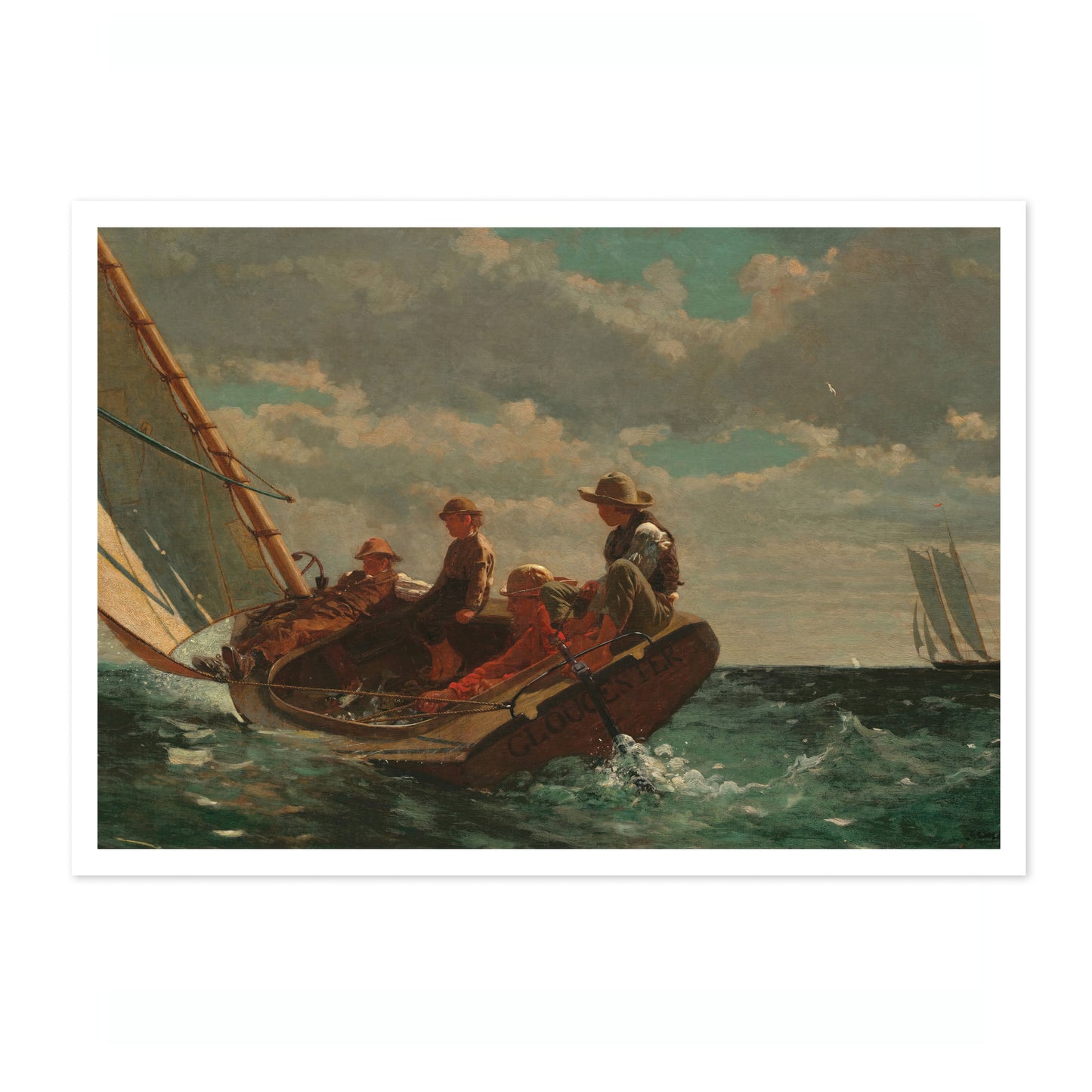 "Breezing Up (A Fair Wind)" poster by Winslow Homer captures a dynamic maritime scene featuring a small sailboat navigating lively waters. The artwork, steeped in Realism, depicts a group of sailors, masterfully portraying the essence of seafaring adventure and the invigorating challenge of the waves. Ideal for enthusiasts of nautical decor and classic realism paintwork.