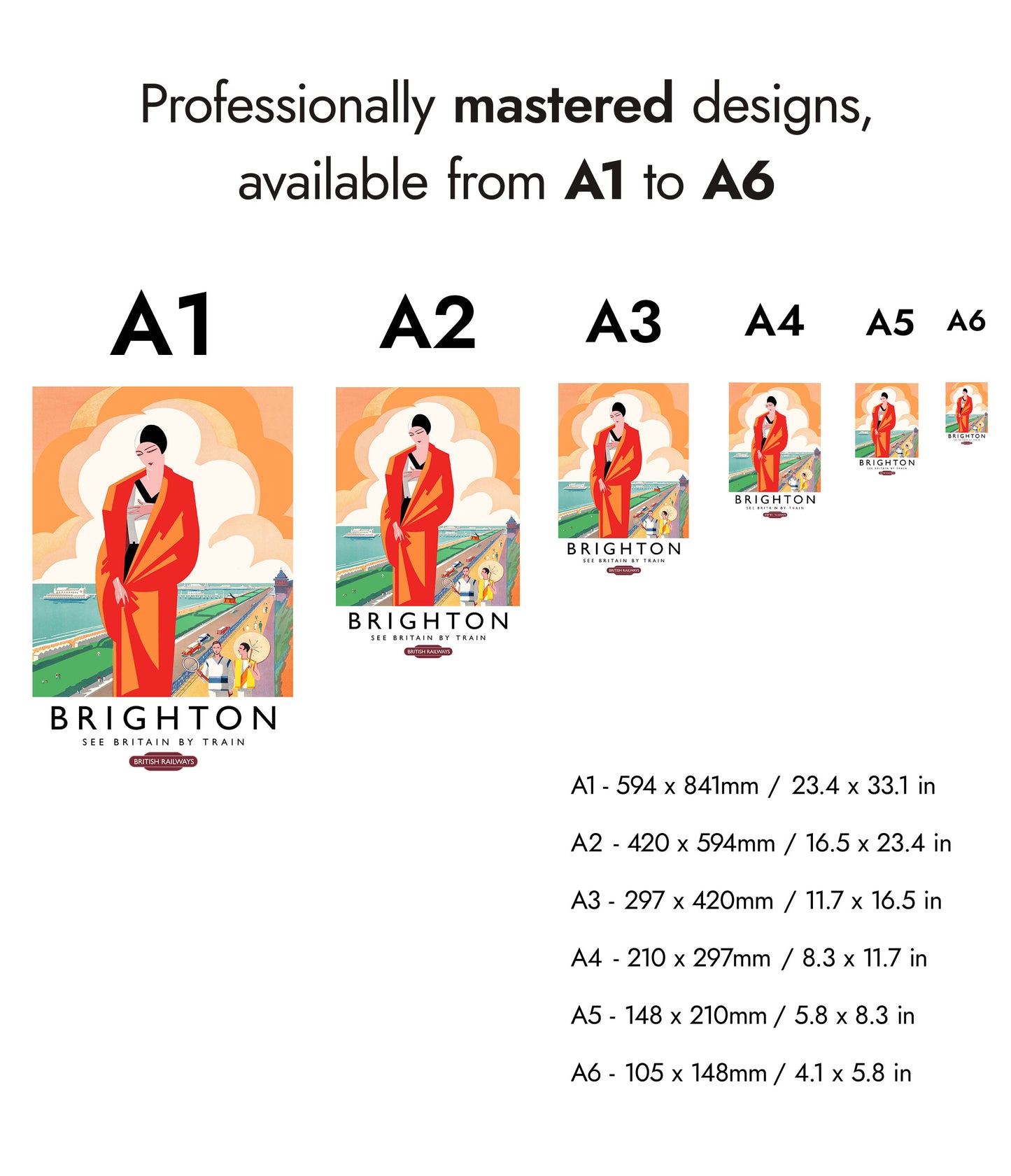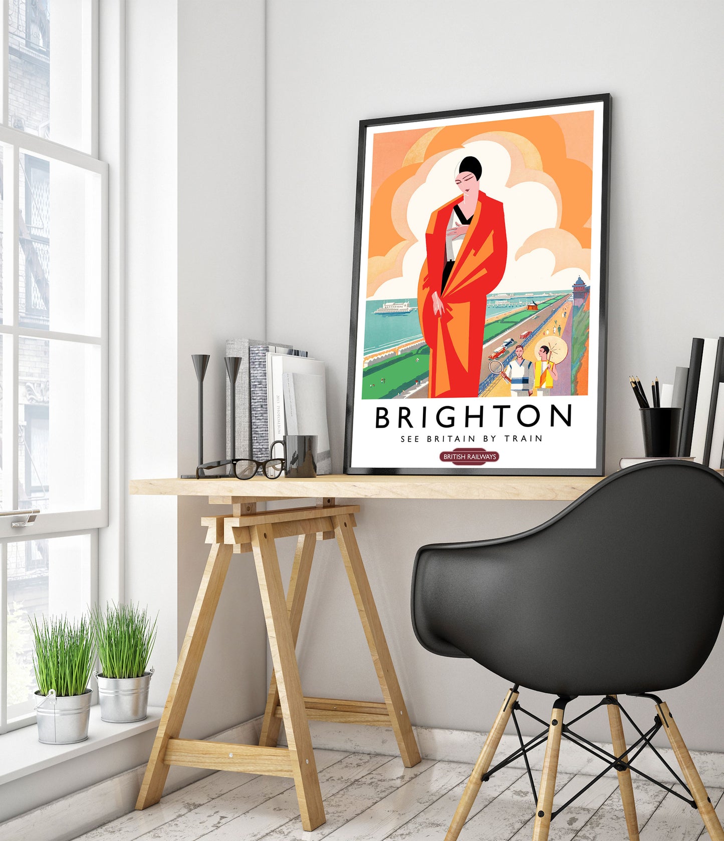 This vintage-style illustration poster showcases Brighton's seaside charm with a striking woman in red set against a vibrant beachscape. The art captures the essence of a sunny day on the Sussex coast, complete with the iconic pier and beachgoers. Ideal for travel enthusiasts and lovers of classic British railway posters, this print beautifully encapsulates Brighton's allure.