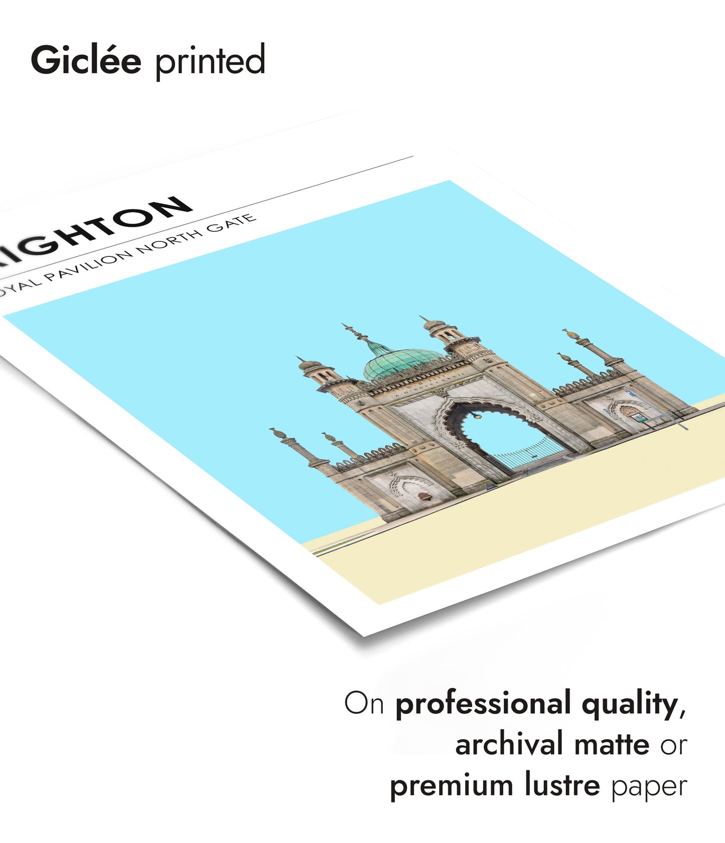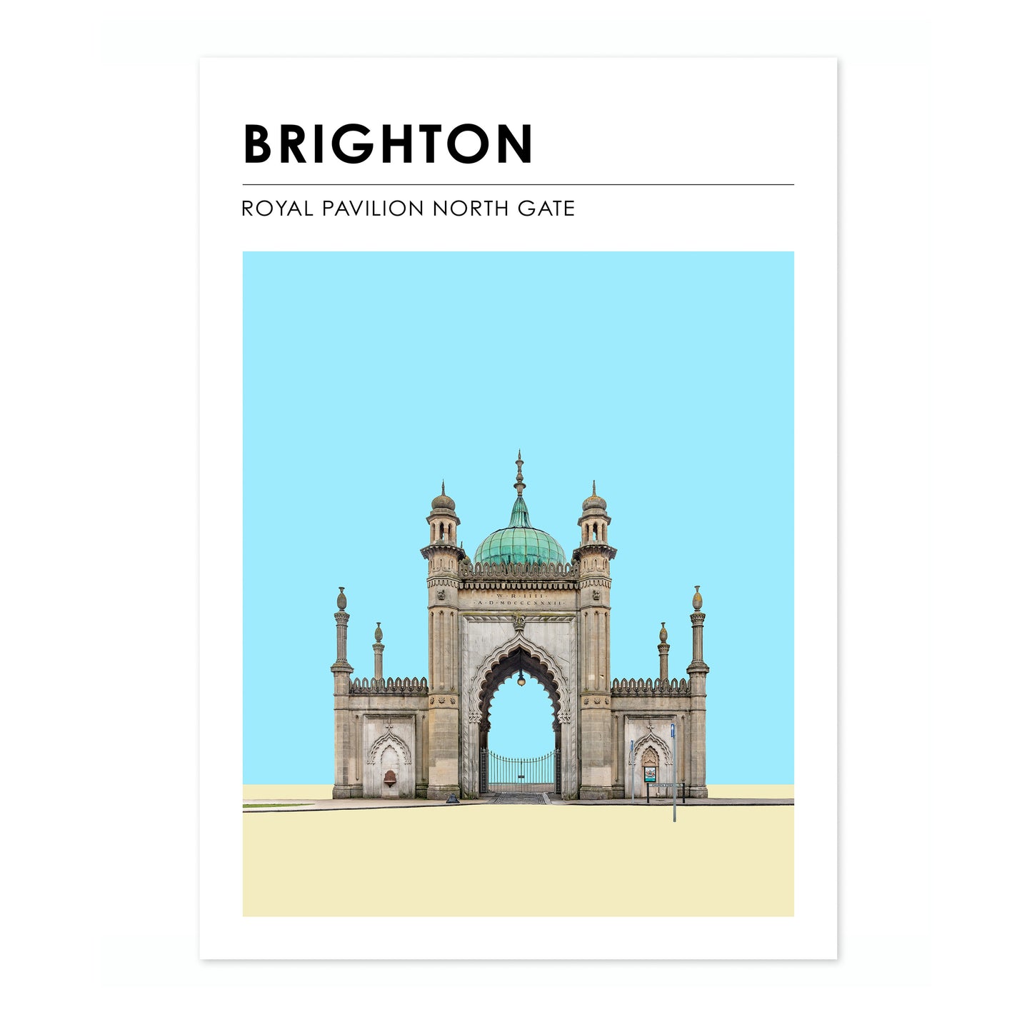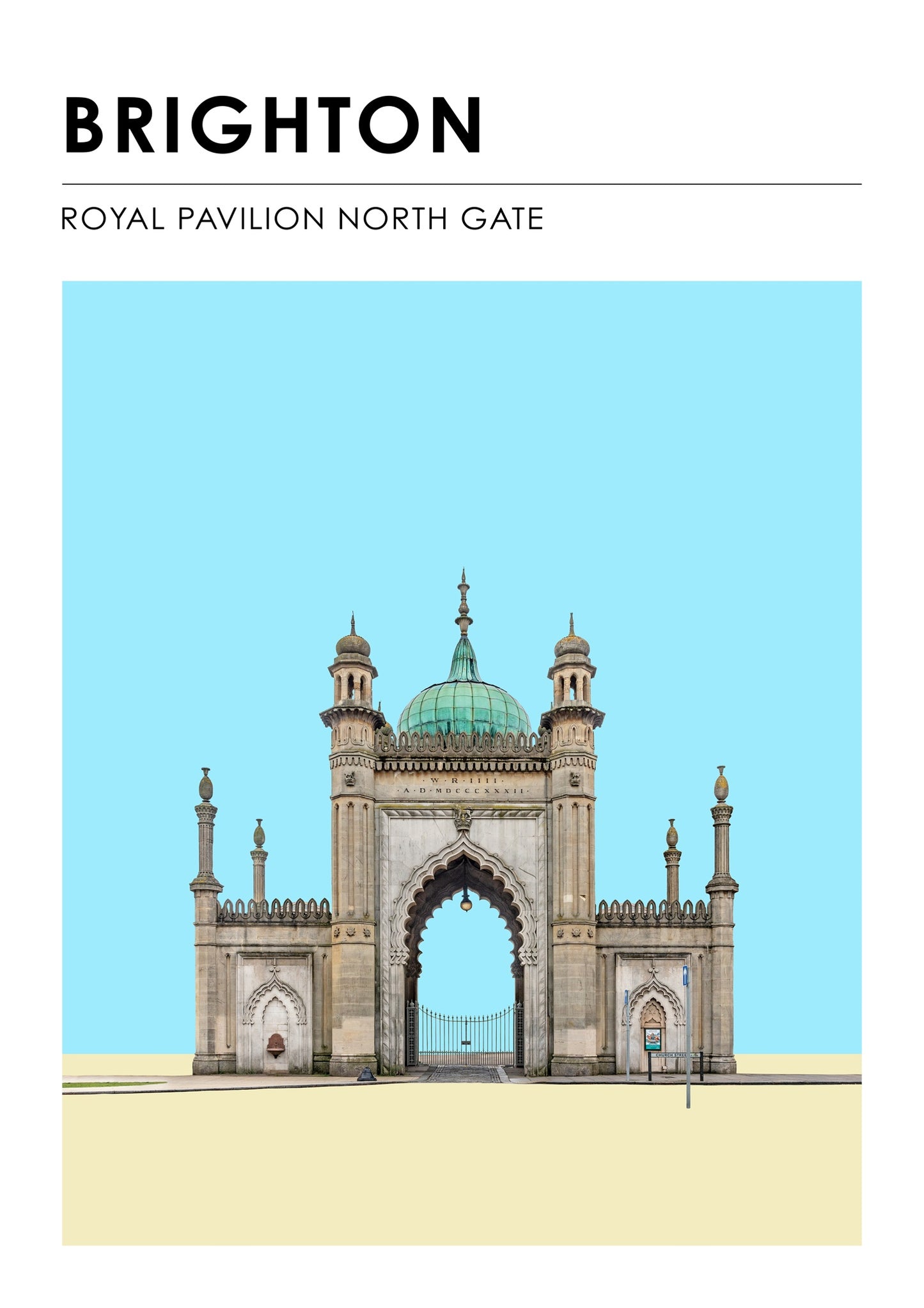 This vibrant poster of the Brighton Pavilion North Gate, designed by Katy Donaldson, captures the iconic architecture of this historical site. With a minimalist and modern graphic style, the artwork highlights the ornate details against a bright blue sky. Ideal for enthusiasts of architectural prints and anyone wanting to bring a piece of Brighton into their space.