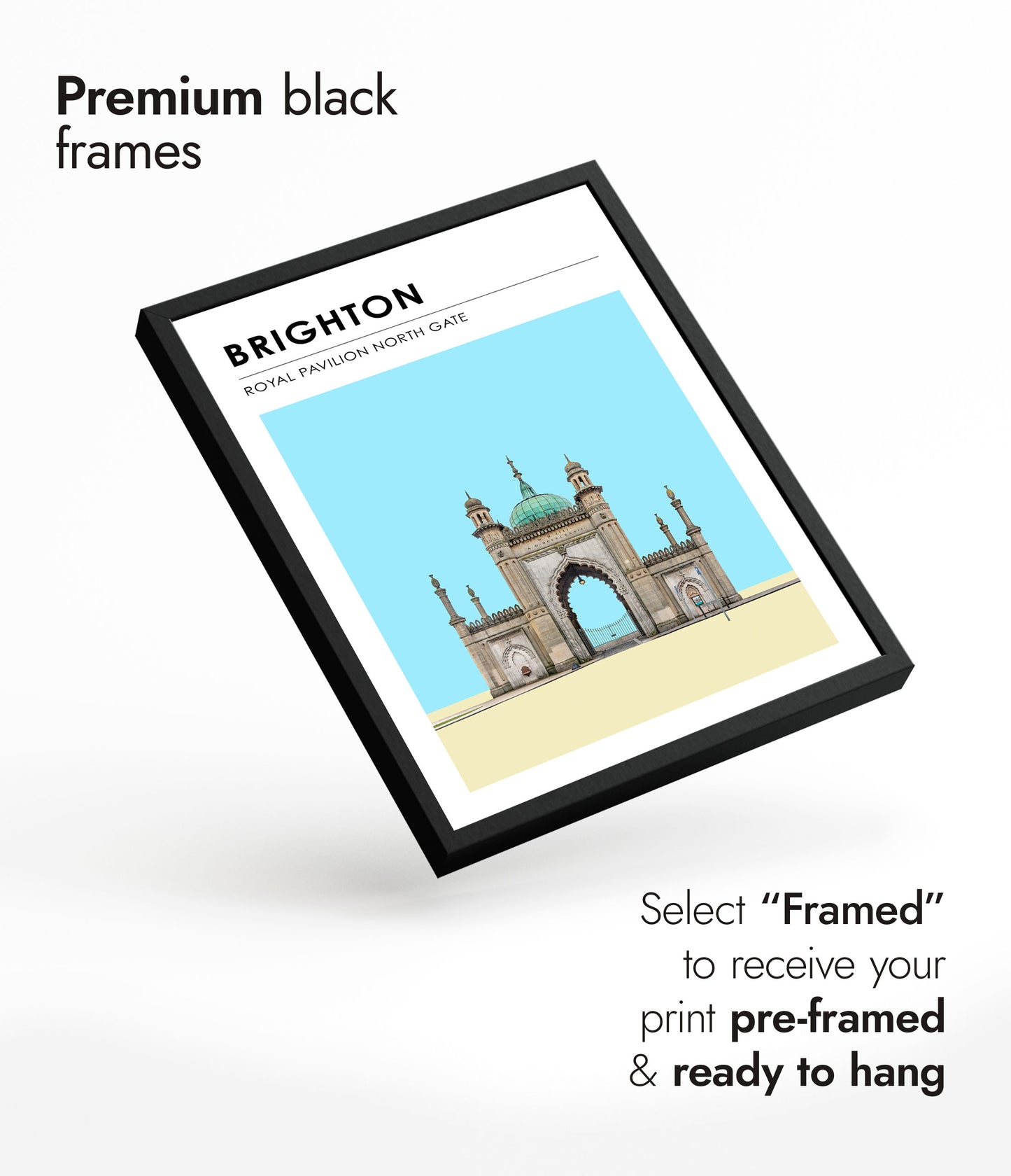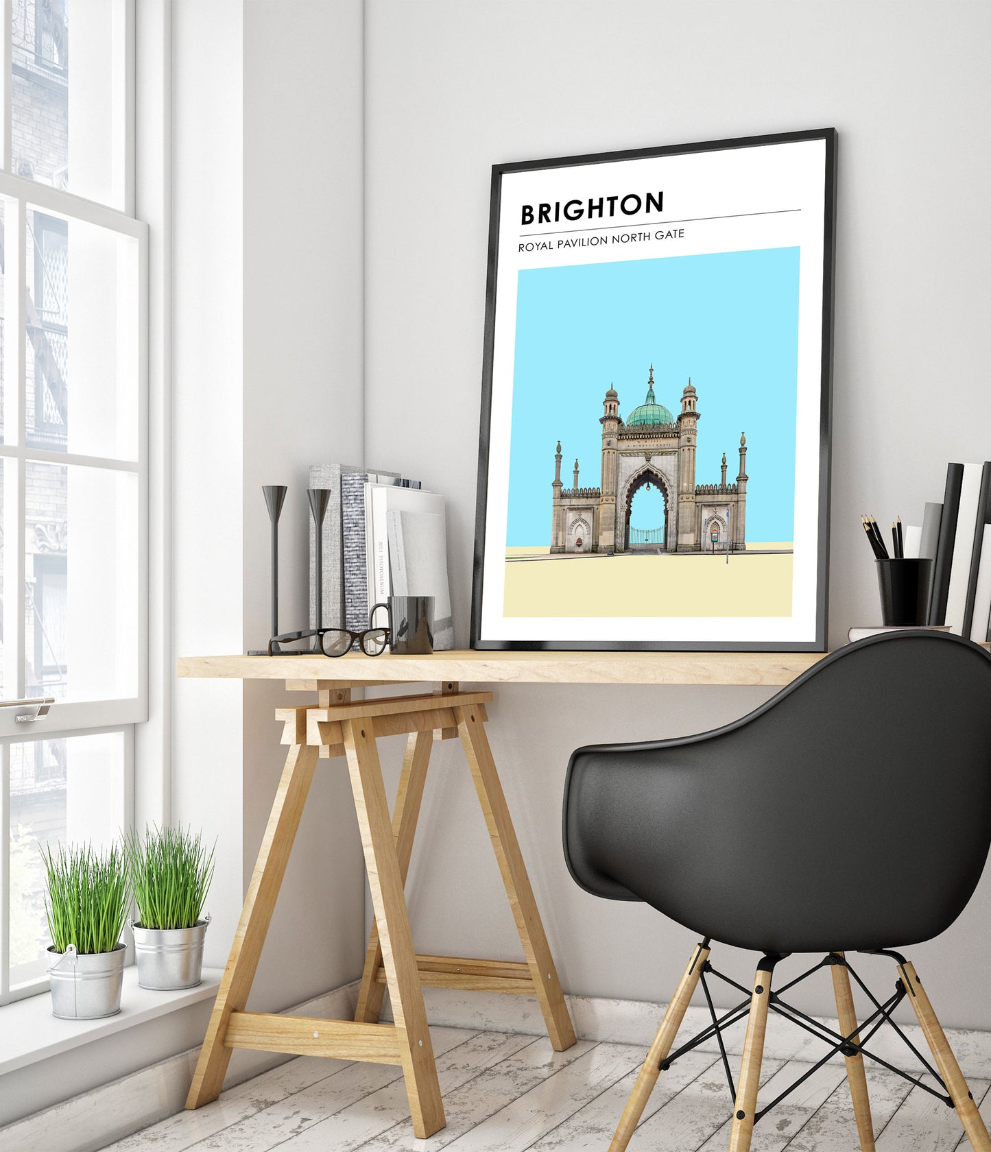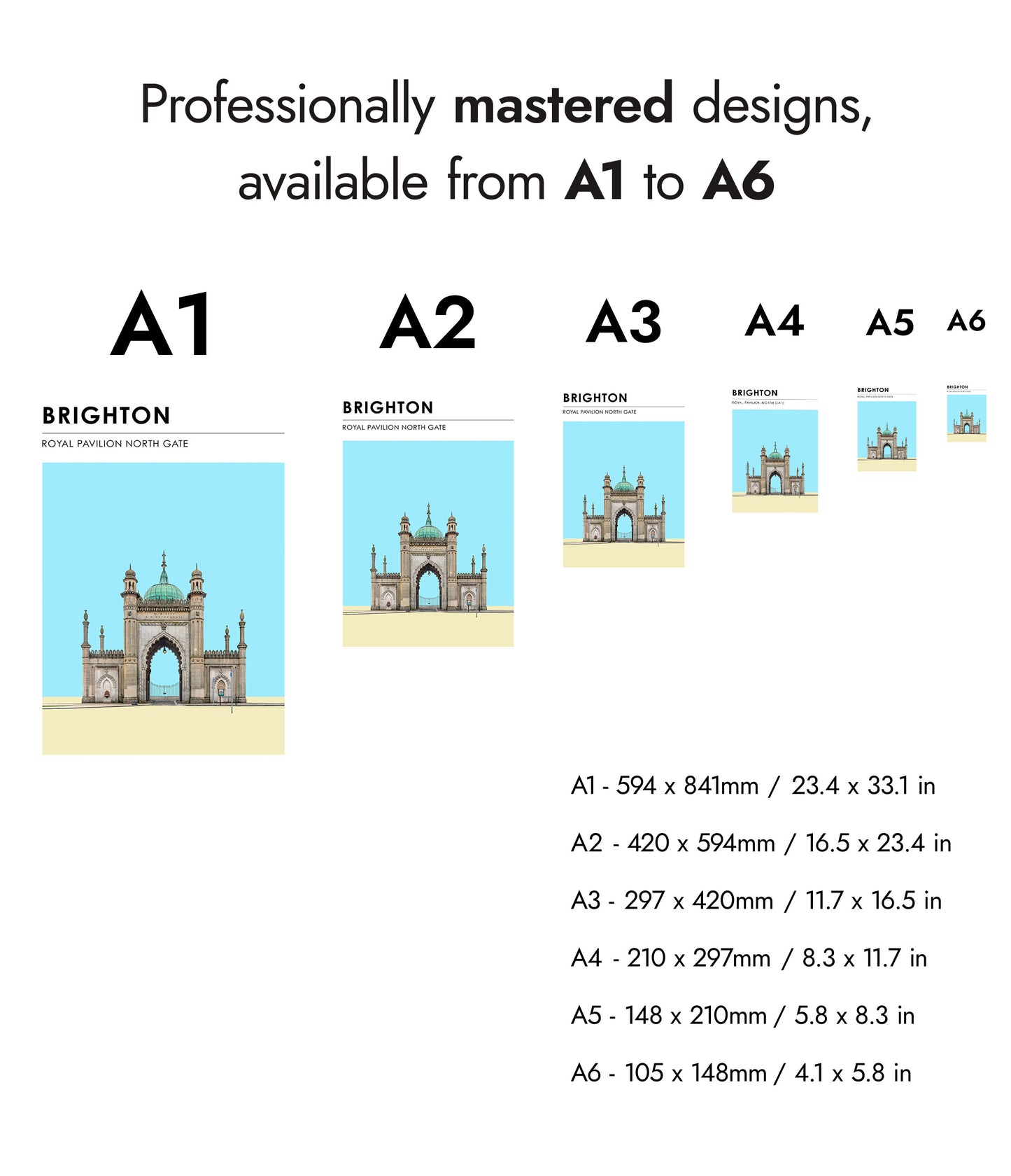 This vibrant poster of the Brighton Pavilion North Gate, designed by Katy Donaldson, captures the iconic architecture of this historical site. With a minimalist and modern graphic style, the artwork highlights the ornate details against a bright blue sky. Ideal for enthusiasts of architectural prints and anyone wanting to bring a piece of Brighton into their space.