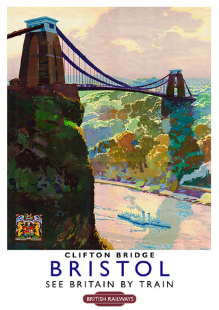 This vintage-style travel poster illustrates the iconic Clifton Suspension Bridge in Bristol, England. The detailed portrayal captures the bridge’s towering structure against a lush, forested cliffside. Below, a serene river winds through the picturesque landscape, dotted with boats. Ideal for fans of classic British railways and scenic vistas, this illustration highlights a key landmark in Bristol.
