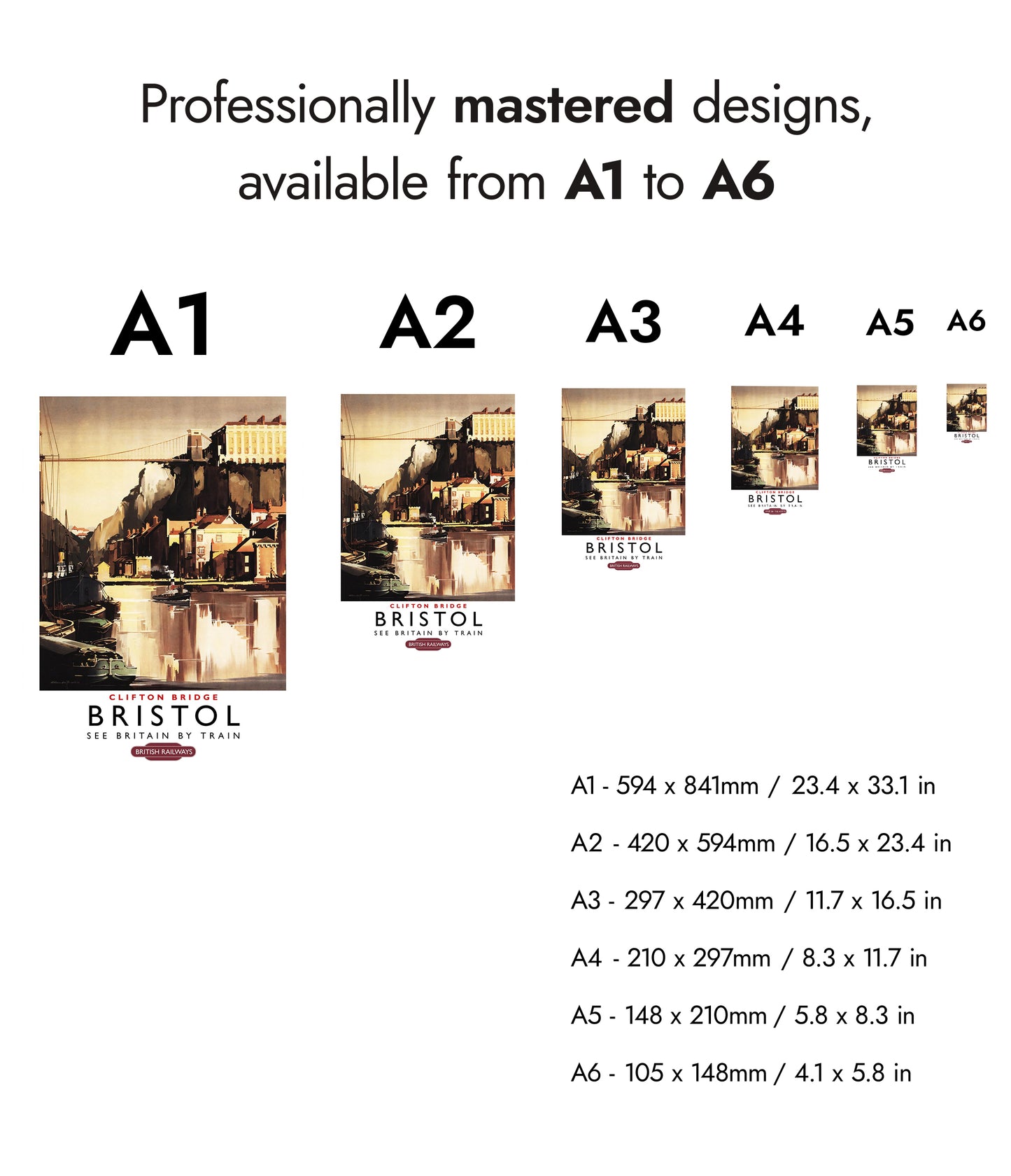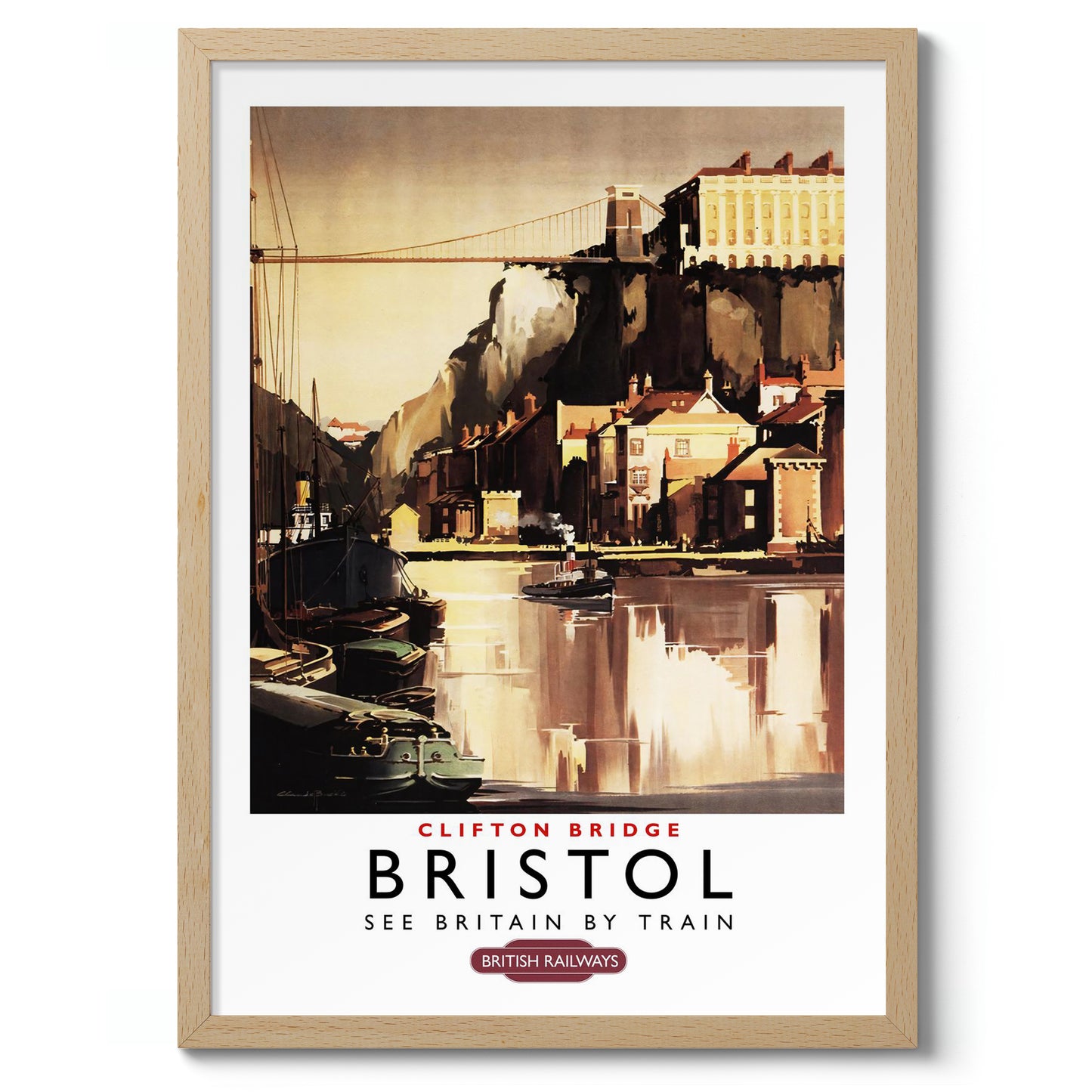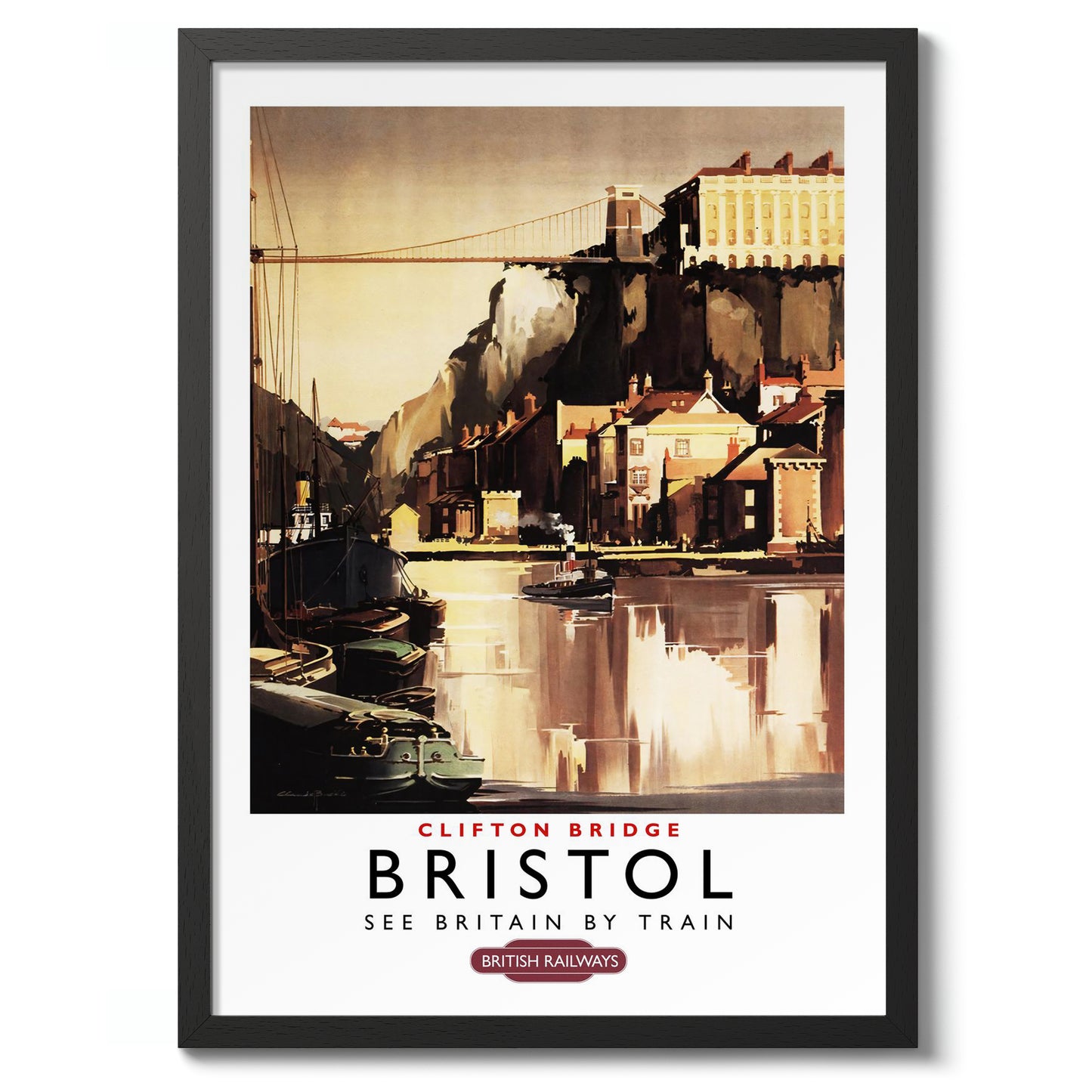 This vintage poster, "Bristol, Clifton Bridge," depicts the picturesque scene of Bristol's famous Clifton Suspension Bridge and the tranquil river flowing below. Featuring a classic illustration style, the artwork captures the architectural beauty and serene vibe of the area. Rich in brown and beige tones, it's an ideal piece for those drawn to England's iconic landscapes and railway heritage.