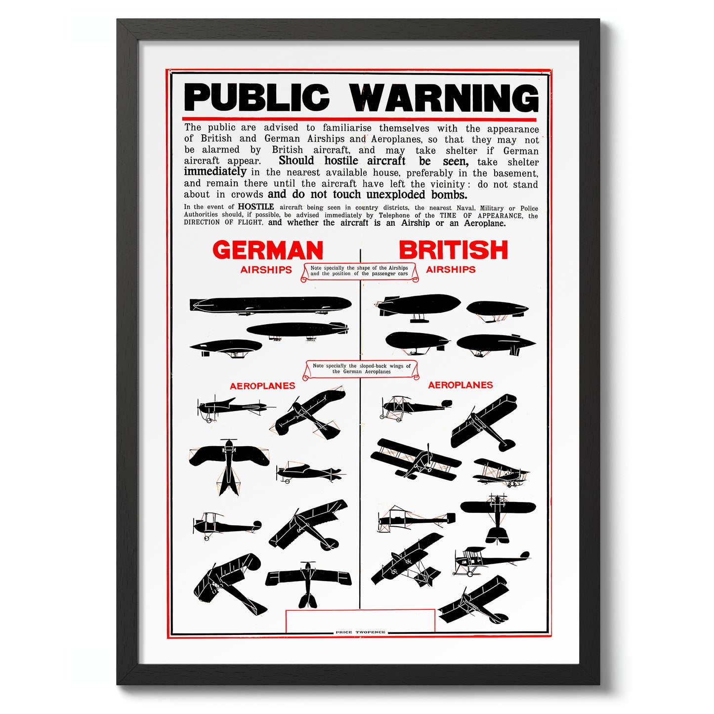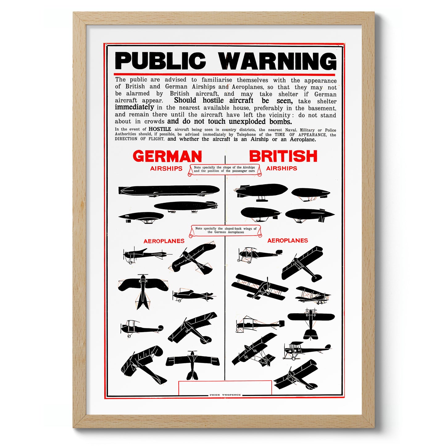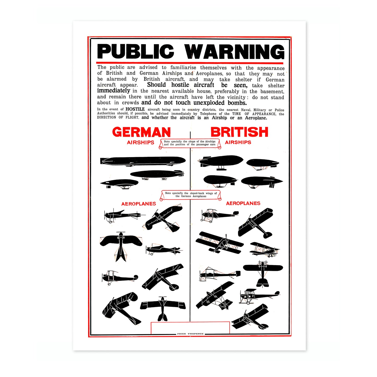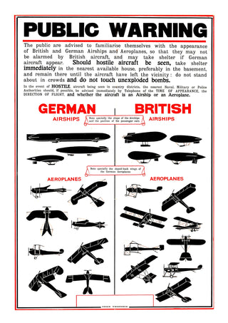 This vintage propaganda poster, titled "British Wartime Civilian Guide," features detailed illustrations of German and British airships and aeroplanes. Designed to educate civilians during wartime, it provides visual comparisons between enemy and friendly aircraft. The graphic style and historical context make this a compelling piece for vintage war art enthusiasts. Ideal for adding a wartime historical touch to any space.