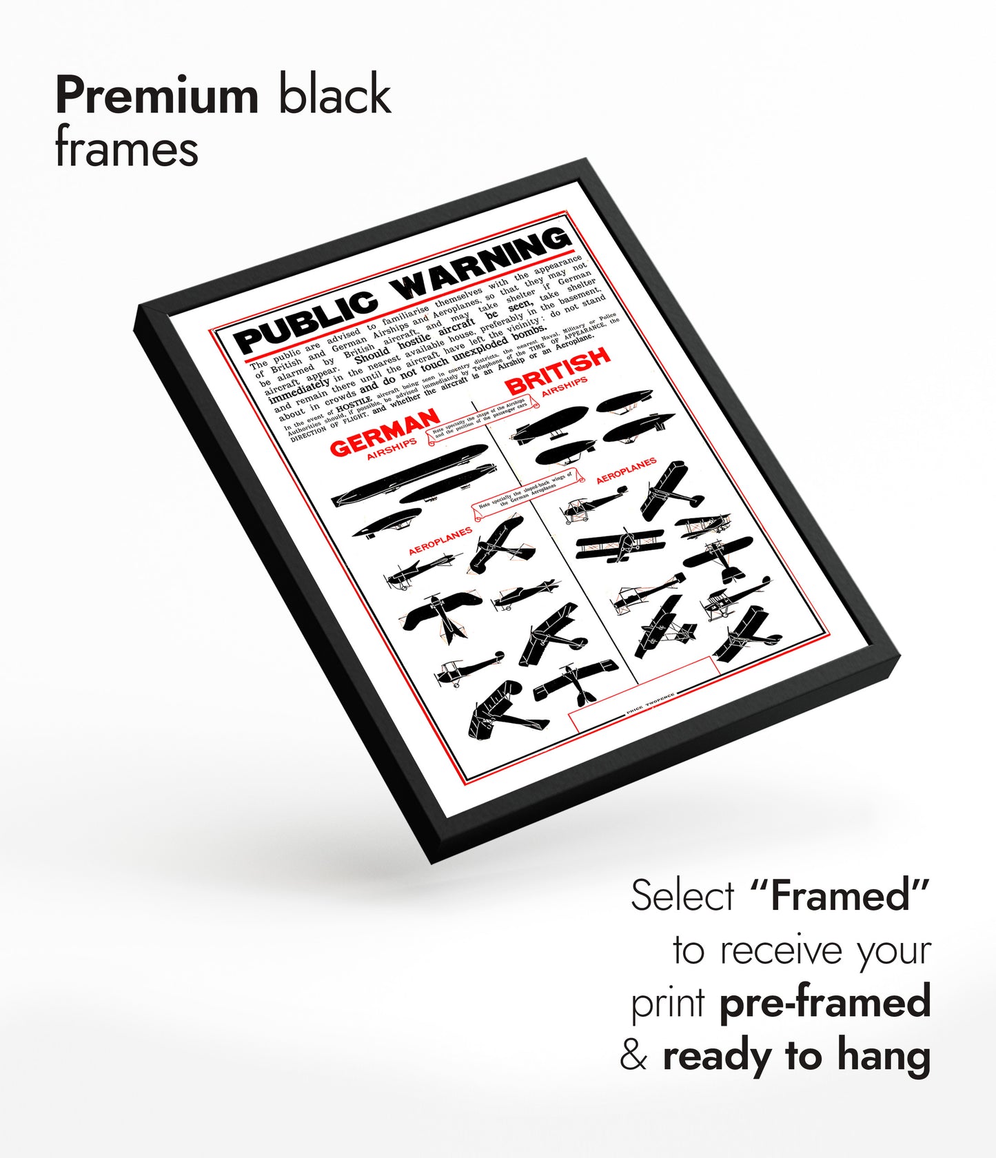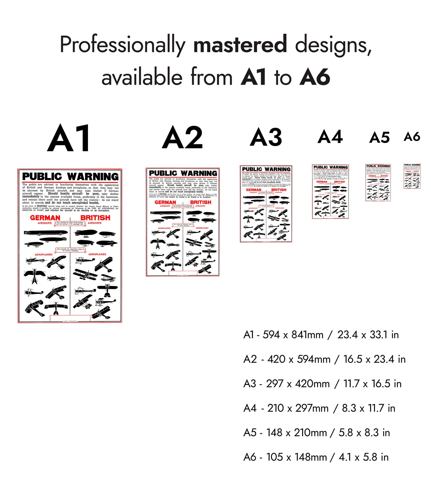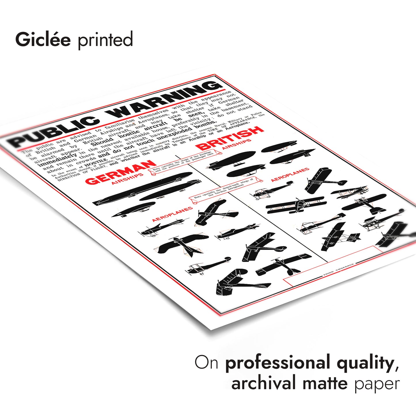 This vintage propaganda poster, titled "British Wartime Civilian Guide," features detailed illustrations of German and British airships and aeroplanes. Designed to educate civilians during wartime, it provides visual comparisons between enemy and friendly aircraft. The graphic style and historical context make this a compelling piece for vintage war art enthusiasts. Ideal for adding a wartime historical touch to any space.
