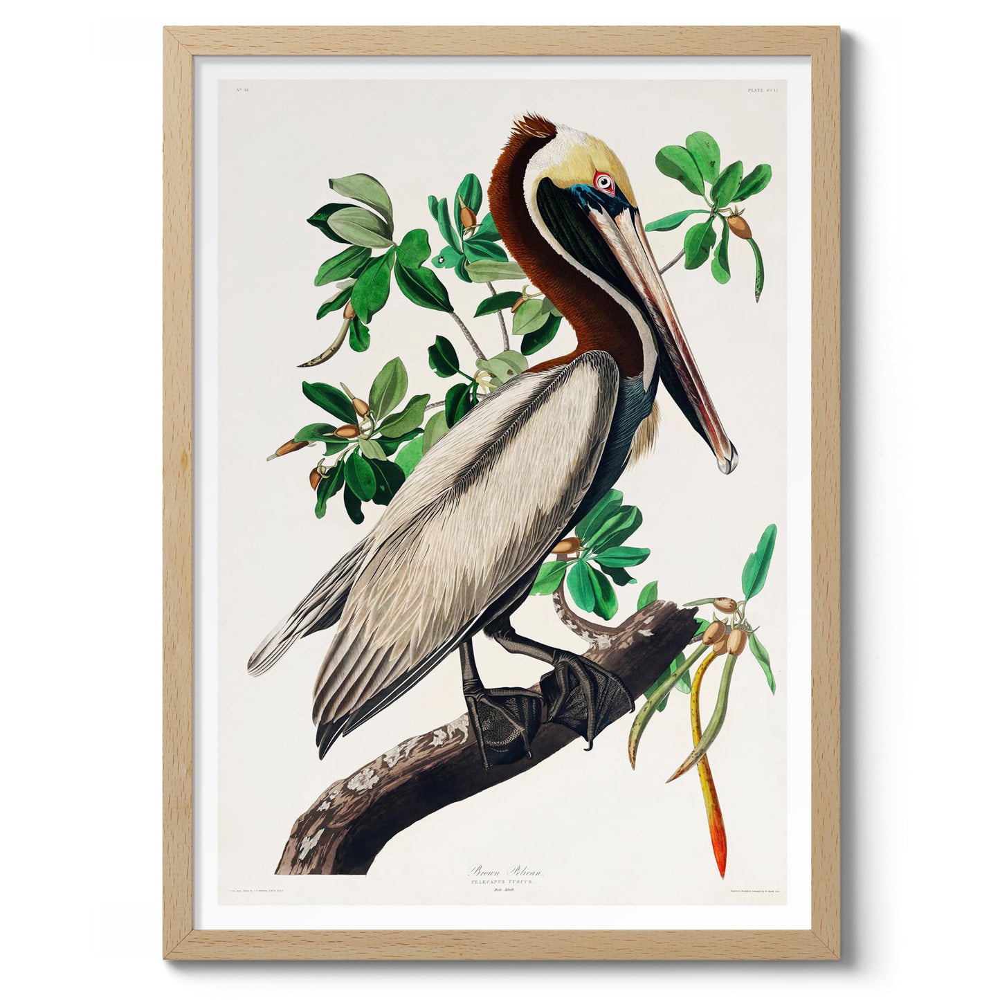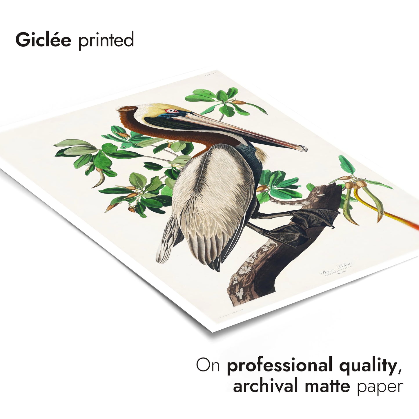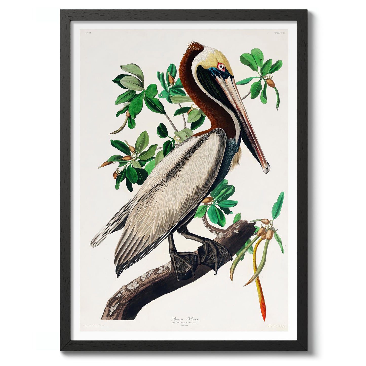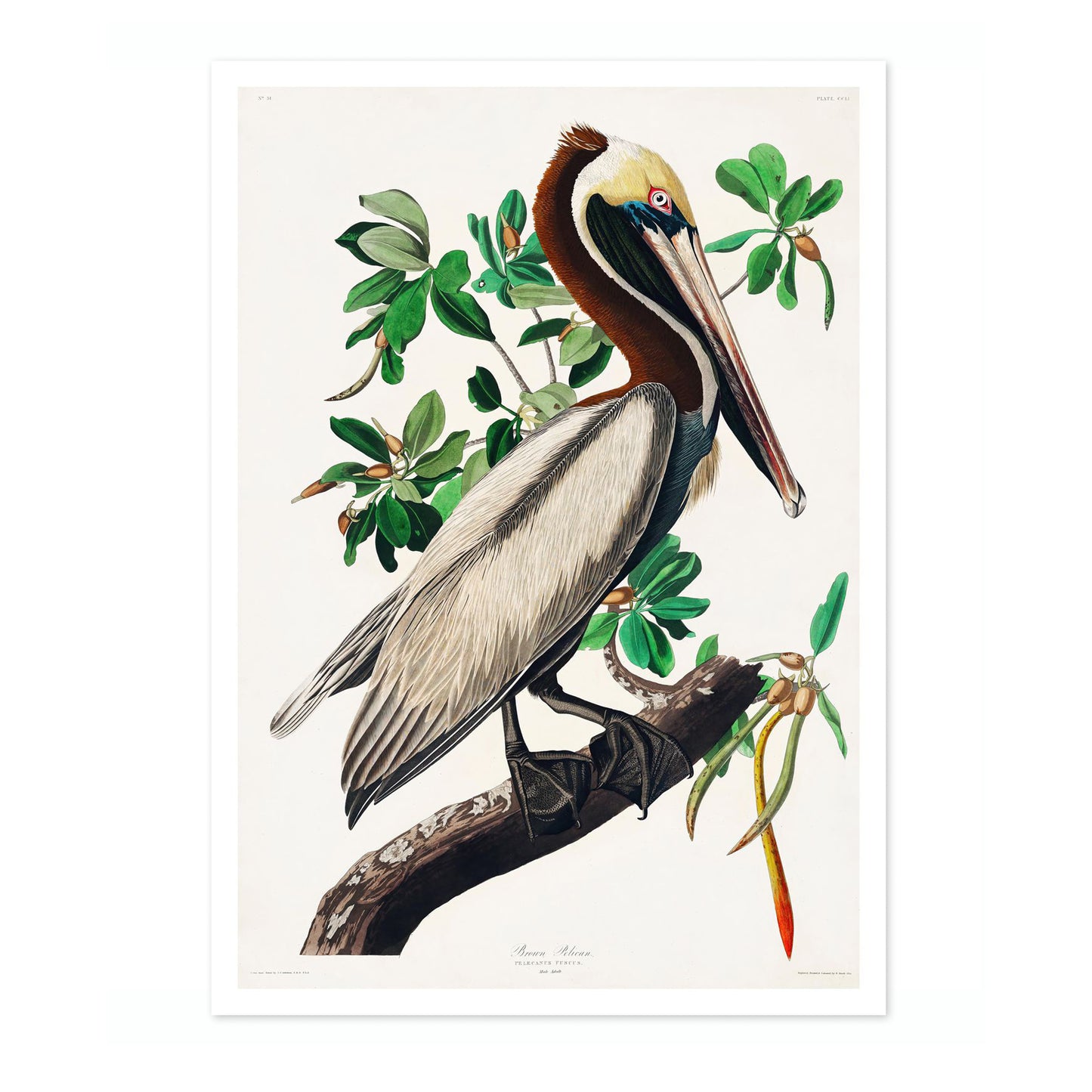 This vintage poster features a detailed illustration of a Brown Pelican, masterfully captured by John Audubon. The pelican is perched on a branch amidst vibrant green foliage, showcasing its striking plumage and long beak. This nature-themed art print is perfect for adding a touch of zoological charm to any space, with its intricate detailing and classic appeal.