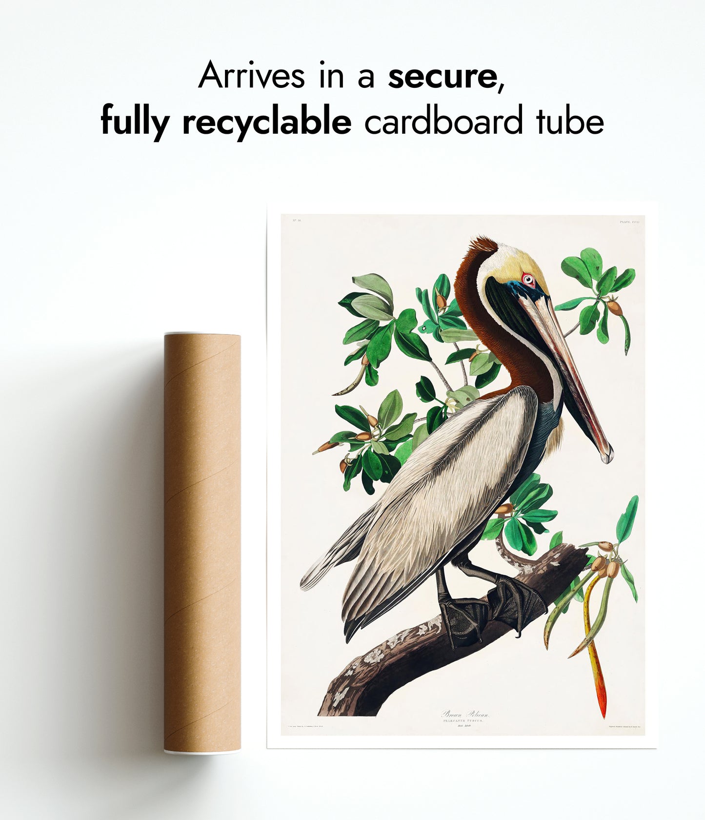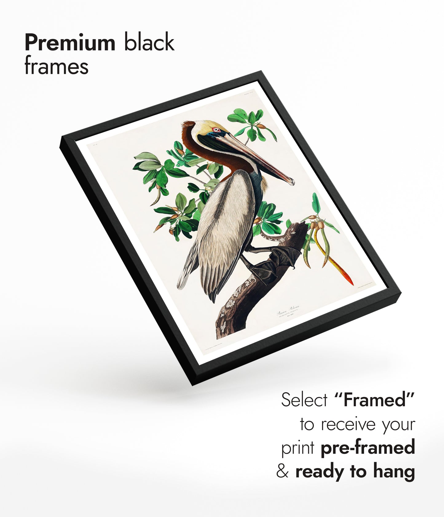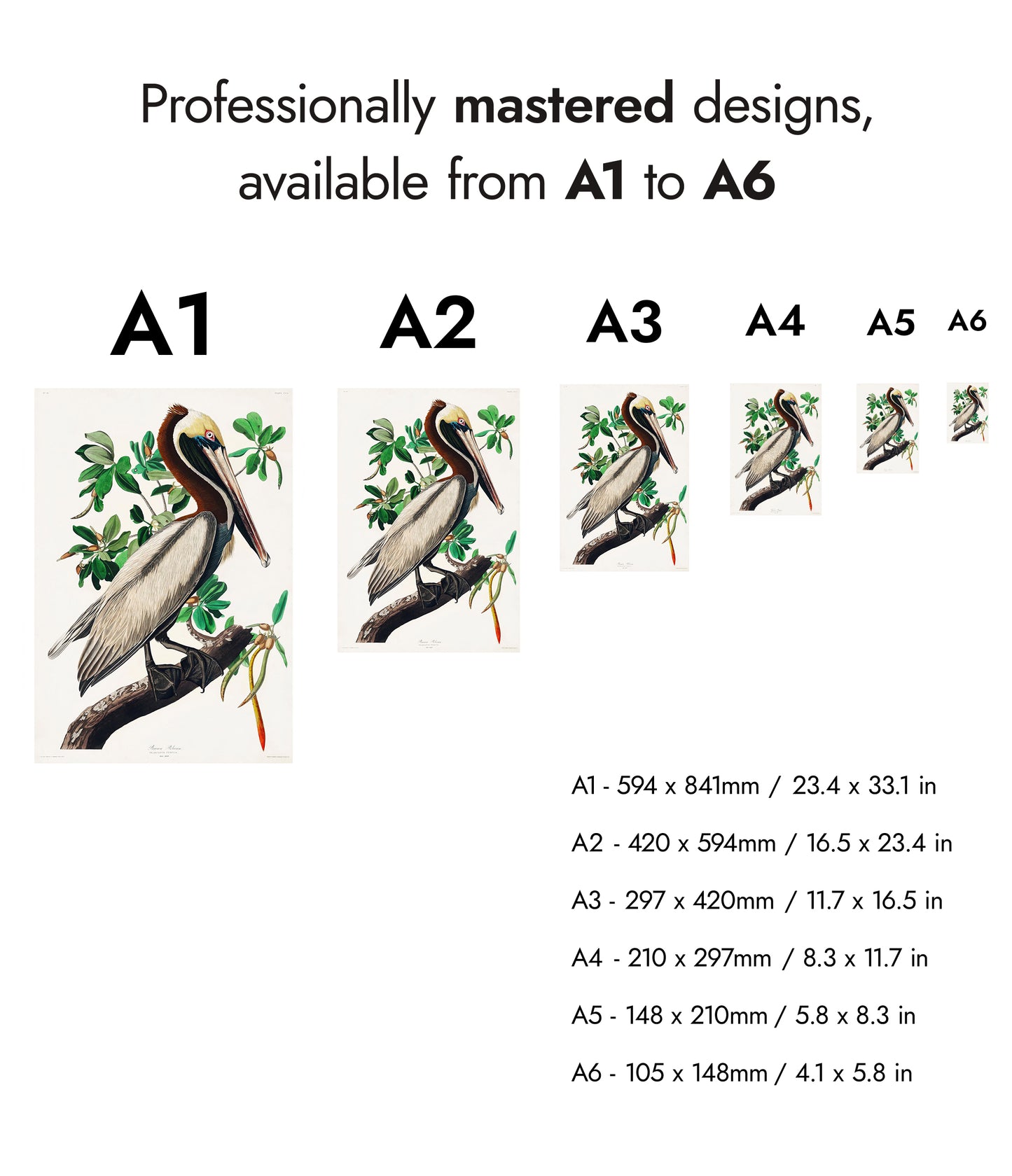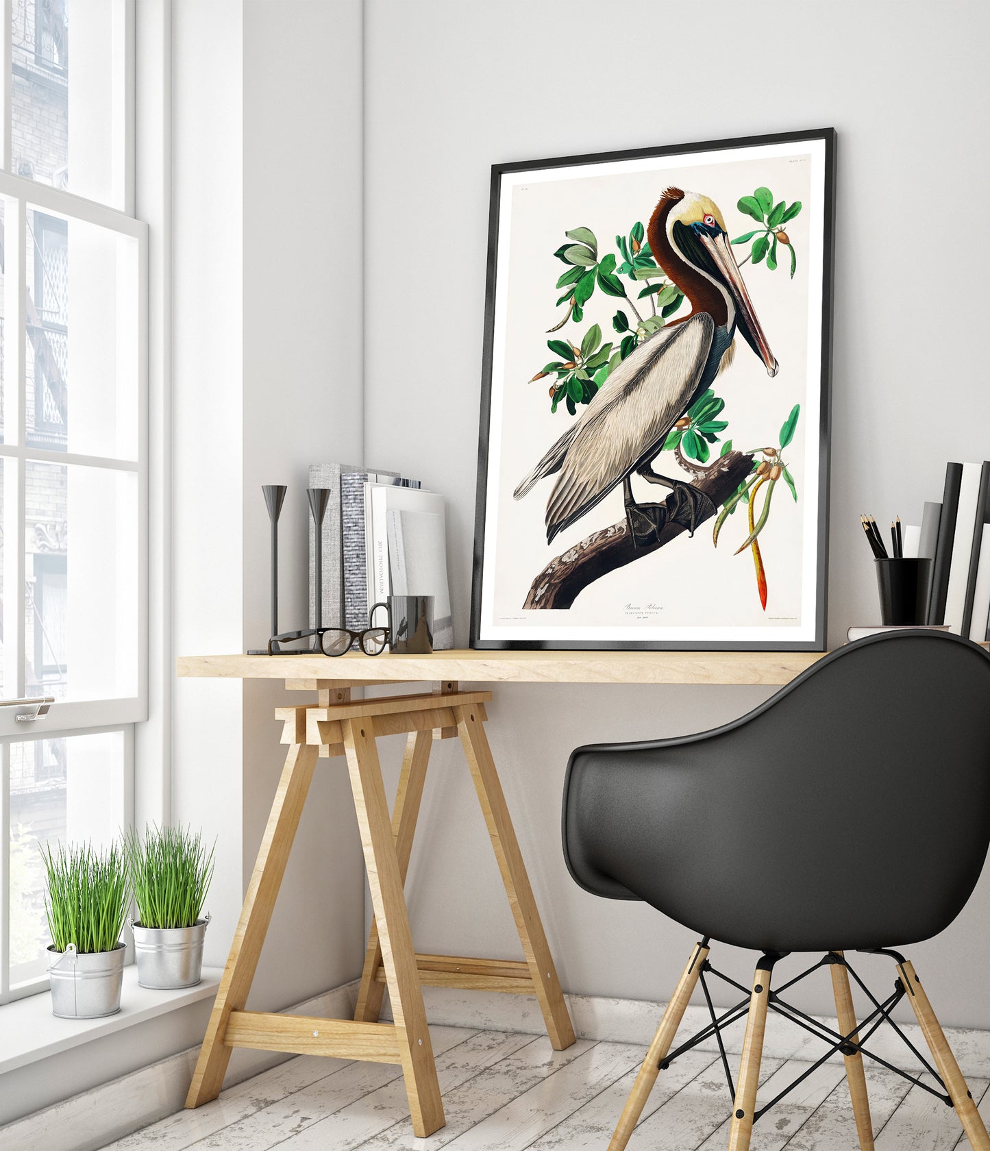 This vintage poster features a detailed illustration of a Brown Pelican, masterfully captured by John Audubon. The pelican is perched on a branch amidst vibrant green foliage, showcasing its striking plumage and long beak. This nature-themed art print is perfect for adding a touch of zoological charm to any space, with its intricate detailing and classic appeal.