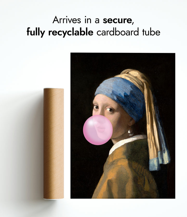 This playful poster reimagines the classic "Girl with a Pearl Earring" with a humorous twist. Featuring a young woman wearing a blue and gold turban, she cheekily blows pink bubblegum, blending timeless Dutch Golden Age elegance with modern humor. Perfect for adding a touch of whimsy to any space, this art print is ideal for those who appreciate clever art reinterpretations.