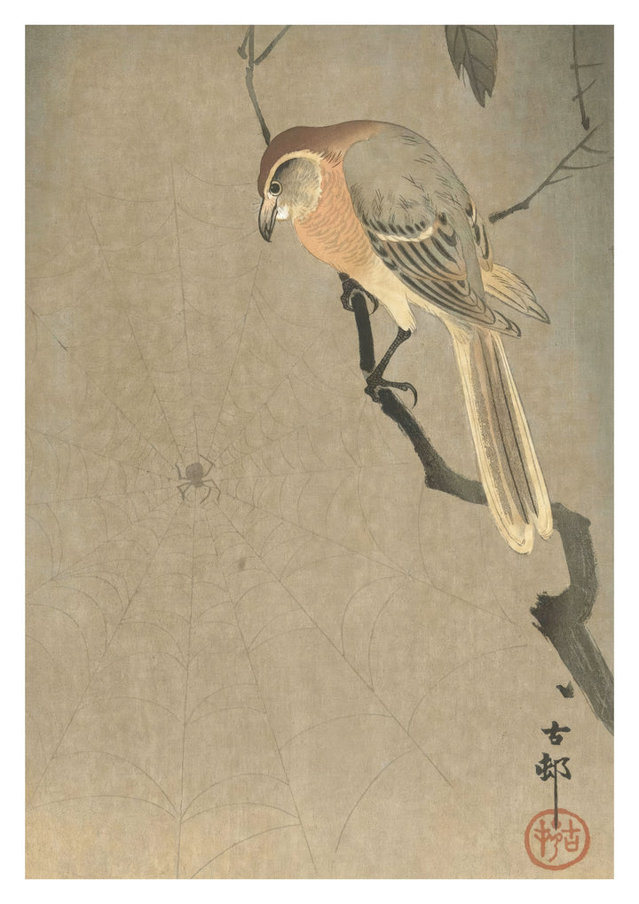 The "Buffalo-Headed Shrike & Spider" poster by Ohara Koson showcases a keen-eyed bird perched on a branch, gazing at a spider's intricate web. This traditional Japanese woodblock print offers a serene depiction of nature's delicate balance. Ideal for those appreciating Ukiyo-E or avian art, the muted tones emphasize the elegance of the shrike and spider.