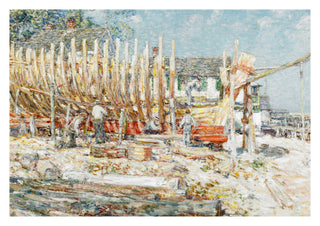"Building the Schooner, Provincetown" poster by Childe Hassam captures a bustling shipyard scene with meticulous impressionistic detail. This artwork features craftsmen constructing a schooner against the serene backdrop of a coastal village, blending vibrant colours and light. Ideal for those appreciating maritime history and impressionist landscapes.