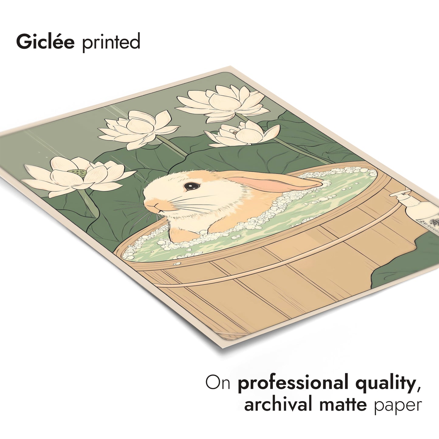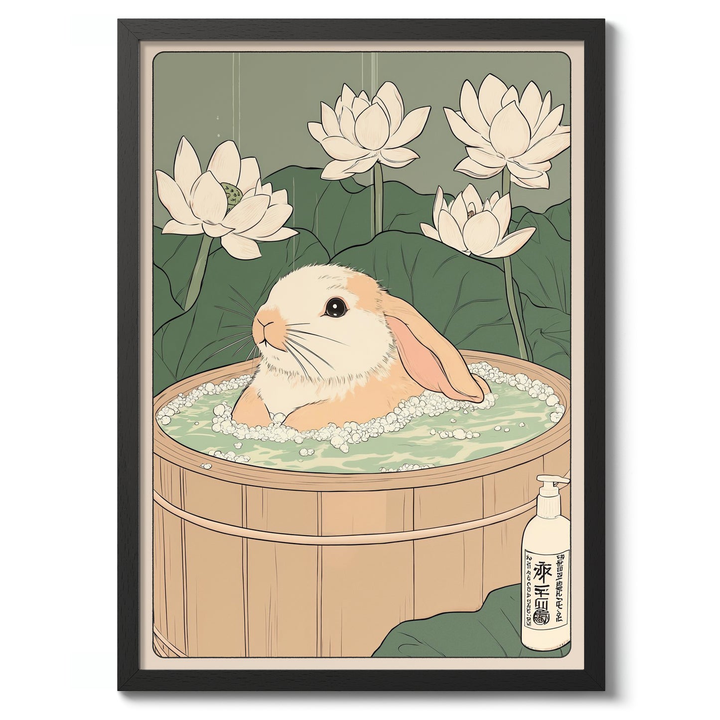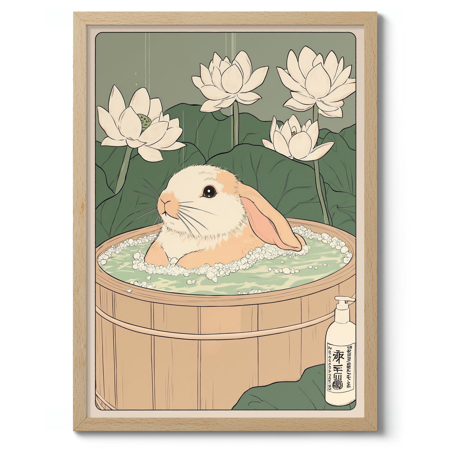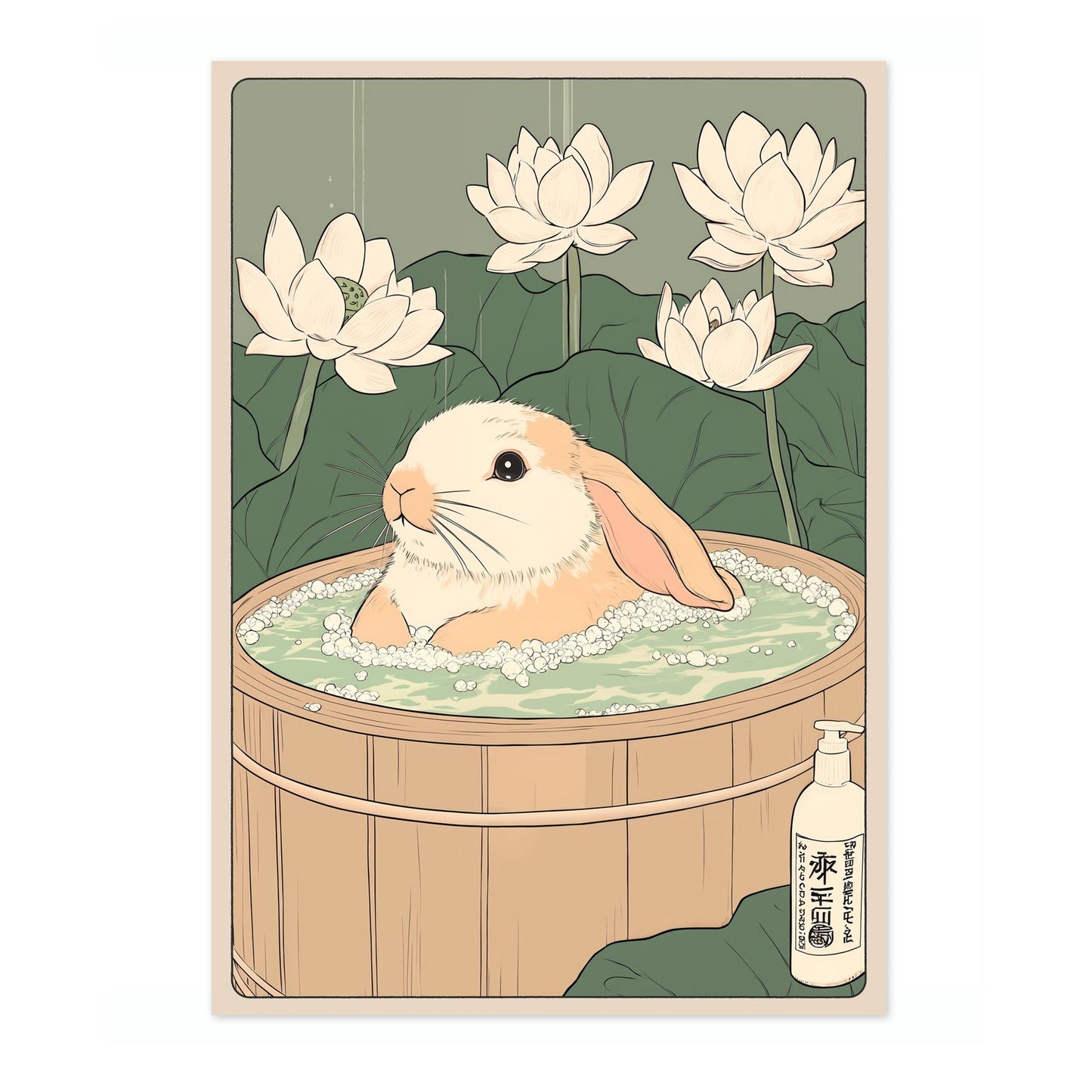 This art print titled "Bunny Rabbit Bathtime" features a charming rabbit enjoying a bath in a wooden tub surrounded by blooming lotus flowers. The illustration embraces a Japanese woodblock style, with muted beige tones enhancing its calming effect. Ideal for a poster display, this piece beautifully merges anime aesthetics with serene bath and animal themes. Perfect for enhancing bathroom decor.