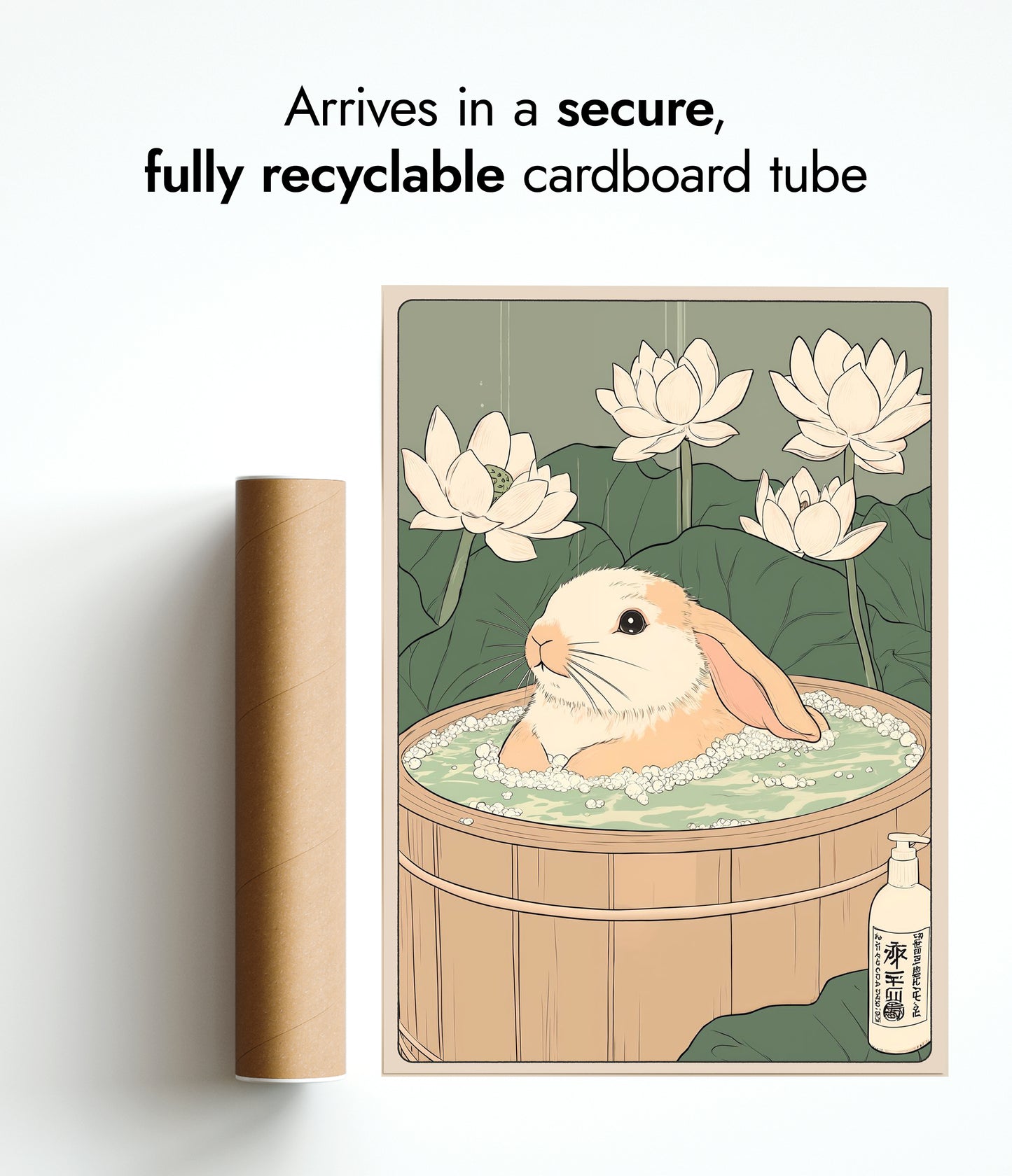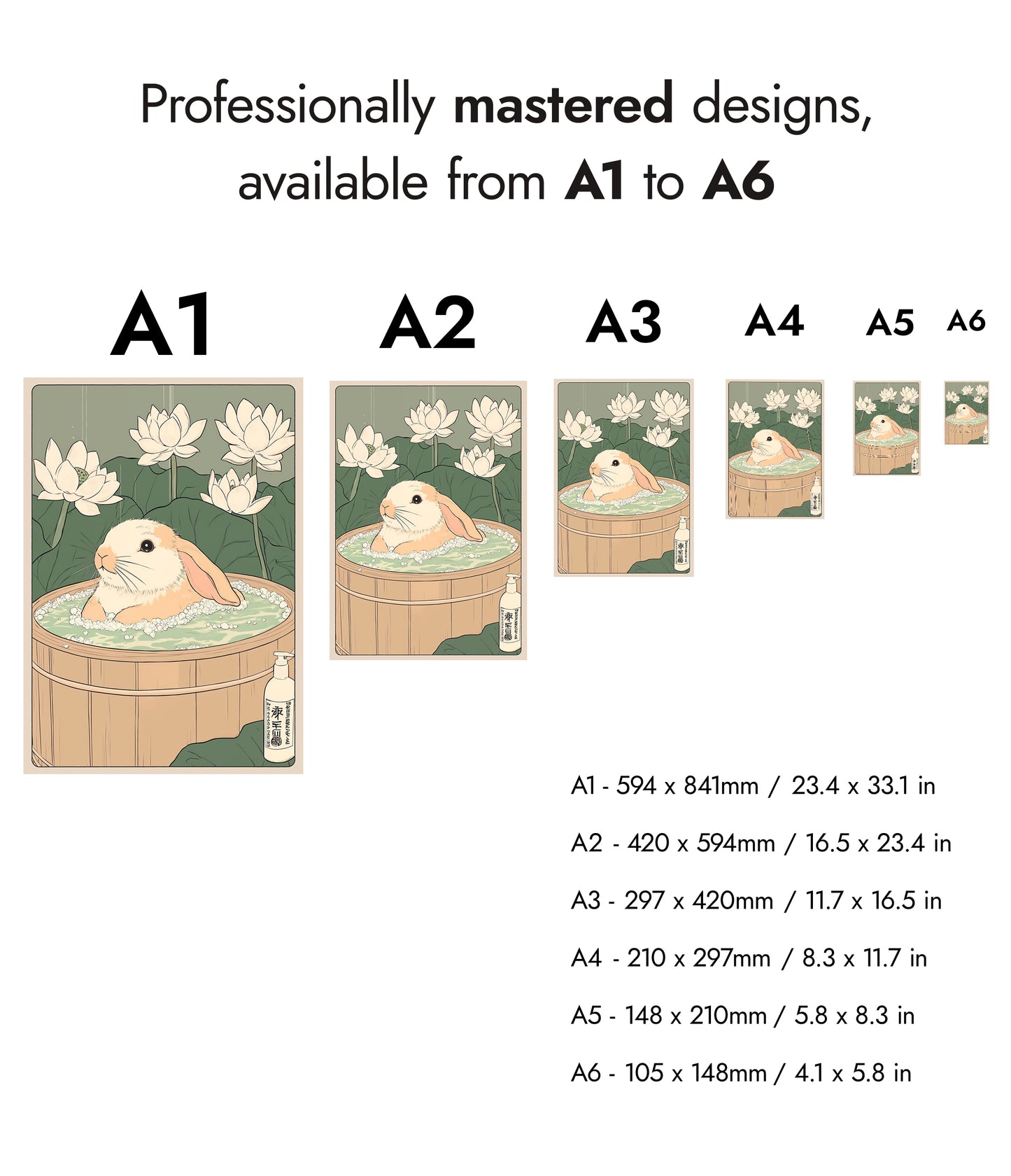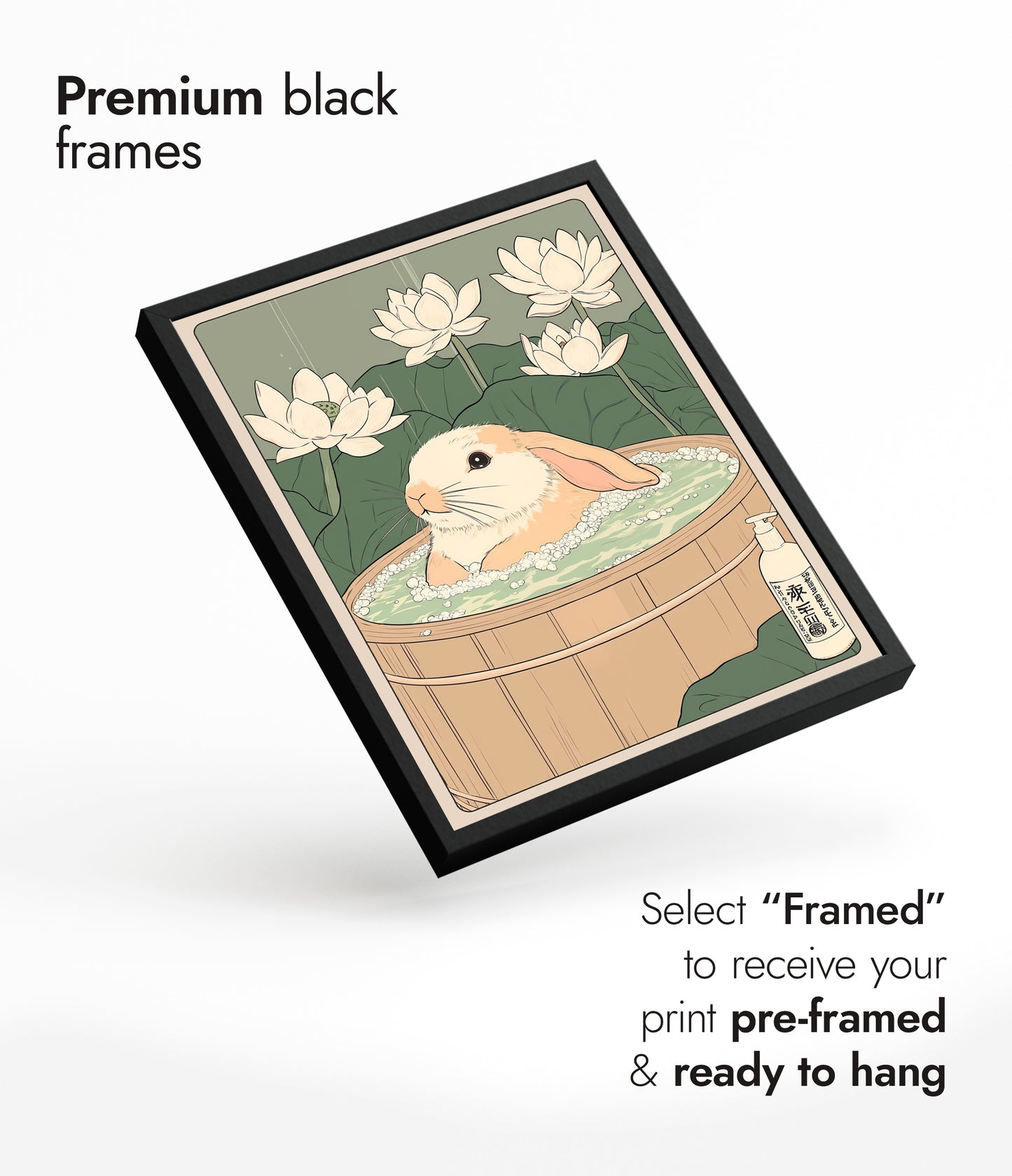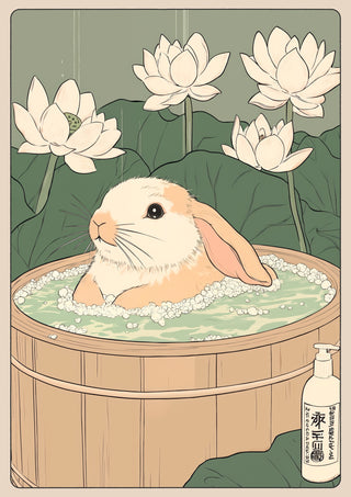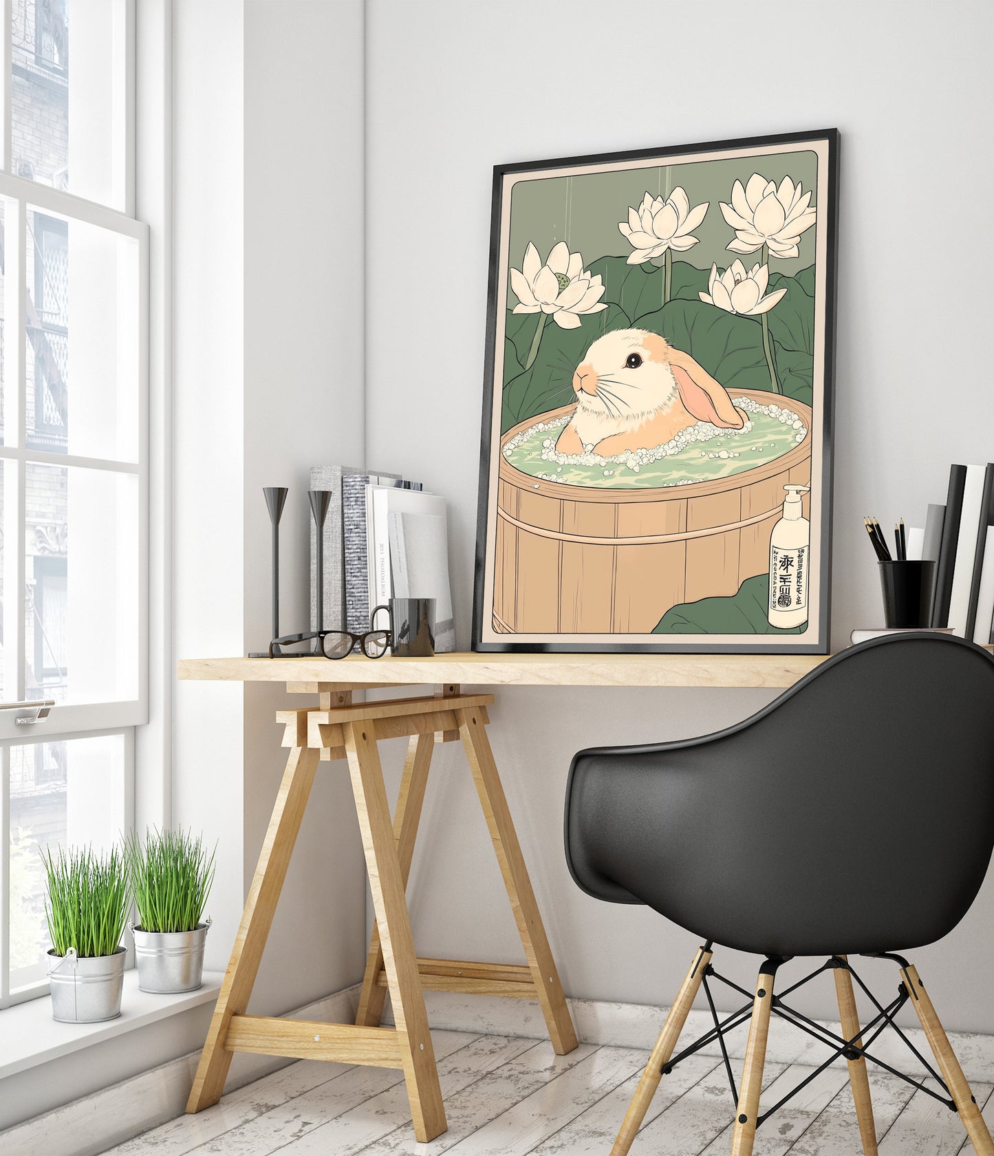 This art print titled "Bunny Rabbit Bathtime" features a charming rabbit enjoying a bath in a wooden tub surrounded by blooming lotus flowers. The illustration embraces a Japanese woodblock style, with muted beige tones enhancing its calming effect. Ideal for a poster display, this piece beautifully merges anime aesthetics with serene bath and animal themes. Perfect for enhancing bathroom decor.