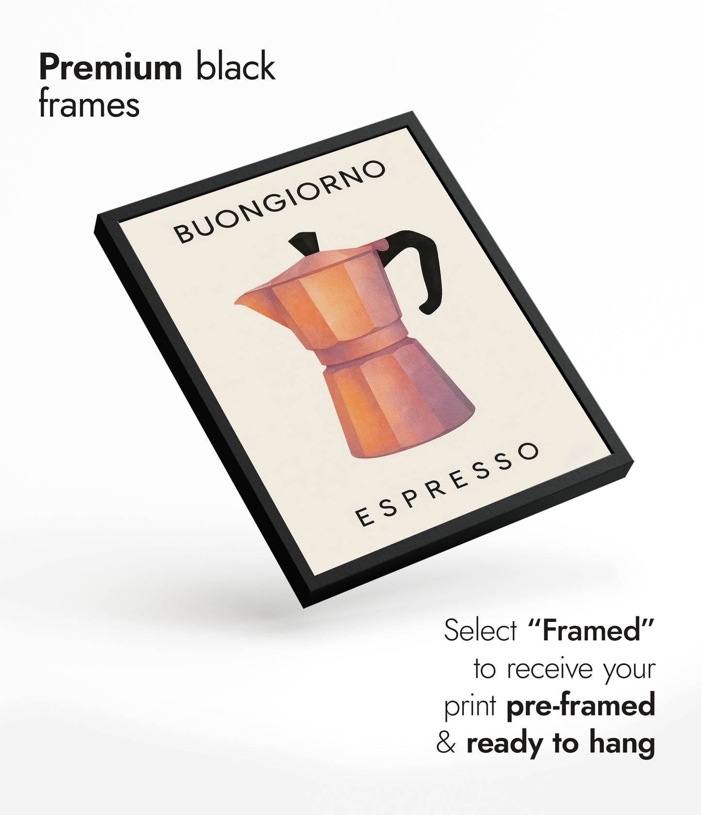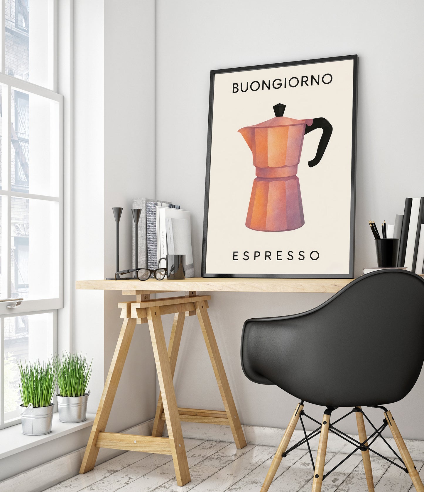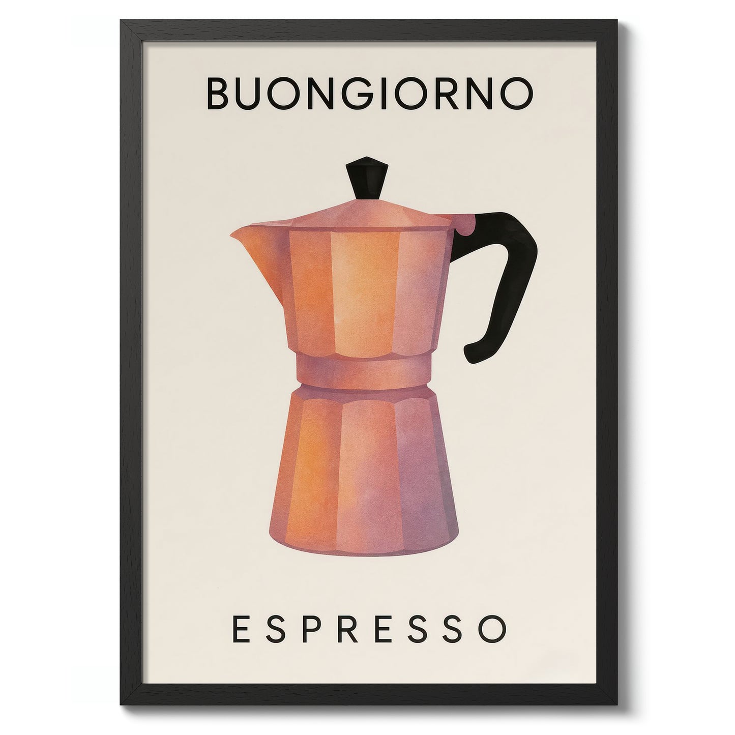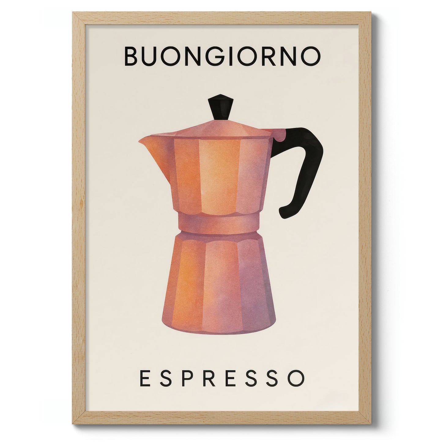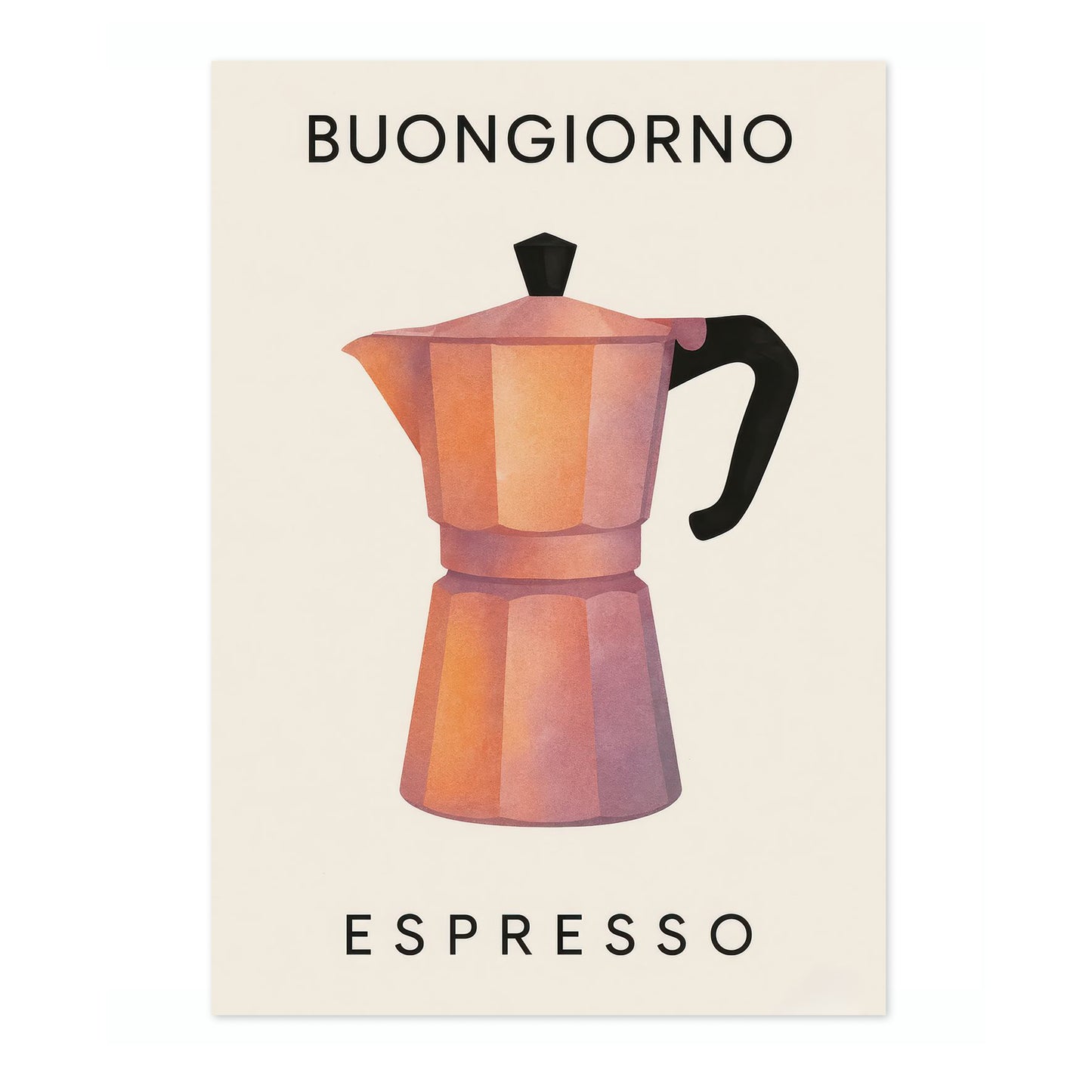 The "Buongiorno Espresso" poster features a stylized illustration of a classic moka pot, rendered in warm, sunlit tones against a beige backdrop. This modern graphic piece encapsulates the essence of Italian coffee culture, making it an ideal addition to any kitchen or café space. Perfect for coffee enthusiasts, its minimalist design complements contemporary interiors.