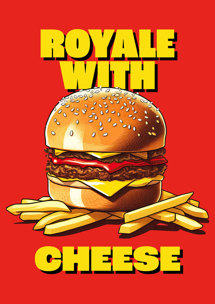 This vibrant pop art poster features a classic American diner favorite: a cheeseburger with fries. Set against a bold red background, it displays the text "Royale with Cheese" in striking yellow lettering. Ideal for those who love retro and graphic styles, this bright and funny illustration brings a touch of nostalgia to your space.