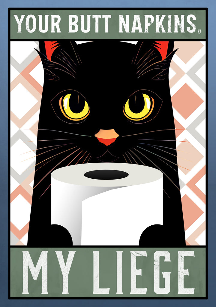 This humorous poster features a black cat with striking yellow eyes holding a roll of toilet paper, set against a playful, patterned background. The text reads, "Your Butt Napkins, My Liege," adding a whimsical and fun touch to any bathroom. Perfect for cat lovers and those who appreciate bathroom humor, this illustration blends cartoon style with a cheeky message.