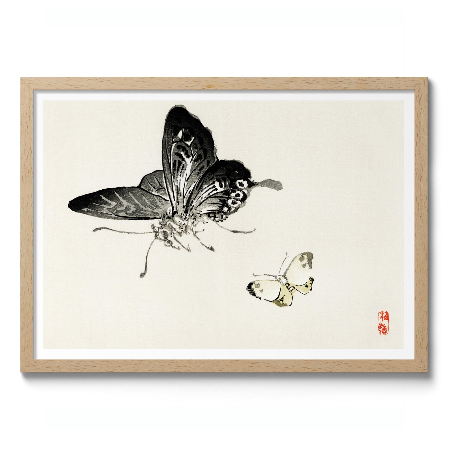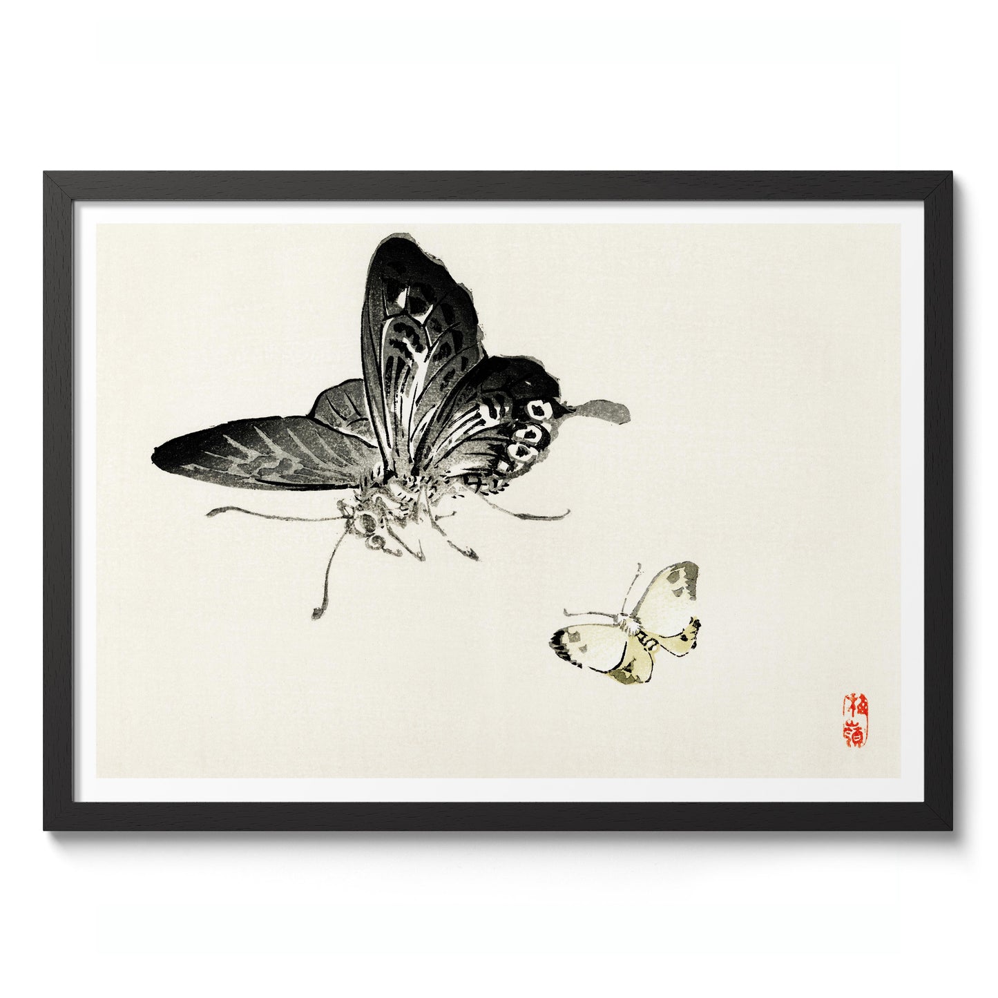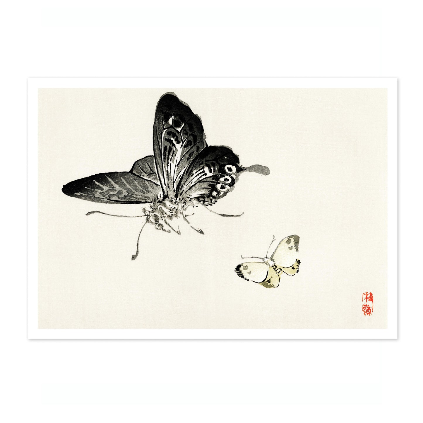 This "Butterflies" poster by Kono Bairei captures two intricately detailed butterflies in a traditional Japanese painting style. The minimalist composition features delicate brush strokes that highlight the butterflies' elegance against a serene, light background. Ideal for lovers of traditional art and nature themes, this landscape poster exemplifies Bairei's mastery in portraying the subtle beauty of insects.