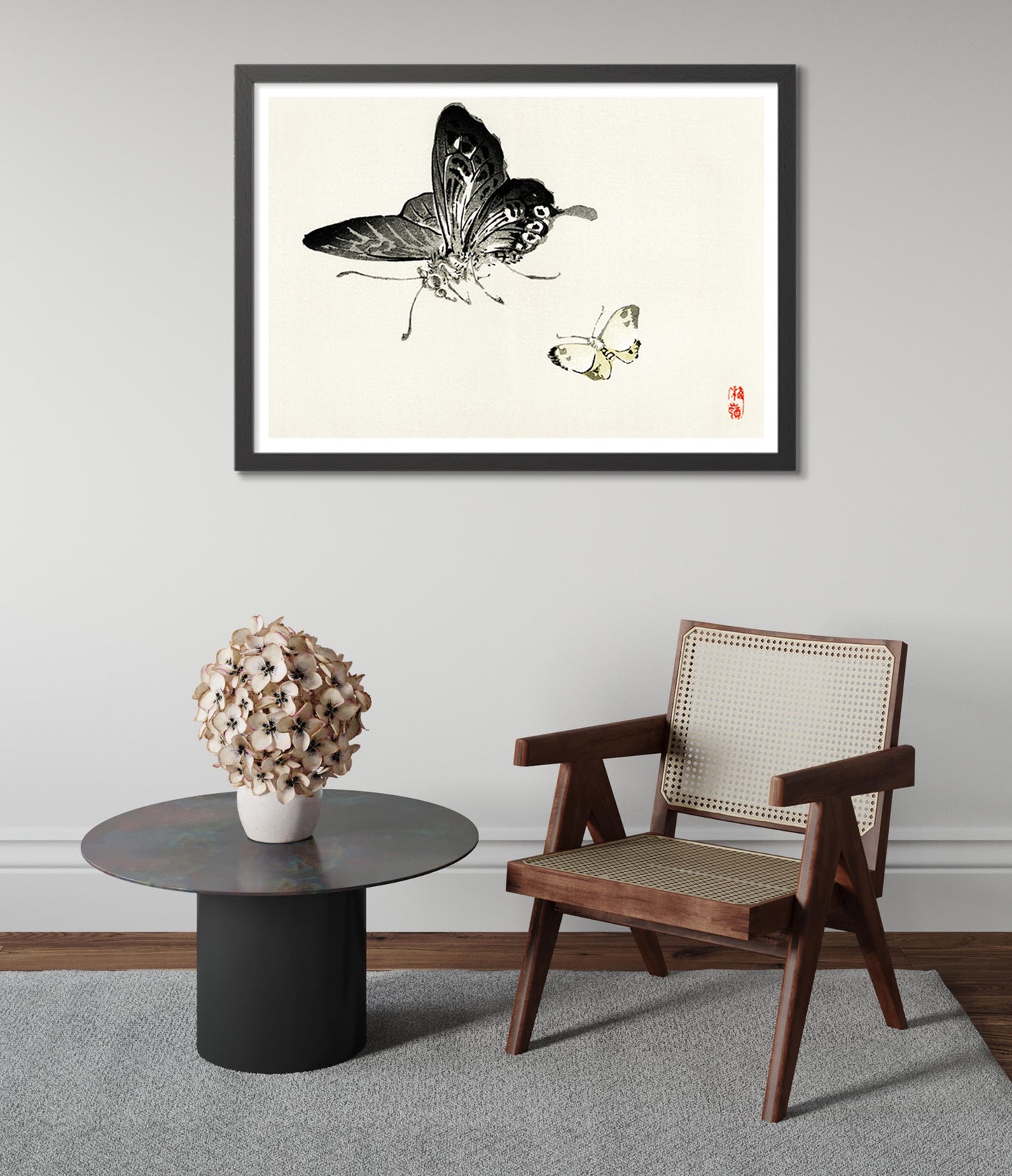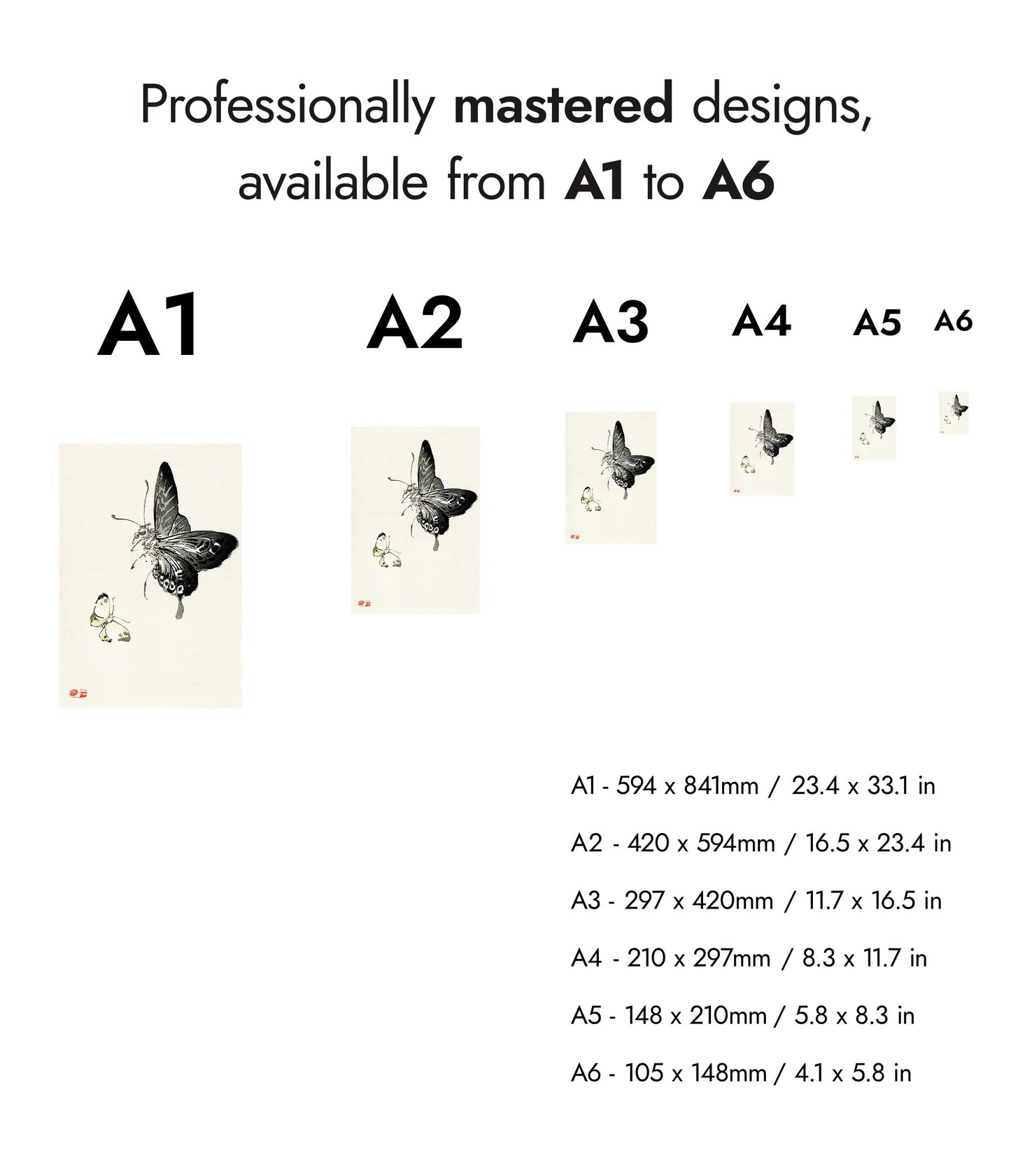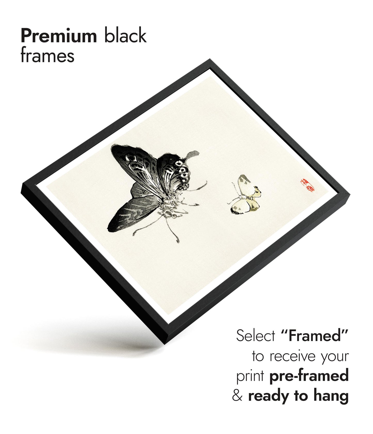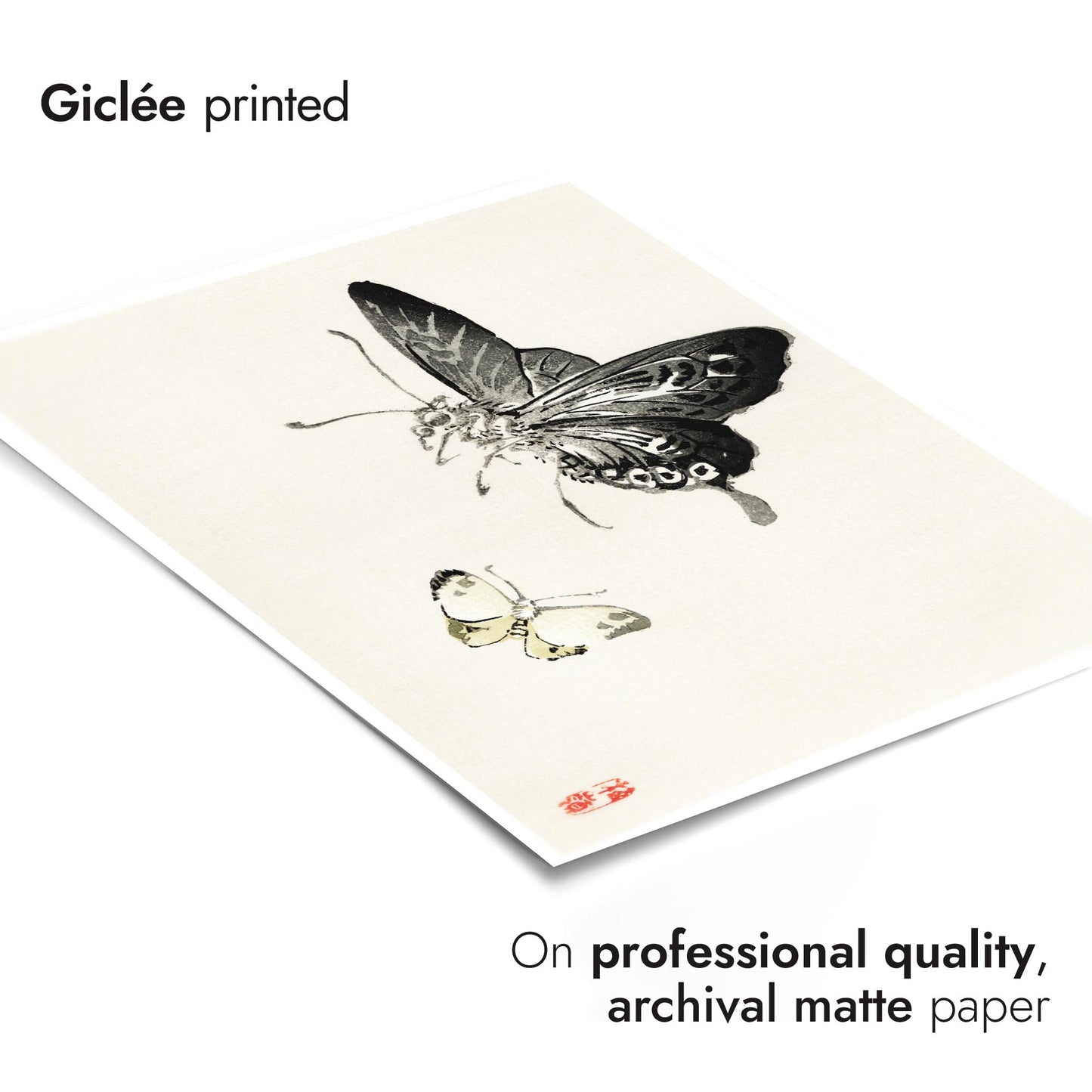 This "Butterflies" poster by Kono Bairei captures two intricately detailed butterflies in a traditional Japanese painting style. The minimalist composition features delicate brush strokes that highlight the butterflies' elegance against a serene, light background. Ideal for lovers of traditional art and nature themes, this landscape poster exemplifies Bairei's mastery in portraying the subtle beauty of insects.