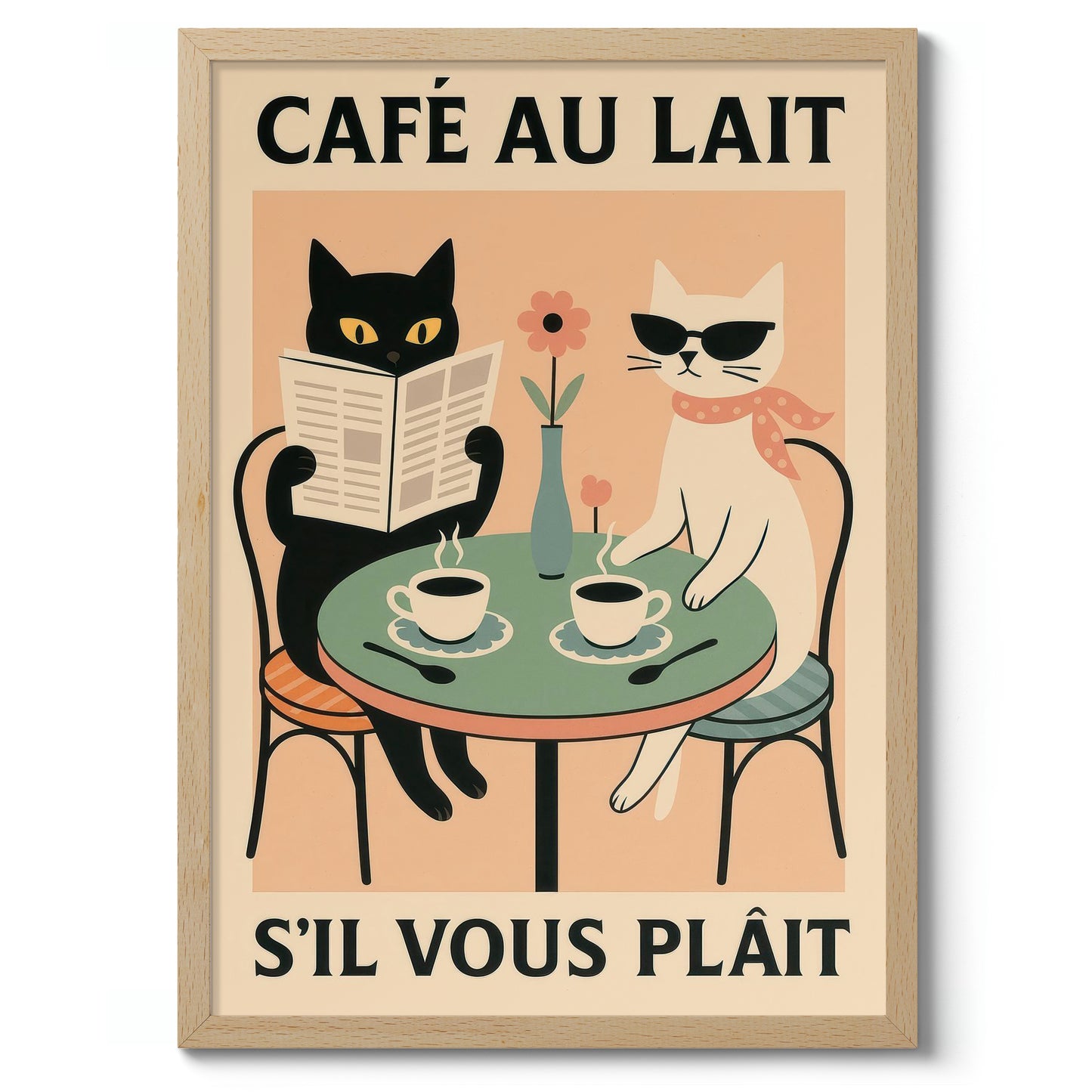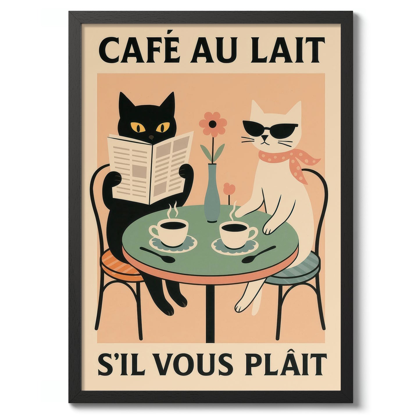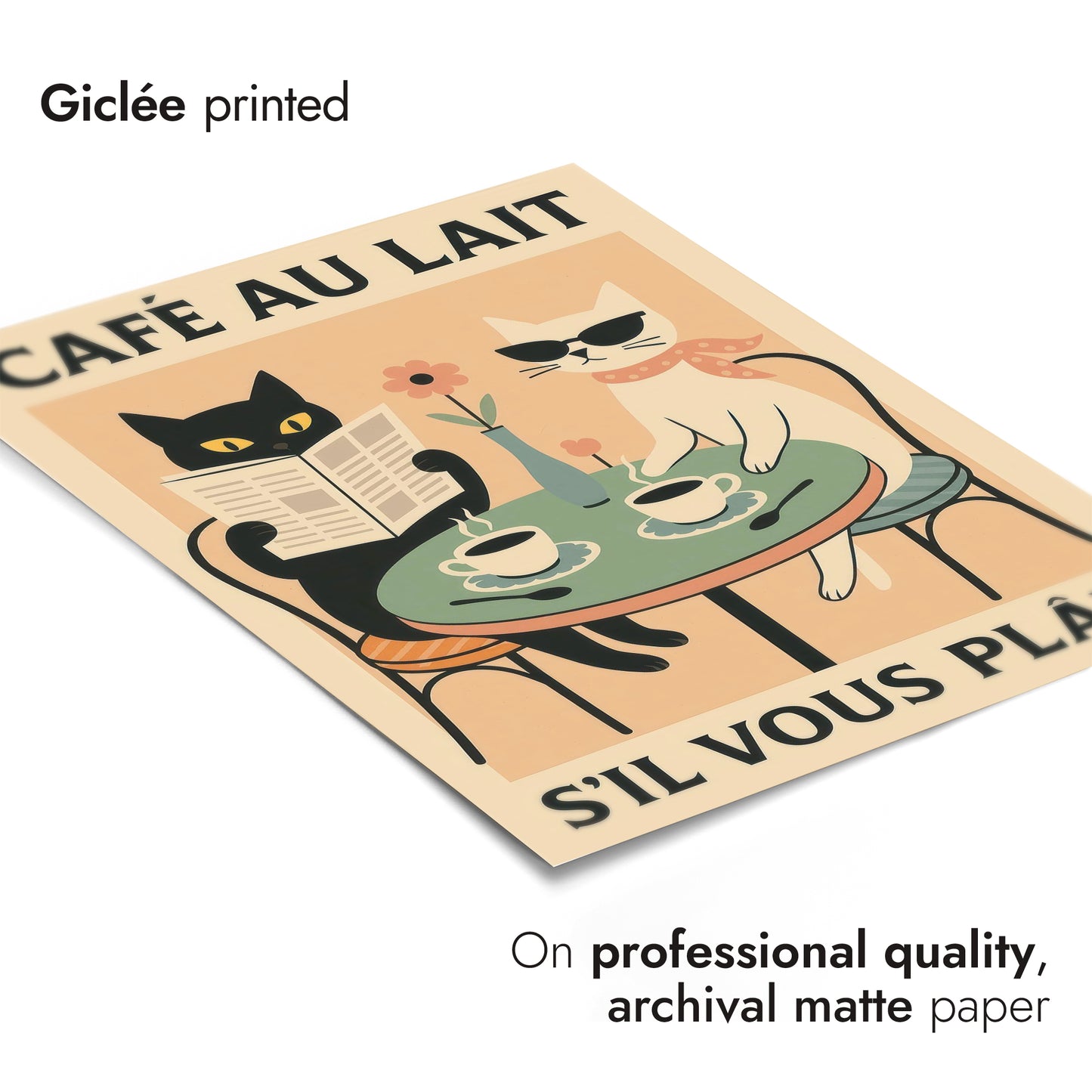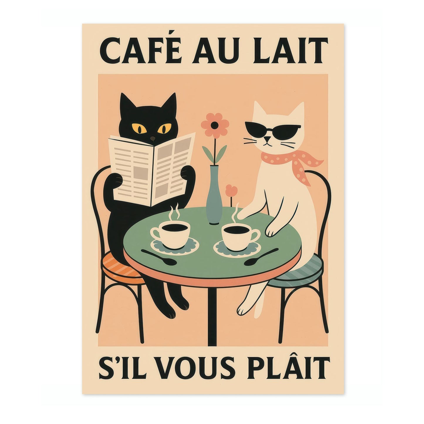 This charming poster features two whimsical cats enjoying a café au lait at a quaint French bistro table. One reads a newspaper, while the other donning sunglasses, all against a minimalist backdrop. With its playful use of typography and illustration, this art print perfectly combines elements of animal art, coffee culture, and French charm, enhancing any space with a touch of whimsy.